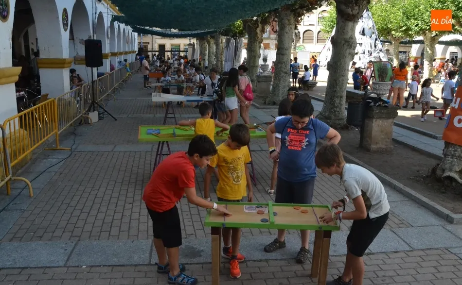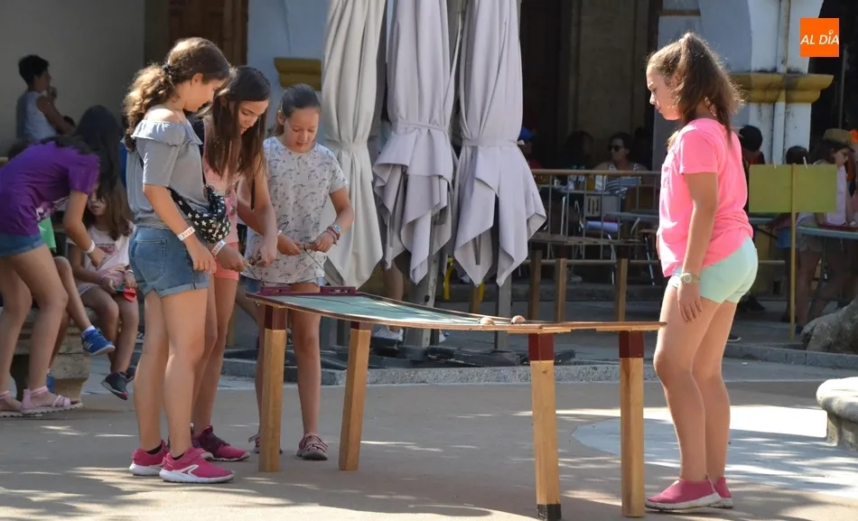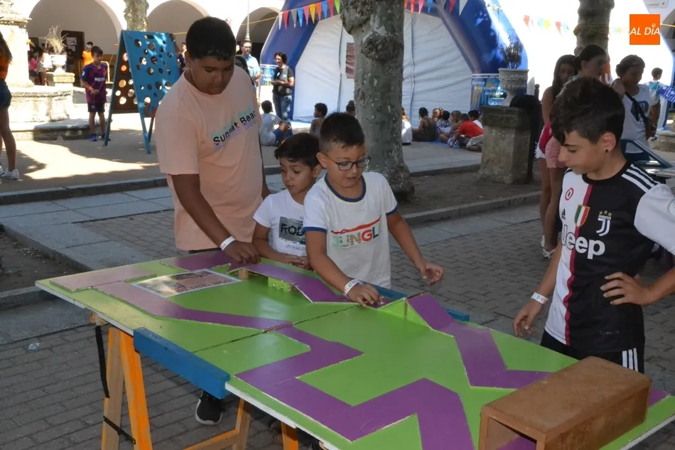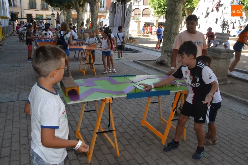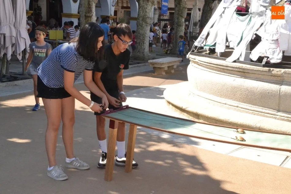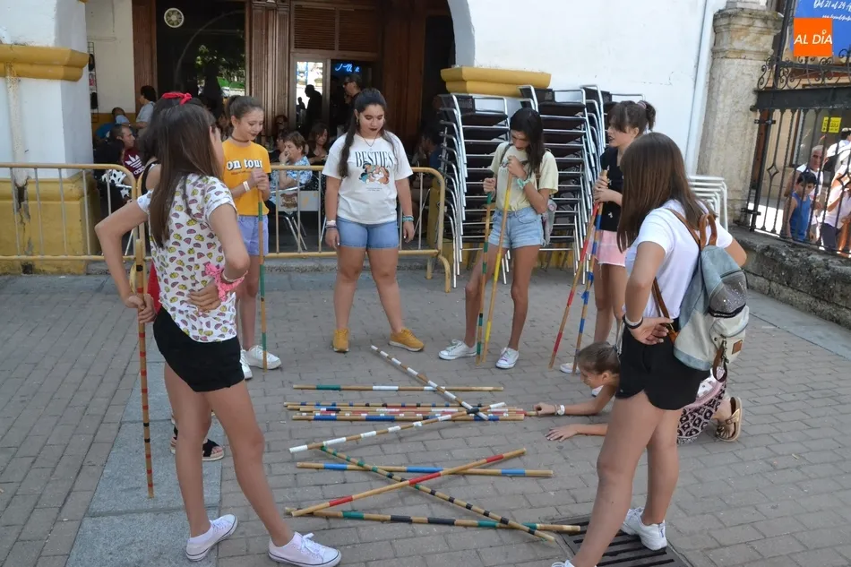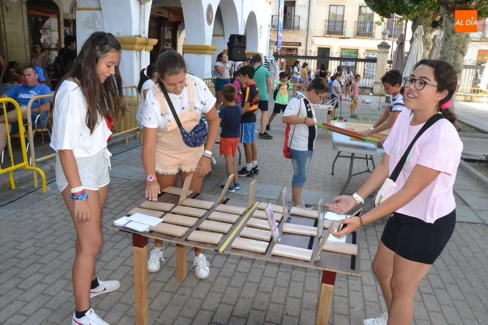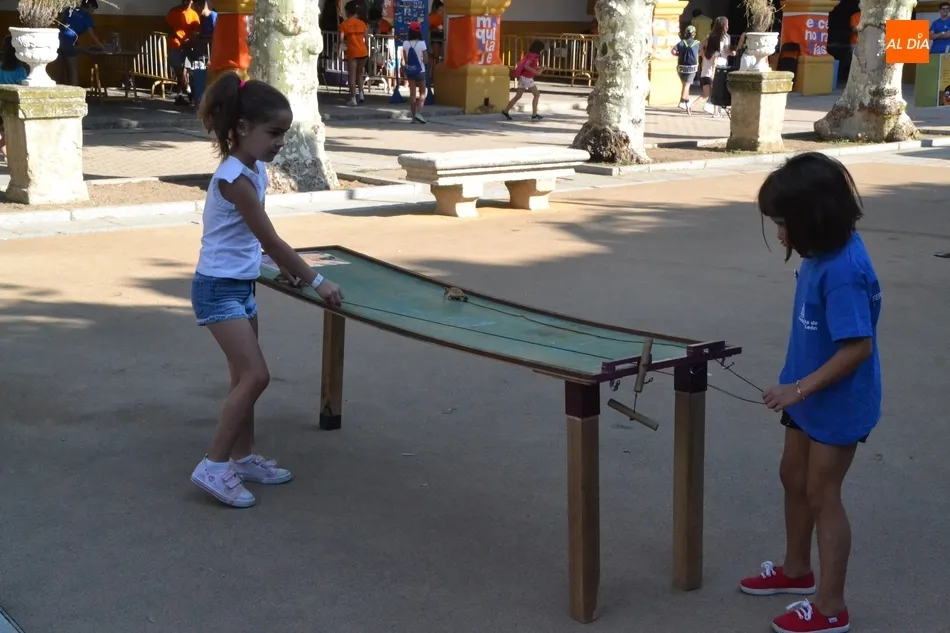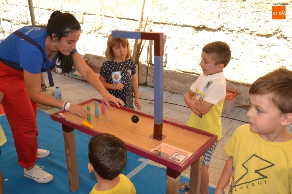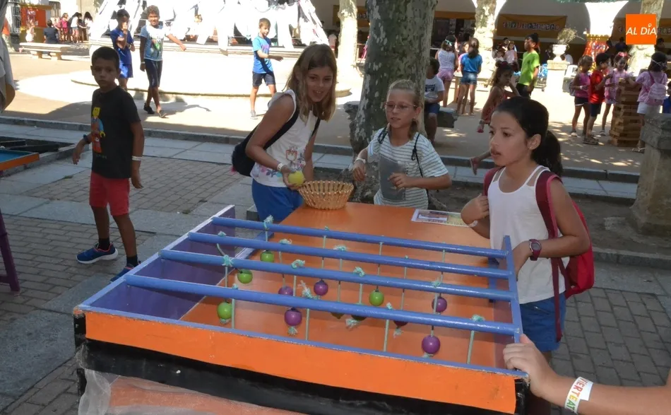 Como ha ocurrido todos los días, los chavales pudieron moverse libremente por todas las actividades preparadas (con un cierto control para que los chavales estén repartidos y no haya actividades saturadas y otras sin nadie), divididas en dos grandes bloques, los clásicos talleres por los soportales, y los elementos de ingenio que ha traído la compañía Kamaru Teatro bajo el nombre de Leña al juego.