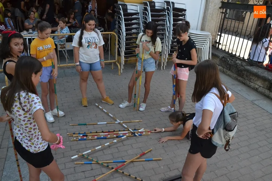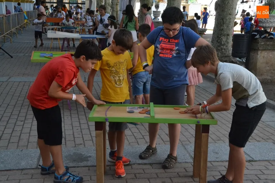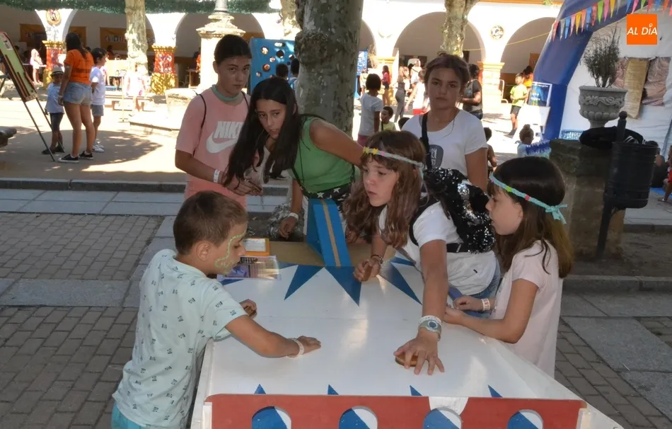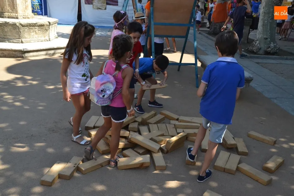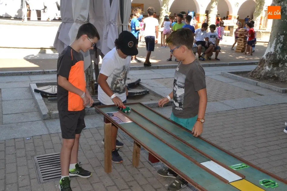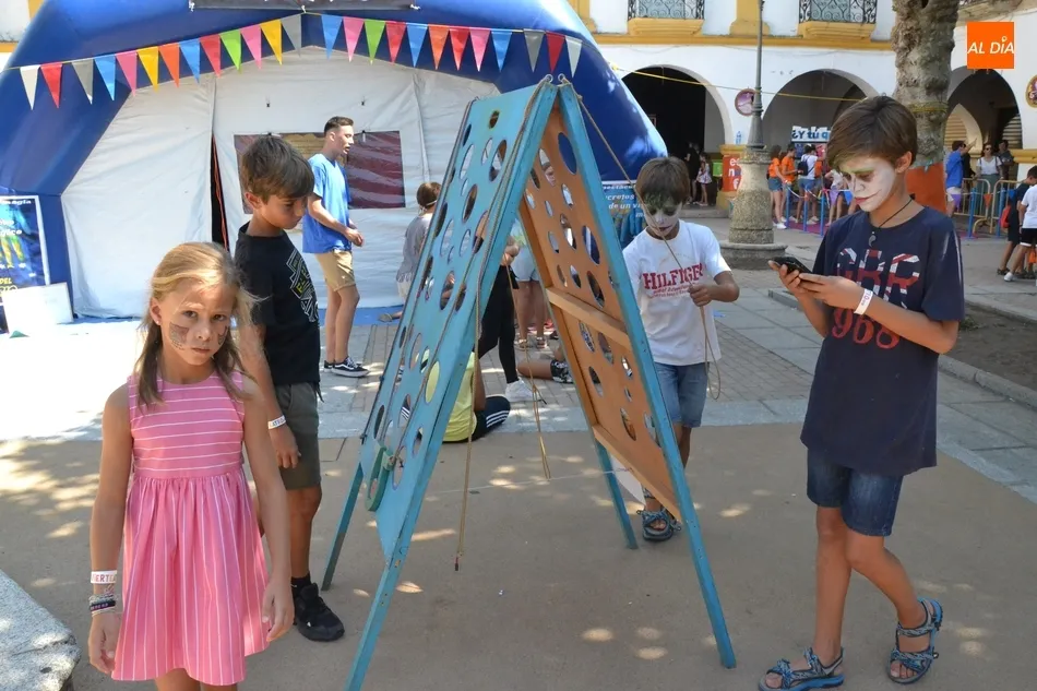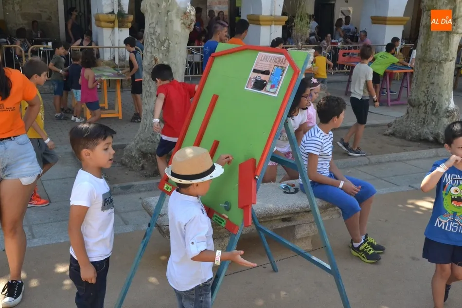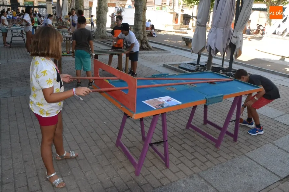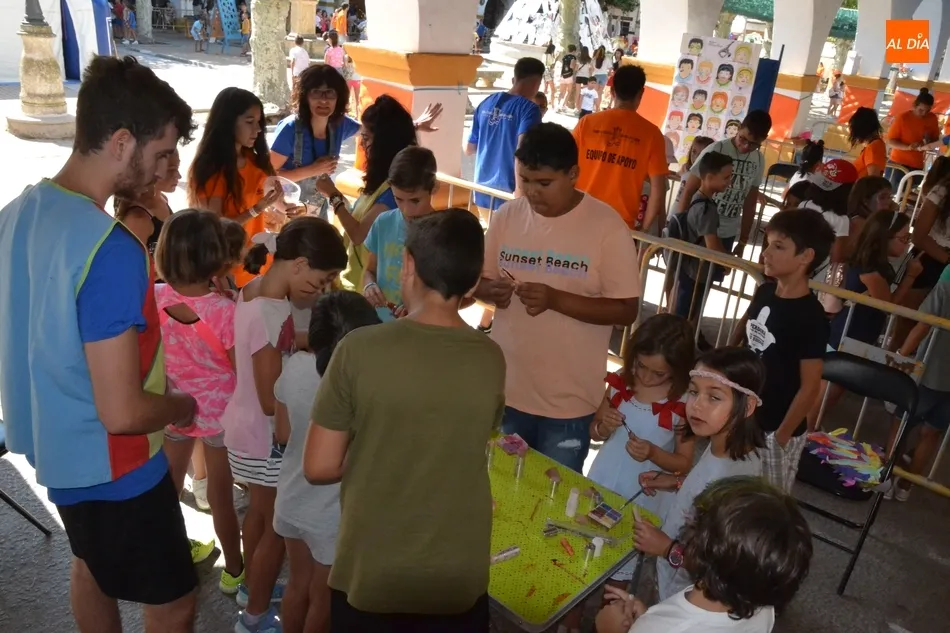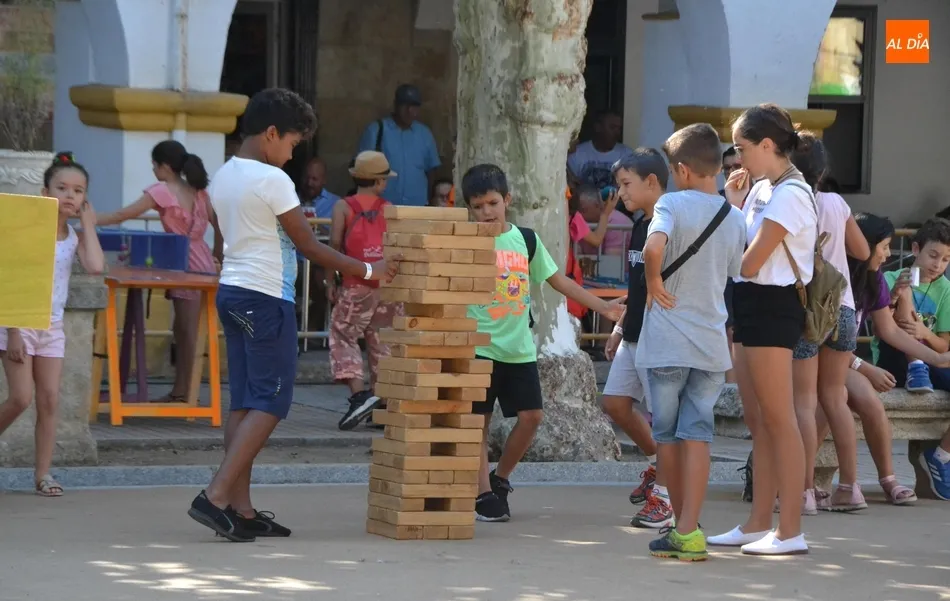 Como ha ocurrido todos los días, los chavales pudieron moverse libremente por todas las actividades preparadas (con un cierto control para que los chavales estén repartidos y no haya actividades saturadas y otras sin nadie), divididas en dos grandes bloques, los clásicos talleres por los soportales, y los elementos de ingenio que ha traído la compañía Kamaru Teatro bajo el nombre de Leña al juego.