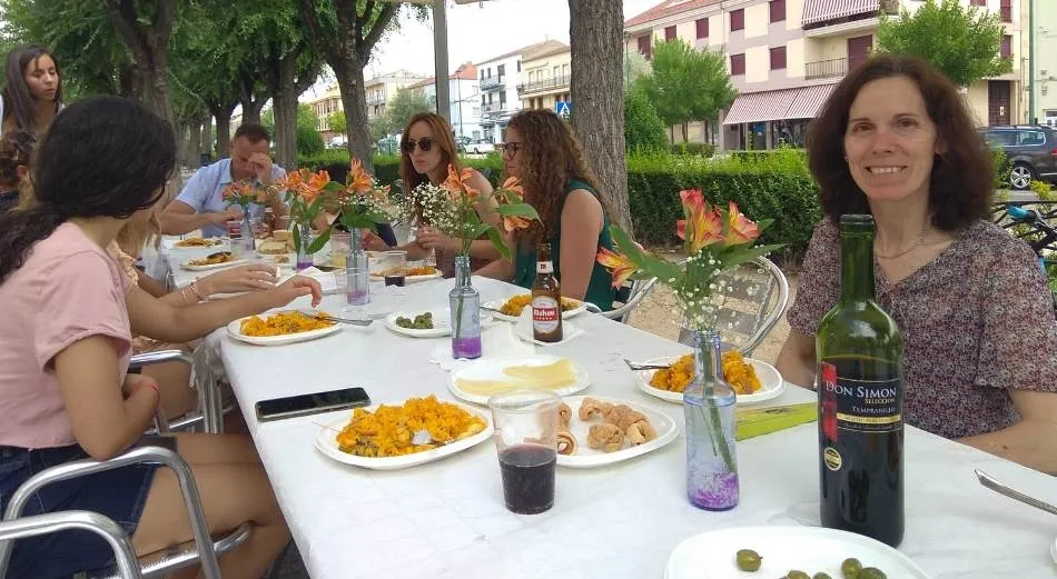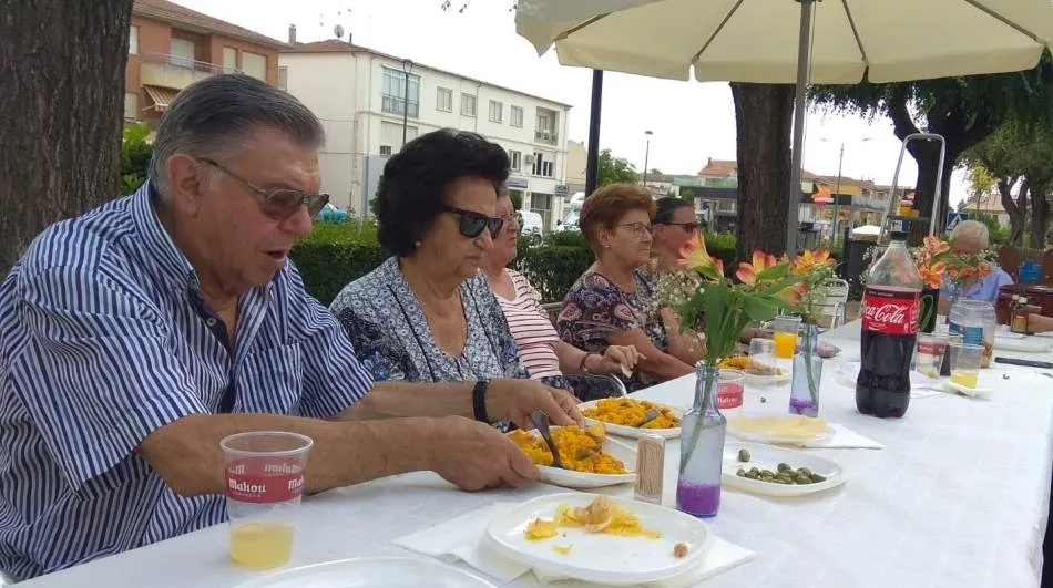 A esta jornada de confraternización vecinal que se ha institucionalizado en el último domingo de cada mes de agosto, asistieron varios de estos vecinos fundadores, junto a sus hijos y nietos. En total, se congregaron unas treinta personas en la zona situada frente a los bares La Oficina y Tres Columnas, que fue la primera que se construyó en el barrio. En esa zona se llevó a cabo la tradicional comida conjunta, consistente en una paellada, que dio paso a una sobremesa con café, pasteles y gran variedad de bebidas, mientras sonaba música solicitada por los vecinos.