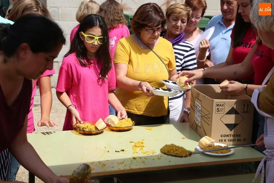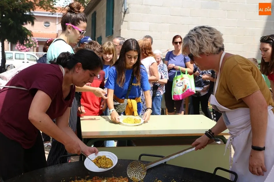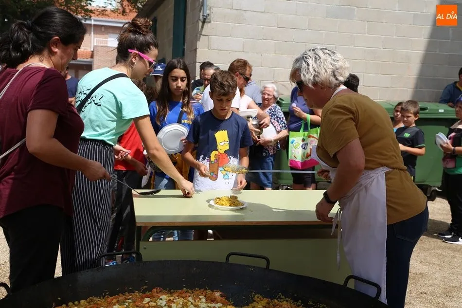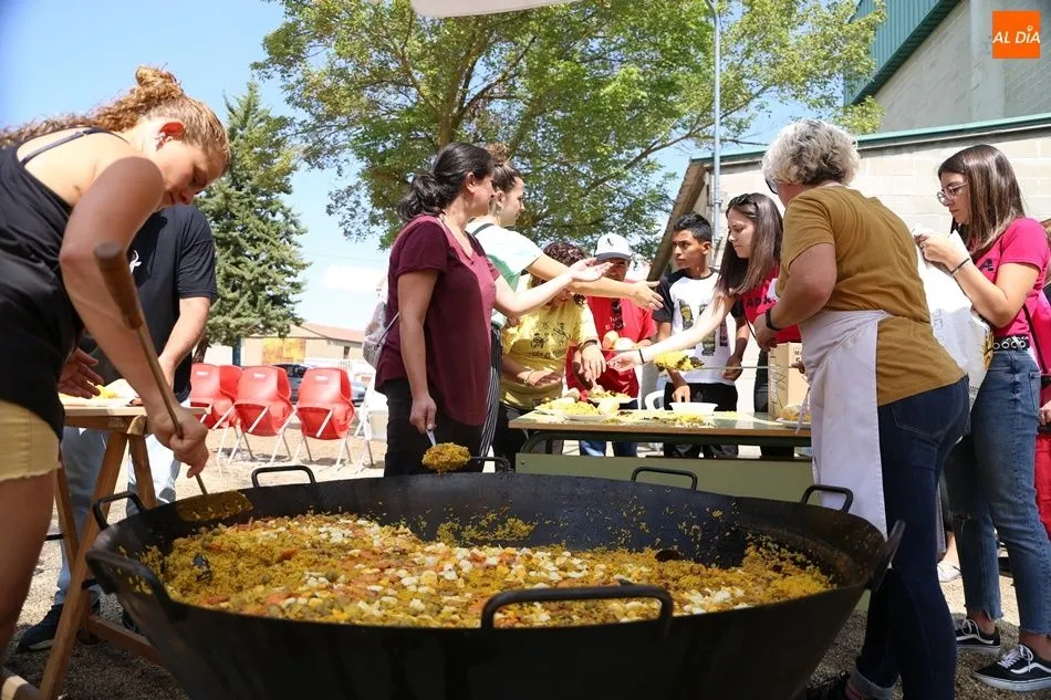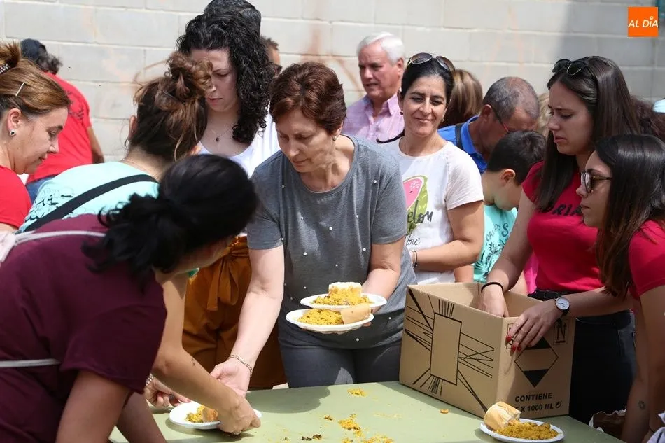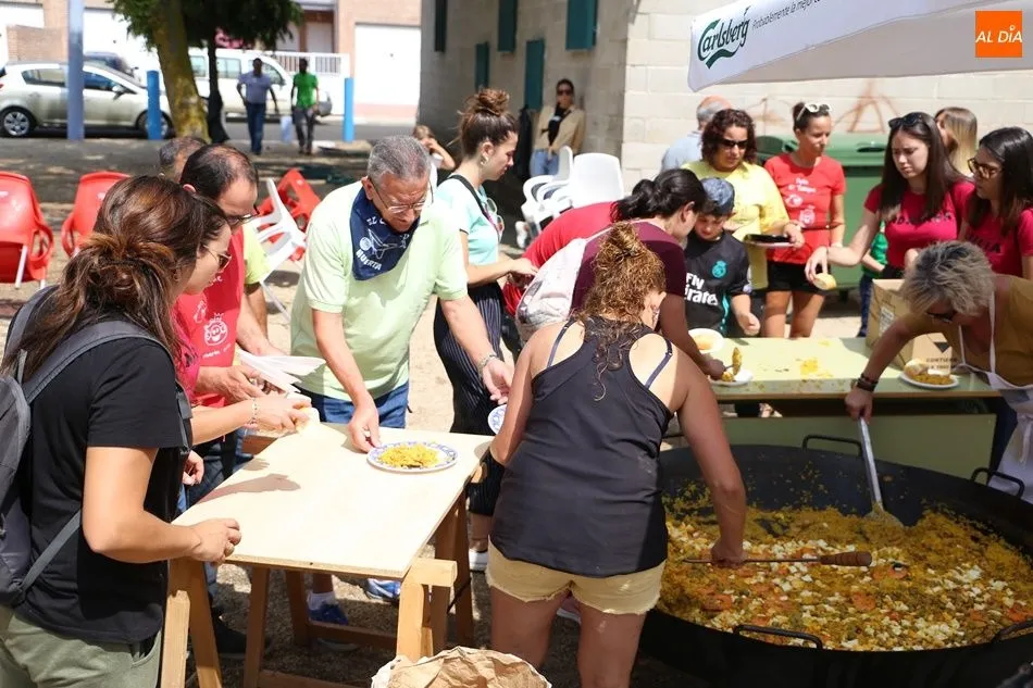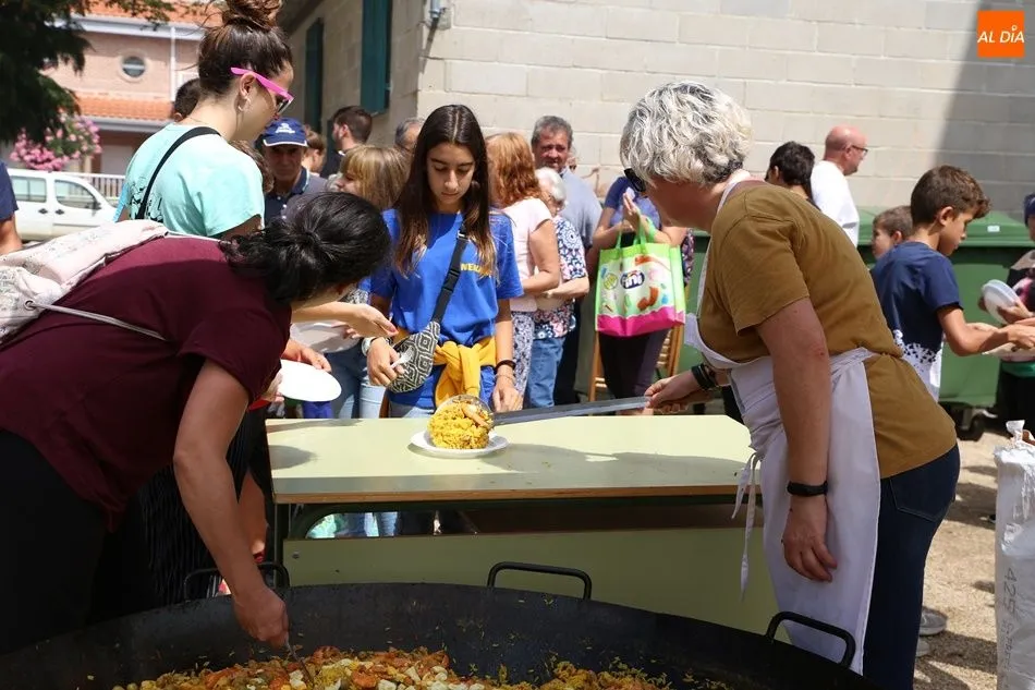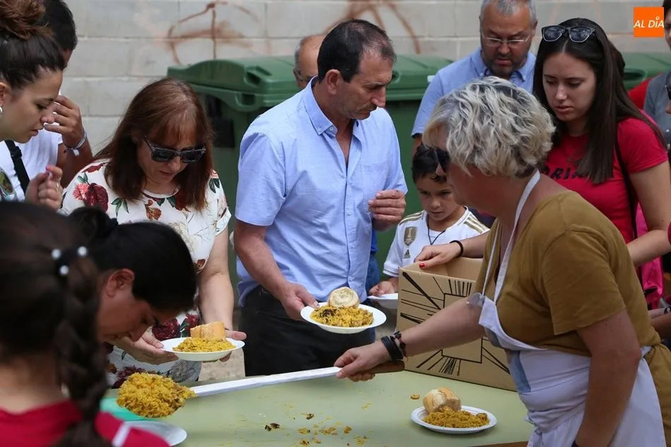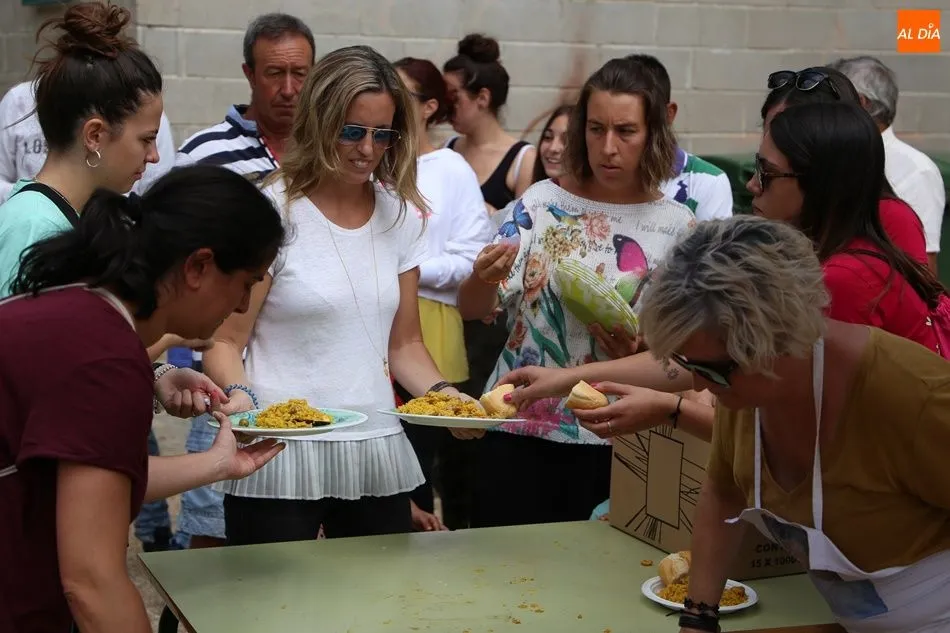 El parque del pabellón municipal acogió el reparto de la paella, que fue degustada en las mesas instaladas por grupos de familiares y amigos en el parque y dentro del pabellón. Las integrantes de las peñas Descontrólate y Las Revoltosas se ocuparon de vender los tiques y colaboraron en el reparto de la comida.