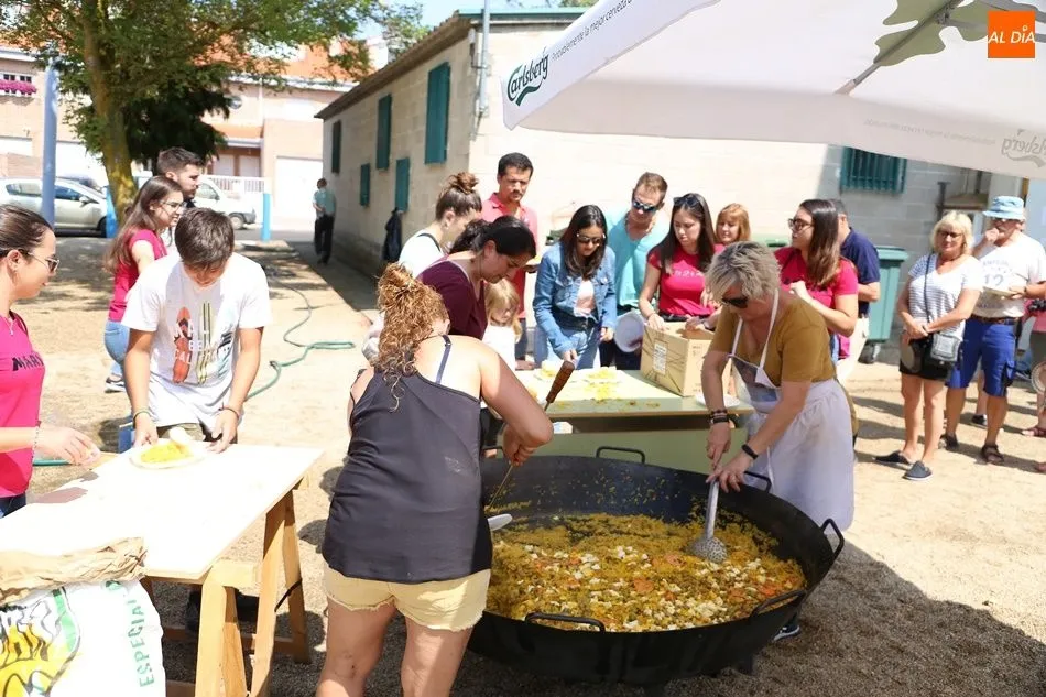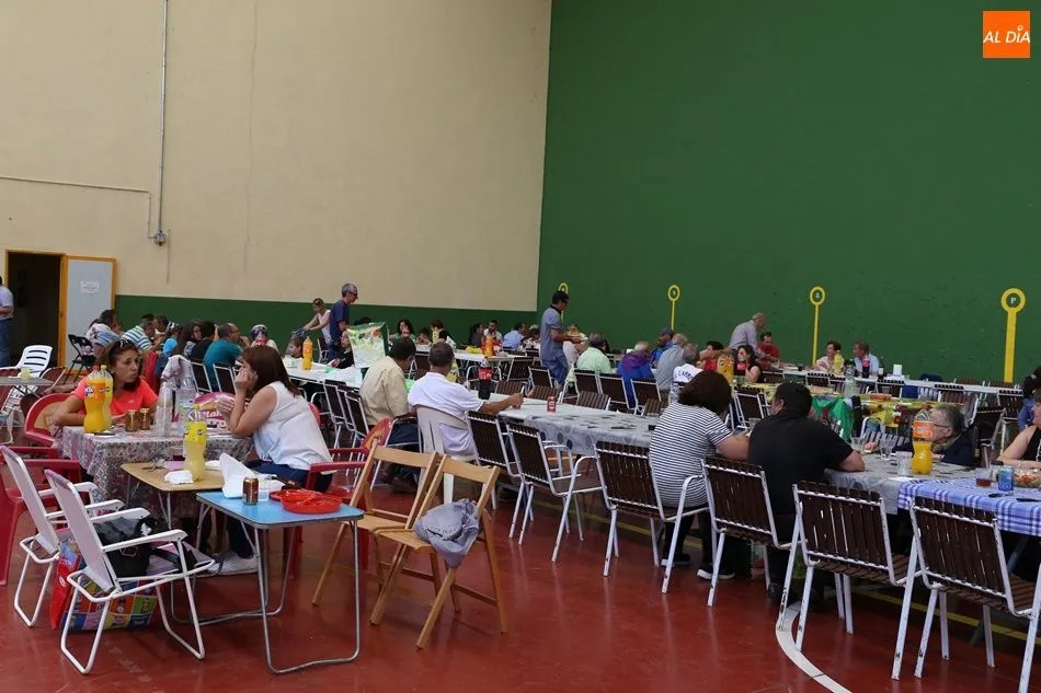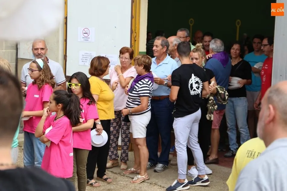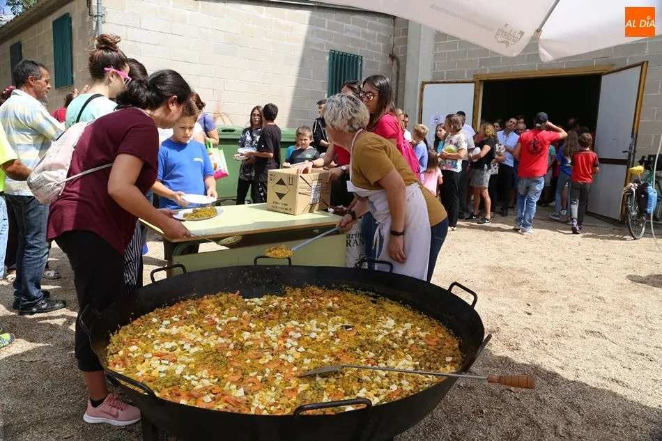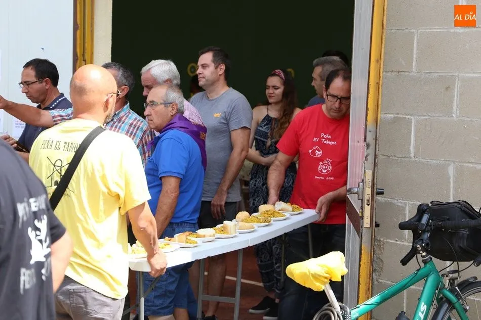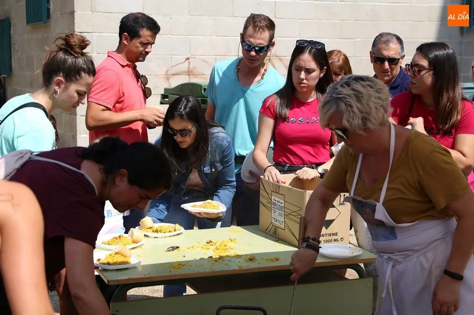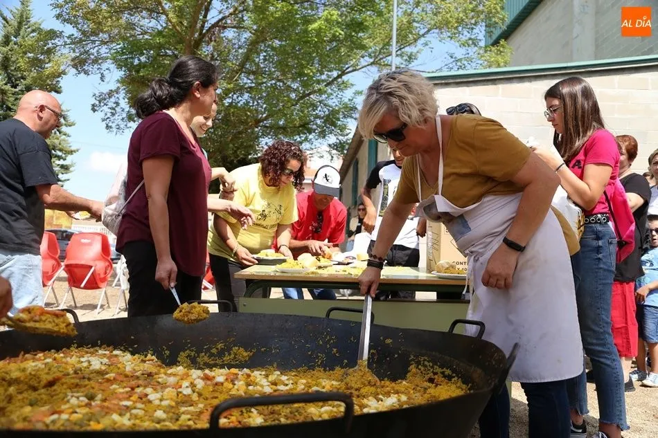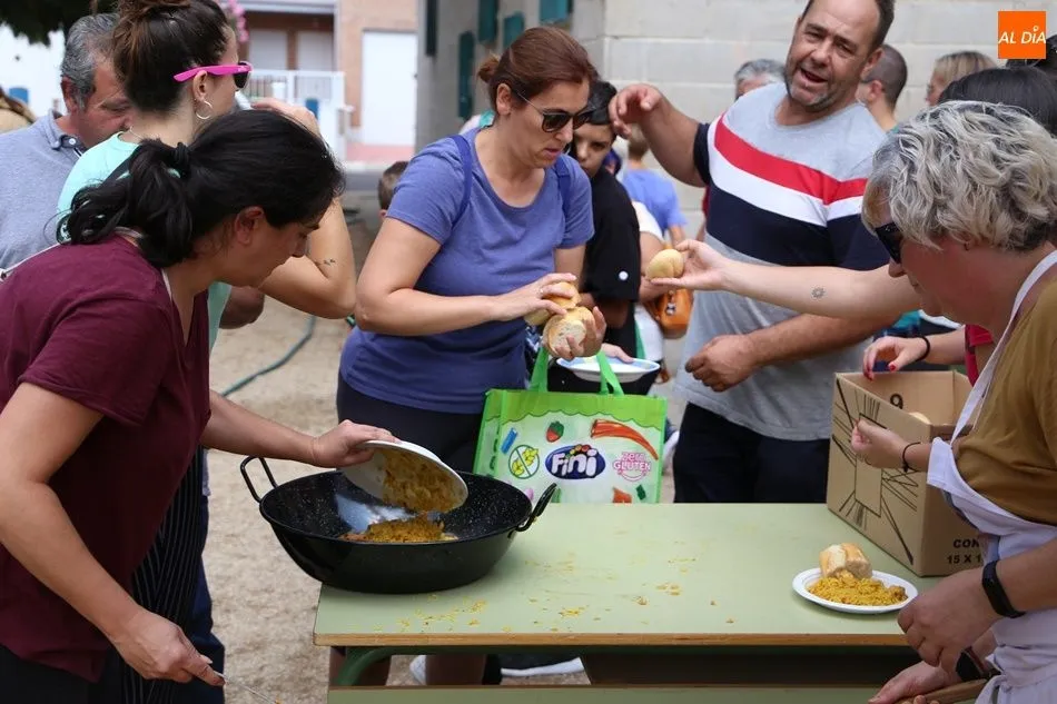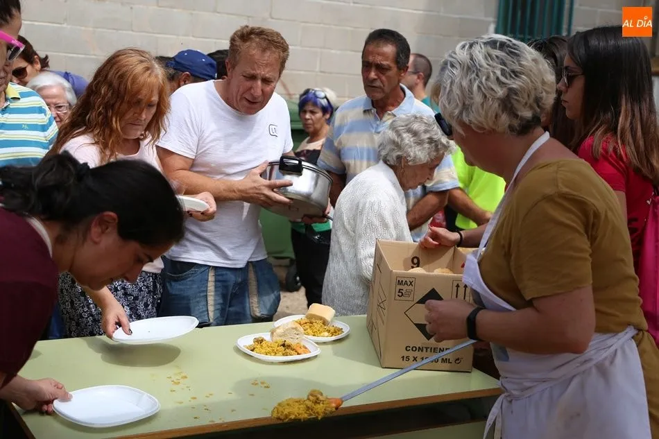 El parque del pabellón municipal acogió el reparto de la paella, que fue degustada en las mesas instaladas por grupos de familiares y amigos en el parque y dentro del pabellón. Las integrantes de las peñas Descontrólate y Las Revoltosas se ocuparon de vender los tiques y colaboraron en el reparto de la comida.