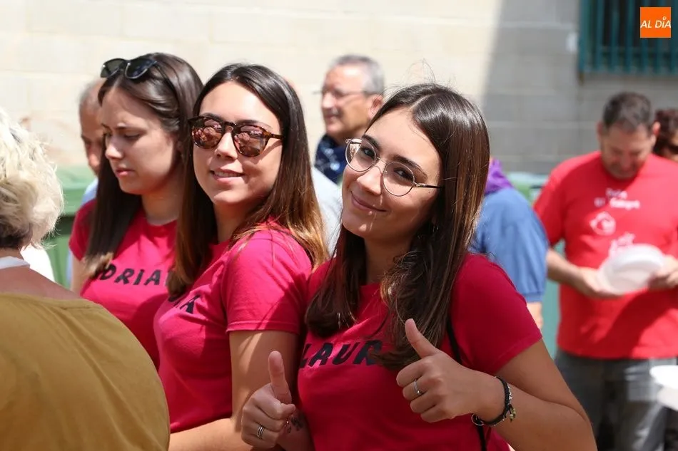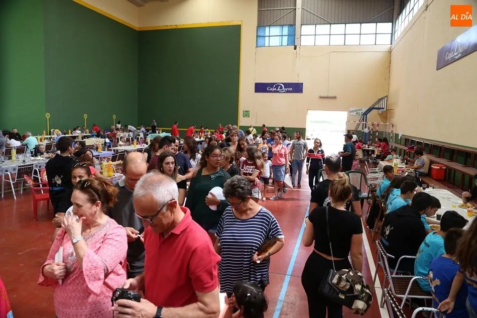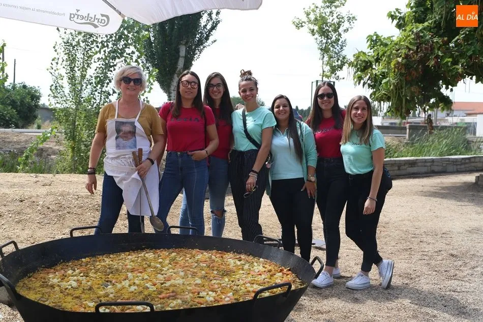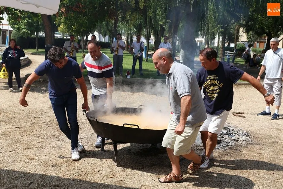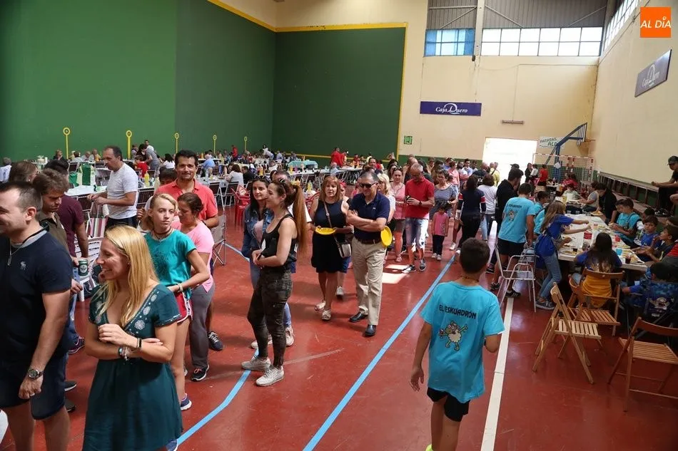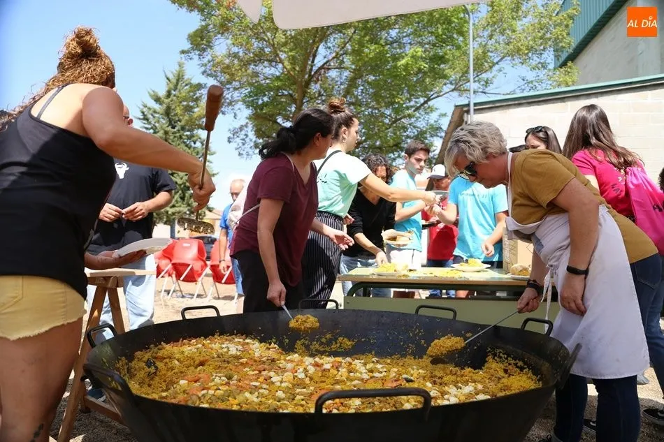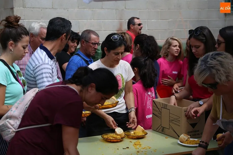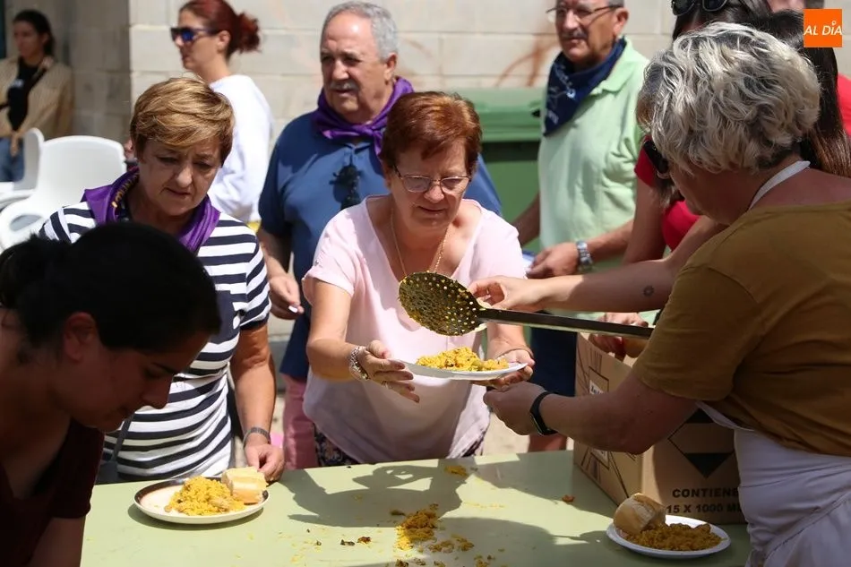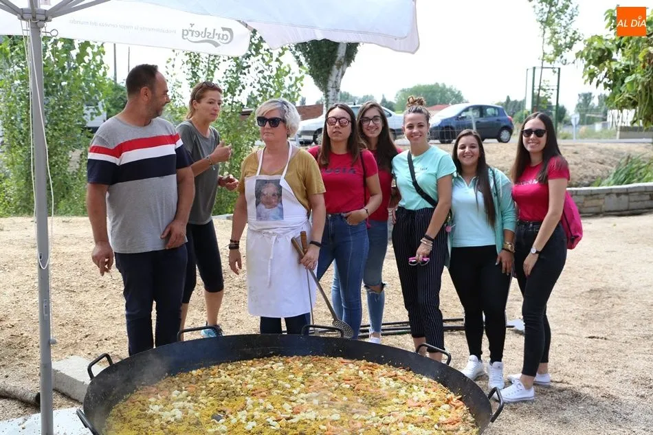 El parque del pabellón municipal acogió el reparto de la paella, que fue degustada en las mesas instaladas por grupos de familiares y amigos en el parque y dentro del pabellón. Las integrantes de las peñas Descontrólate y Las Revoltosas se ocuparon de vender los tiques y colaboraron en el reparto de la comida.