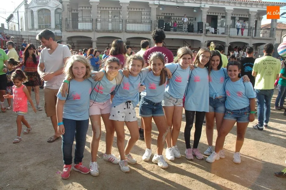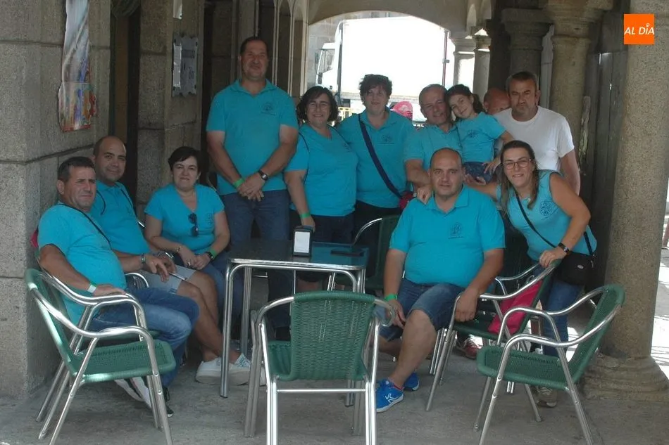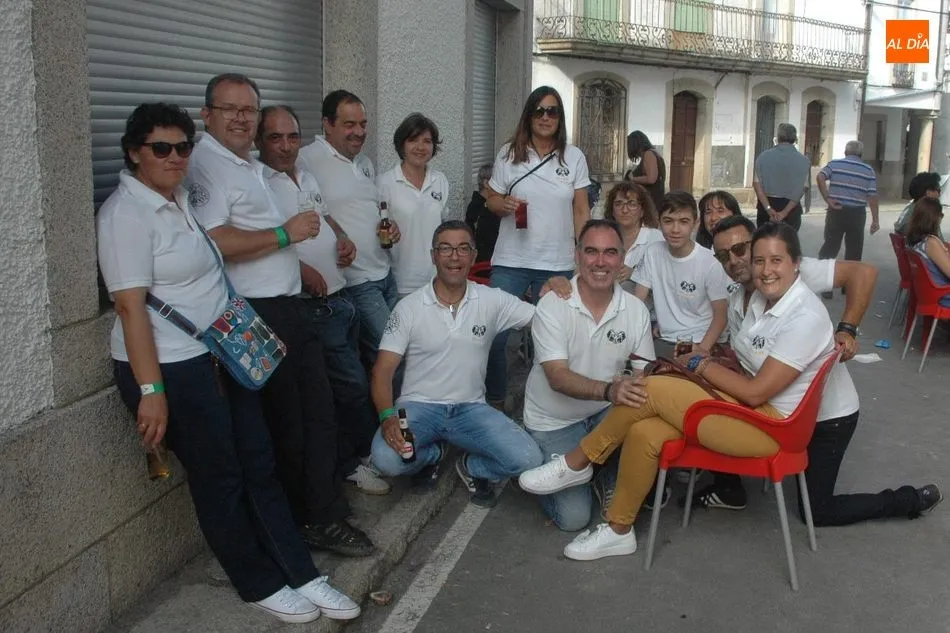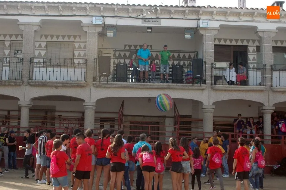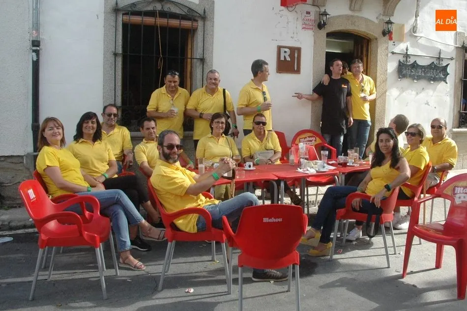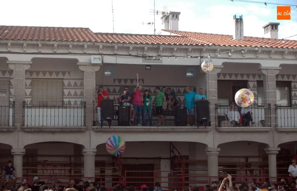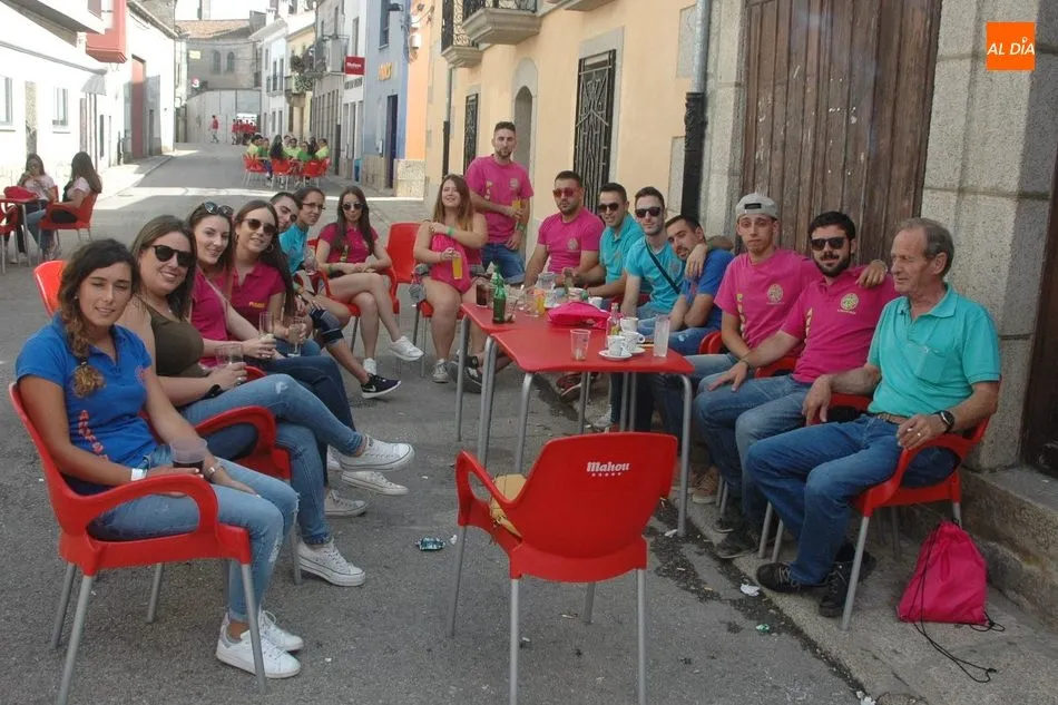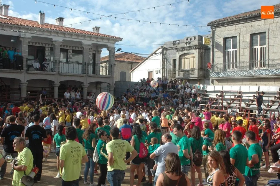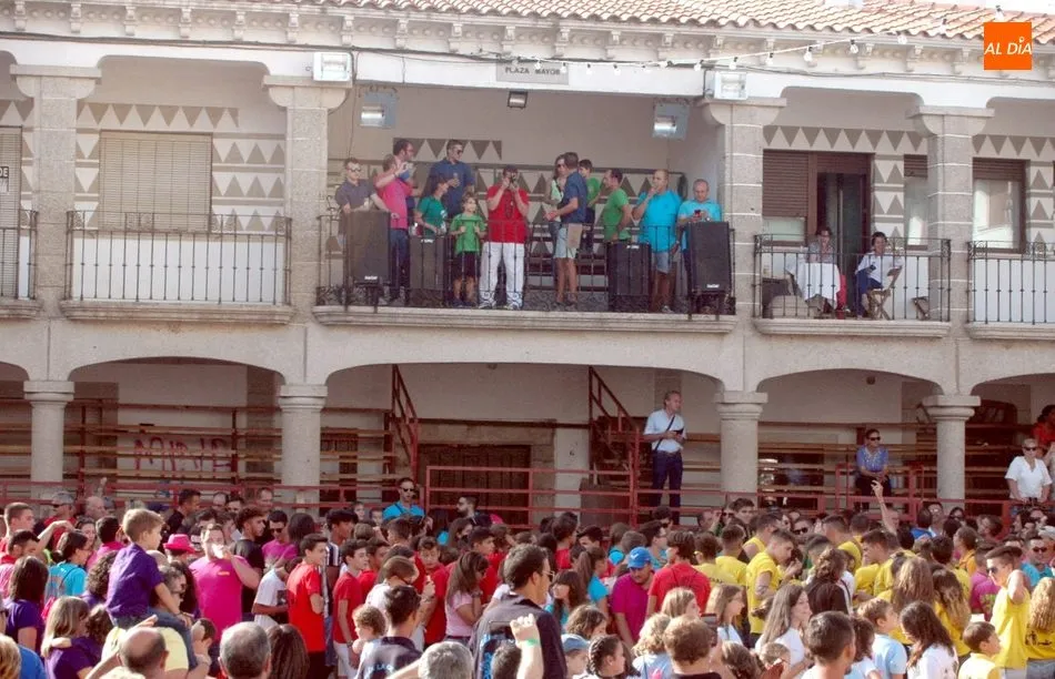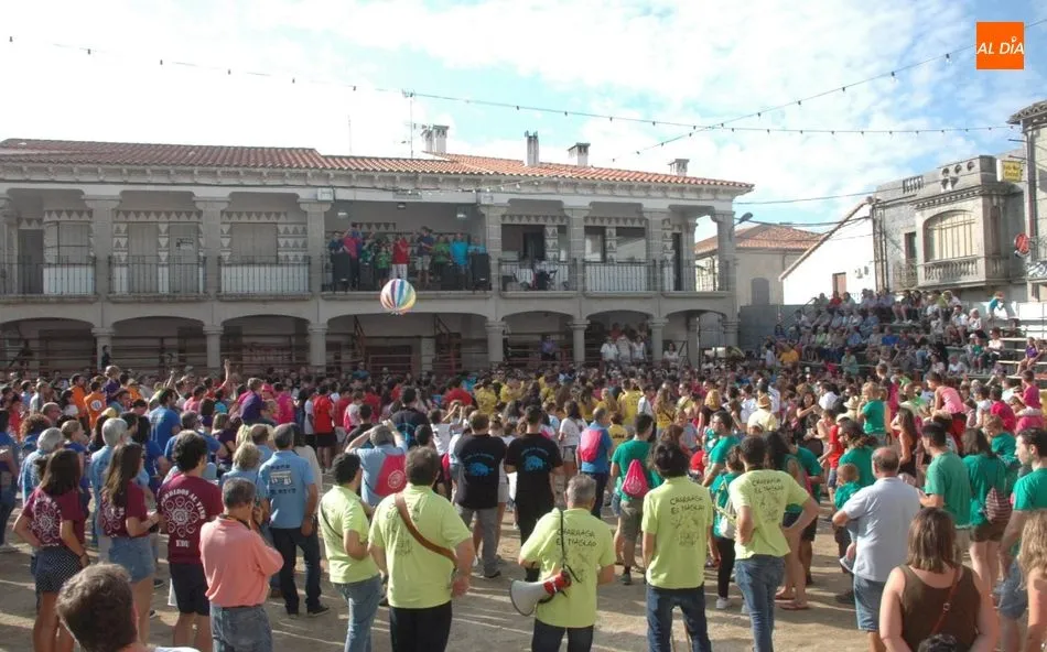 La plaza de Villavieja de Yeltes se convirtió este lunes en un mosaico de colores durante la concentración de peñas protagonistas del lanzamiento del chupinazo oficializado por varios miembros de la Corporación municipal.