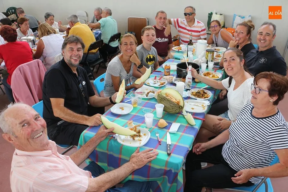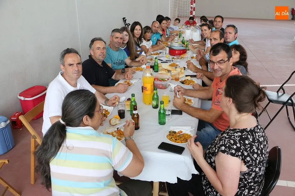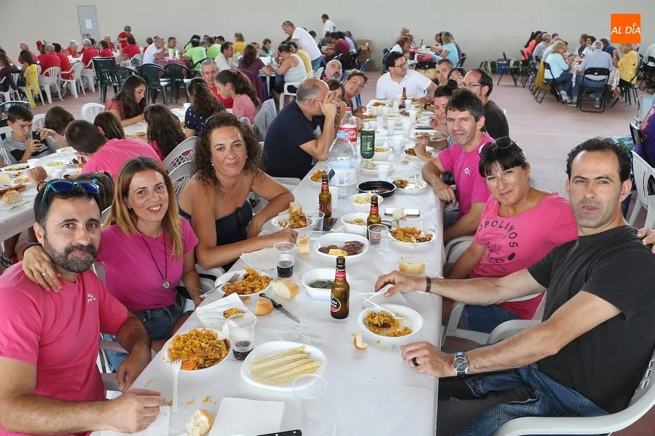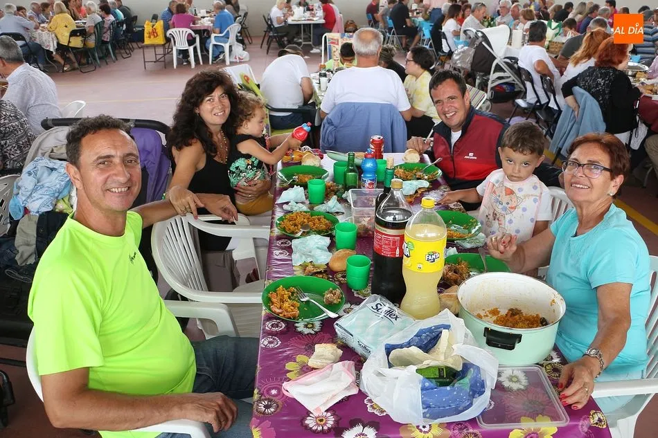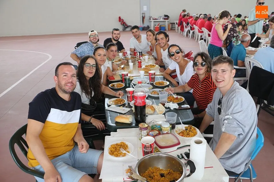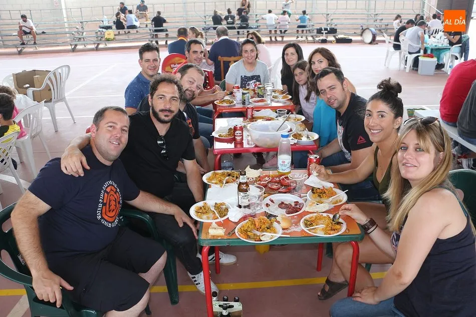 l tiempo y la amenaza de lluvia llevó al Ayuntamiento a reubicar la comida en el pabellón municipal de deportes Hermenegildo Merino Álvarez. Allí se repartieron las raciones de paella al son de la charanga, con helado de postre para los cientos de asistentes.