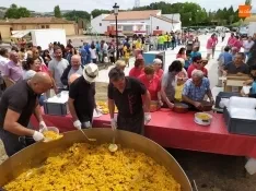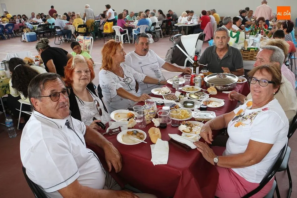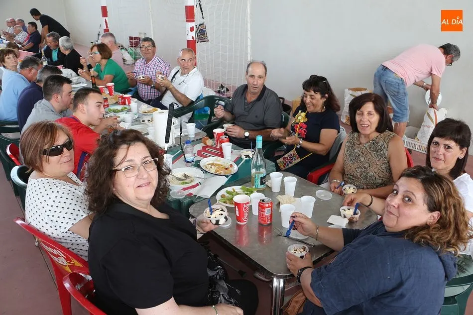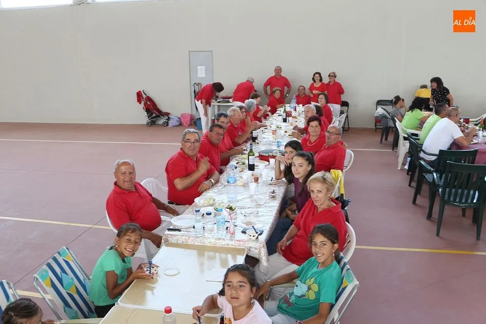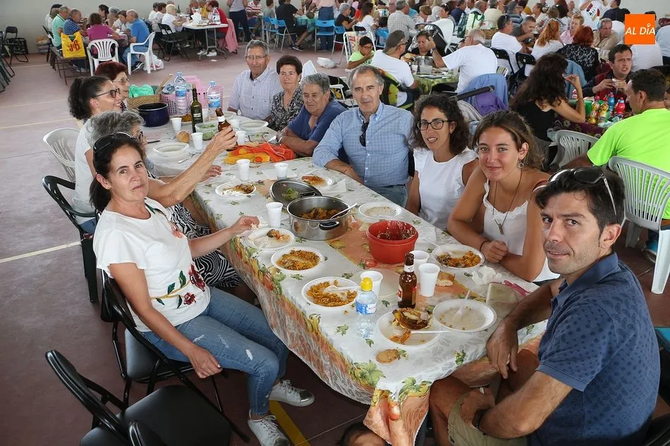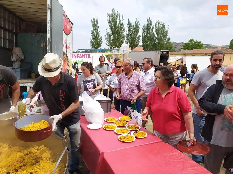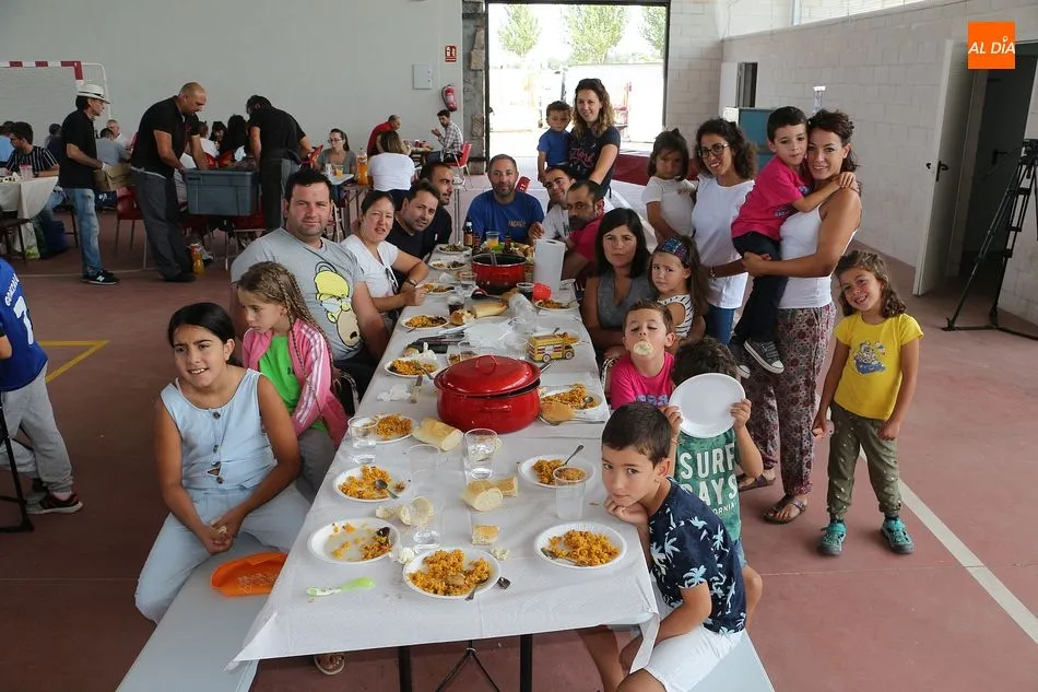 l tiempo y la amenaza de lluvia llevó al Ayuntamiento a reubicar la comida en el pabellón municipal de deportes Hermenegildo Merino Álvarez. Allí se repartieron las raciones de paella al son de la charanga, con helado de postre para los cientos de asistentes.