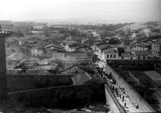 Calle Ancha y Barrio Chino (barrio de los Milagros). Incendio producido en 1929 visto desde la Purísima.