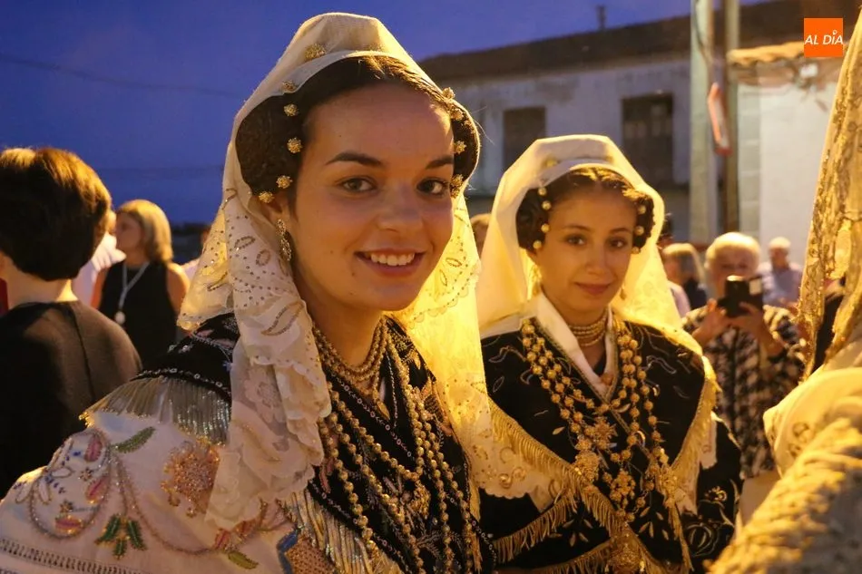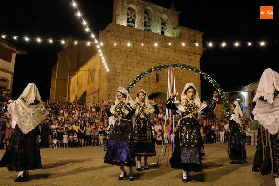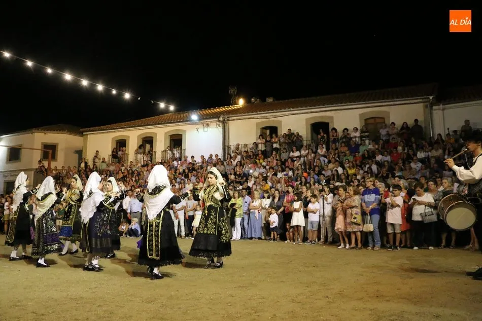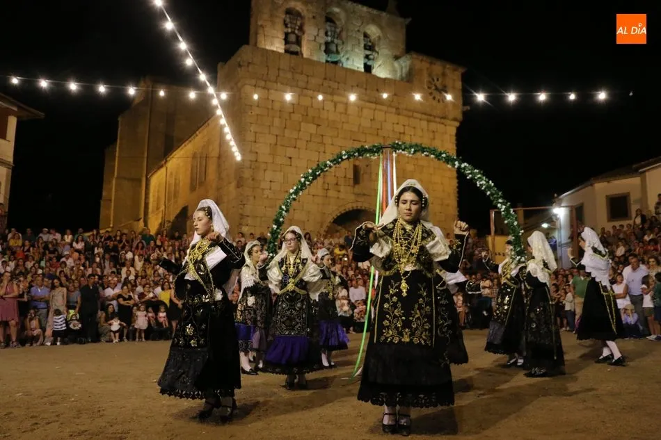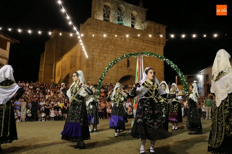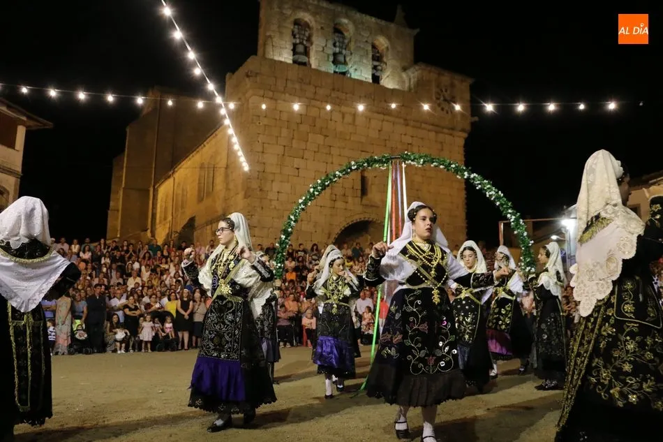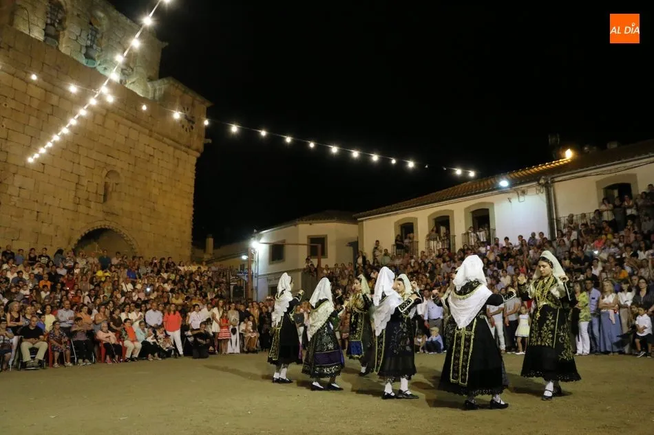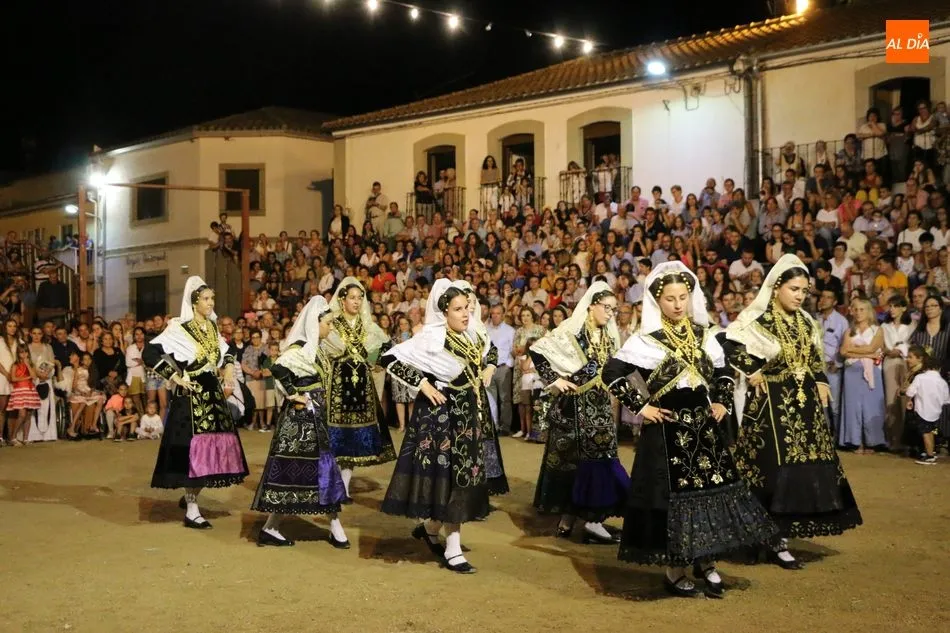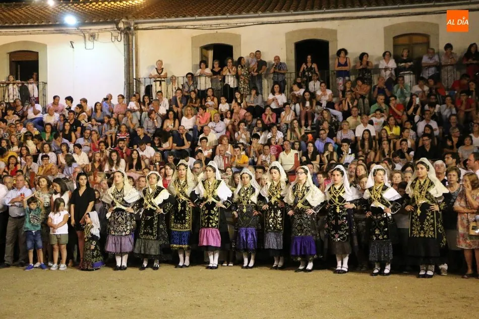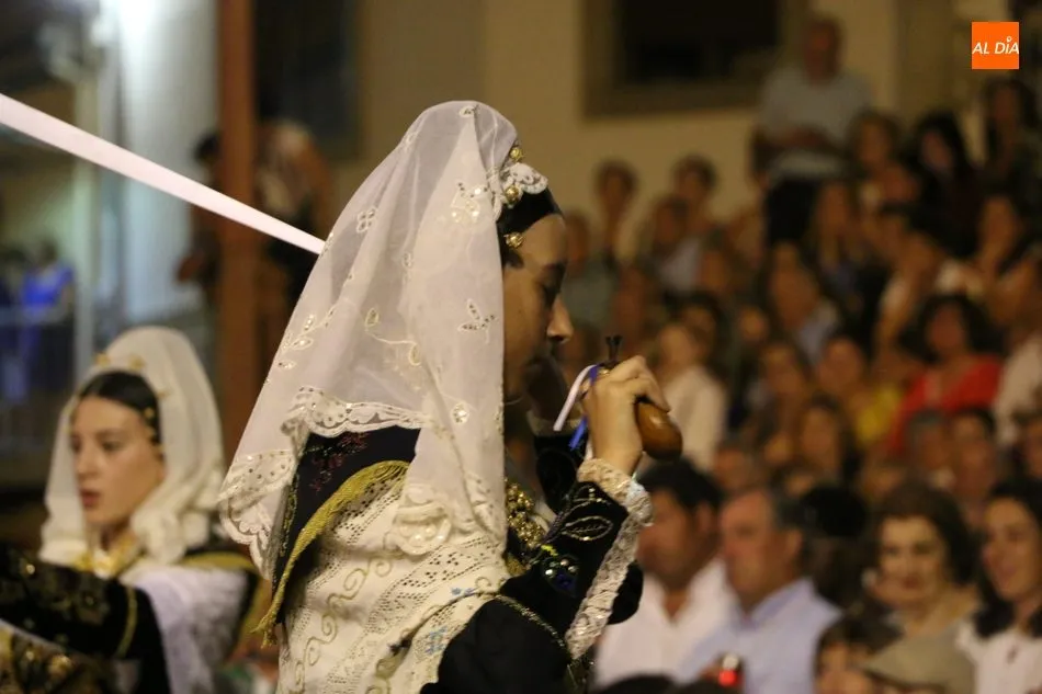 Con una plaza emocionada, el cordón volvió a brillar sobre las luces de la noche. Bajos los sones de la gaita y el tamboril de Juan Vázquez, que por primera vez tocaba en la plaza de su pueblo, las ocho charras danzaron en honor a la Virgen de Santidad esta danza inminentemente religiosa y femenina, como recordaba a LAS ARRIBES AL DÍA la folclorista villaviejense, afincada en Ciudad Rodrigo, María José Calderero, quien celebraba que finalmente este baile haya recuperado su versión original tras años con la introducción de hombres.