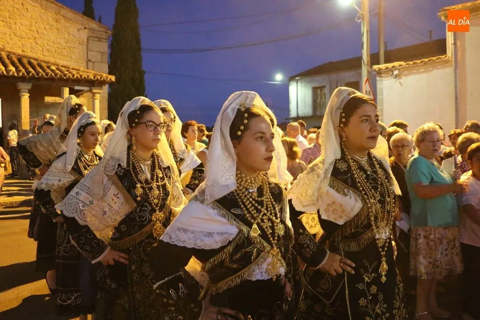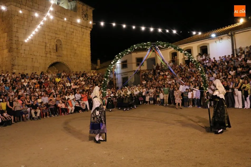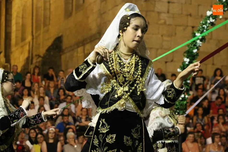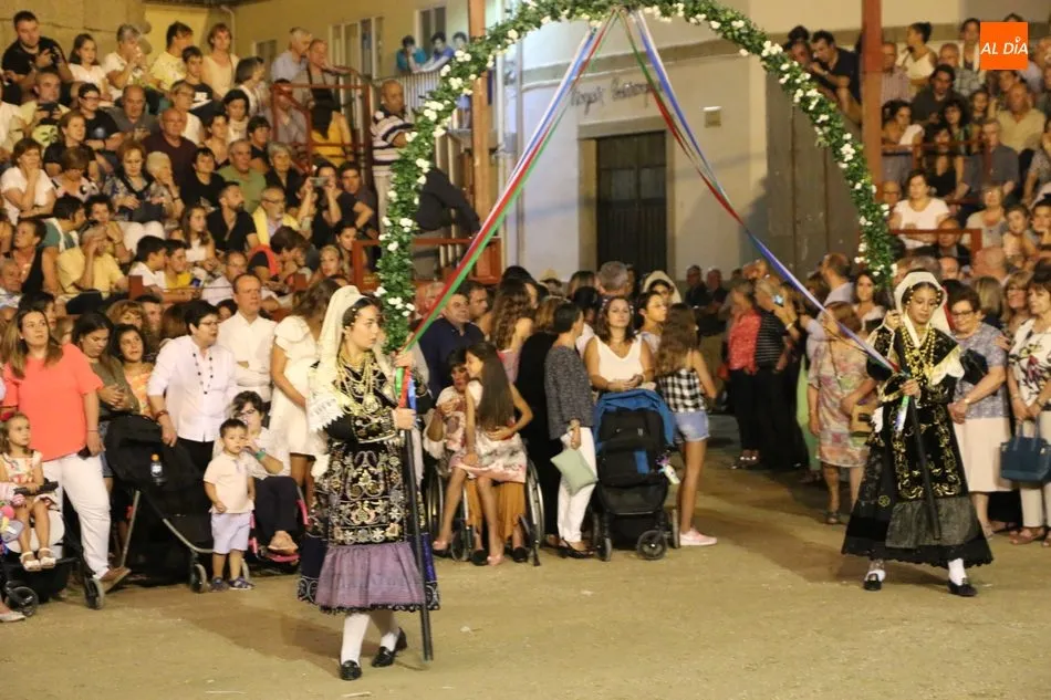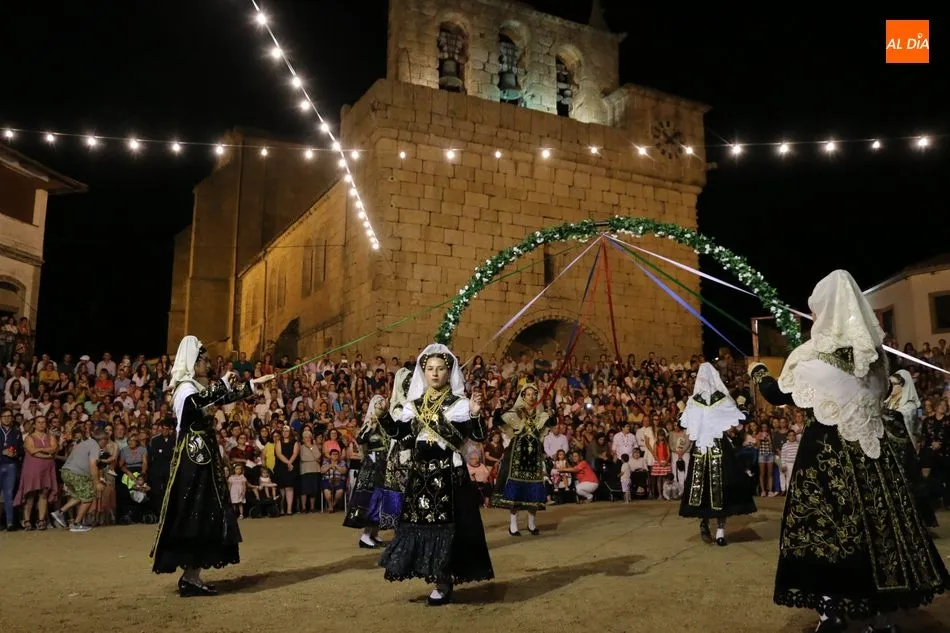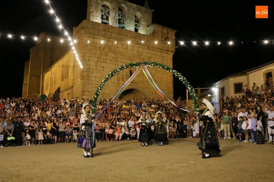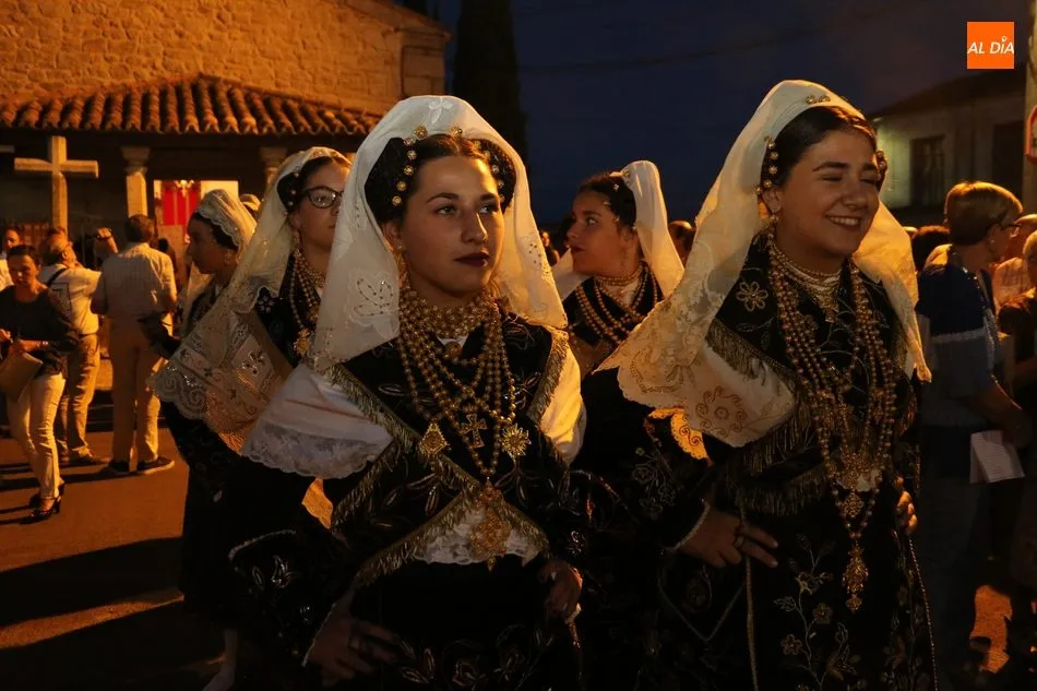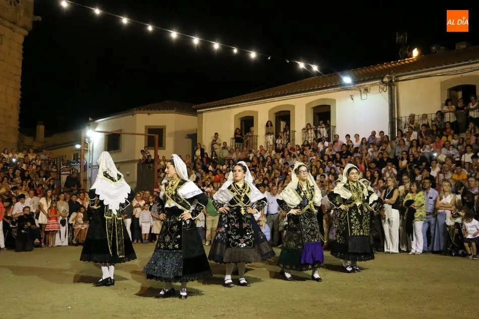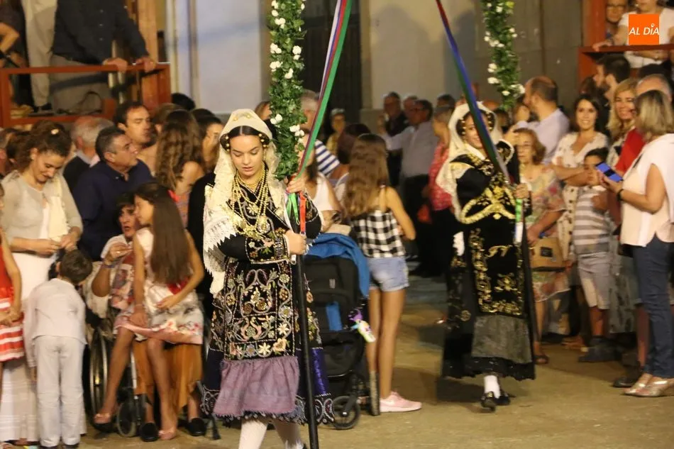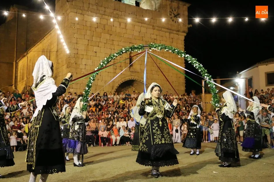 Con una plaza emocionada, el cordón volvió a brillar sobre las luces de la noche. Bajos los sones de la gaita y el tamboril de Juan Vázquez, que por primera vez tocaba en la plaza de su pueblo, las ocho charras danzaron en honor a la Virgen de Santidad esta danza inminentemente religiosa y femenina, como recordaba a LAS ARRIBES AL DÍA la folclorista villaviejense, afincada en Ciudad Rodrigo, María José Calderero, quien celebraba que finalmente este baile haya recuperado su versión original tras años con la introducción de hombres.
