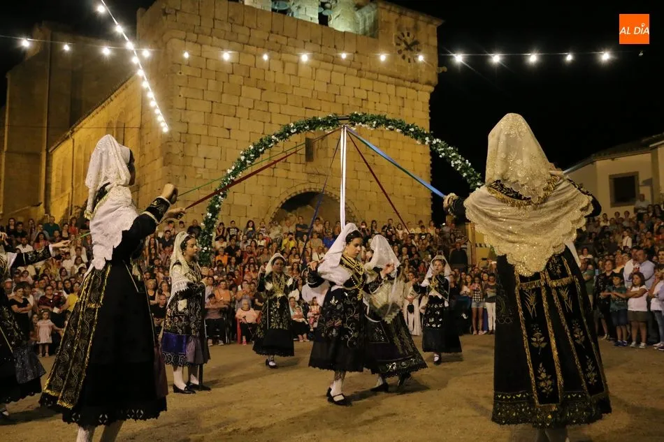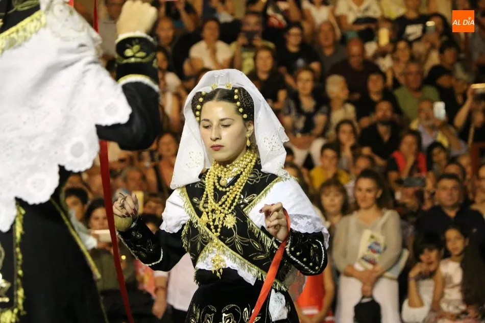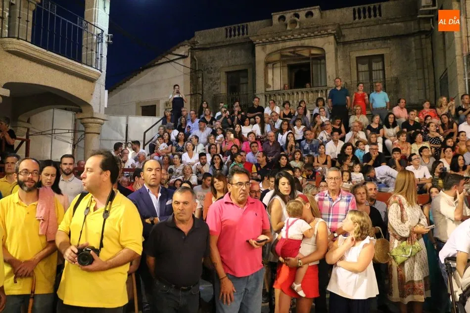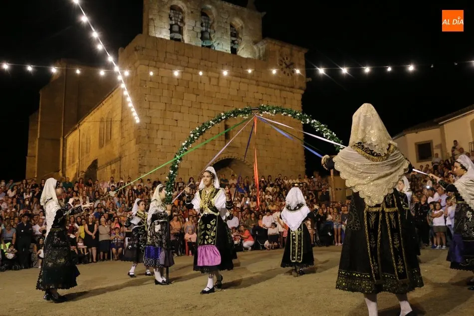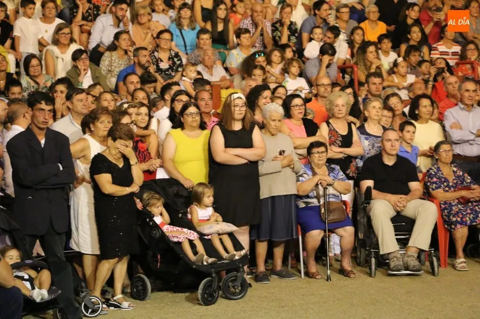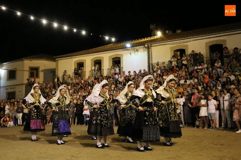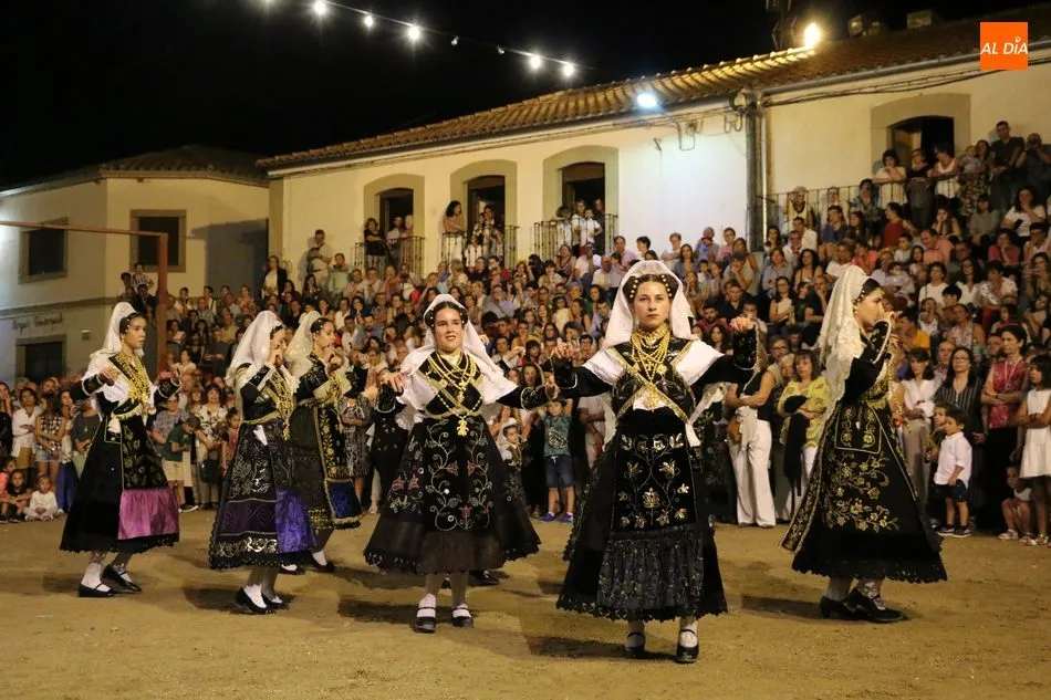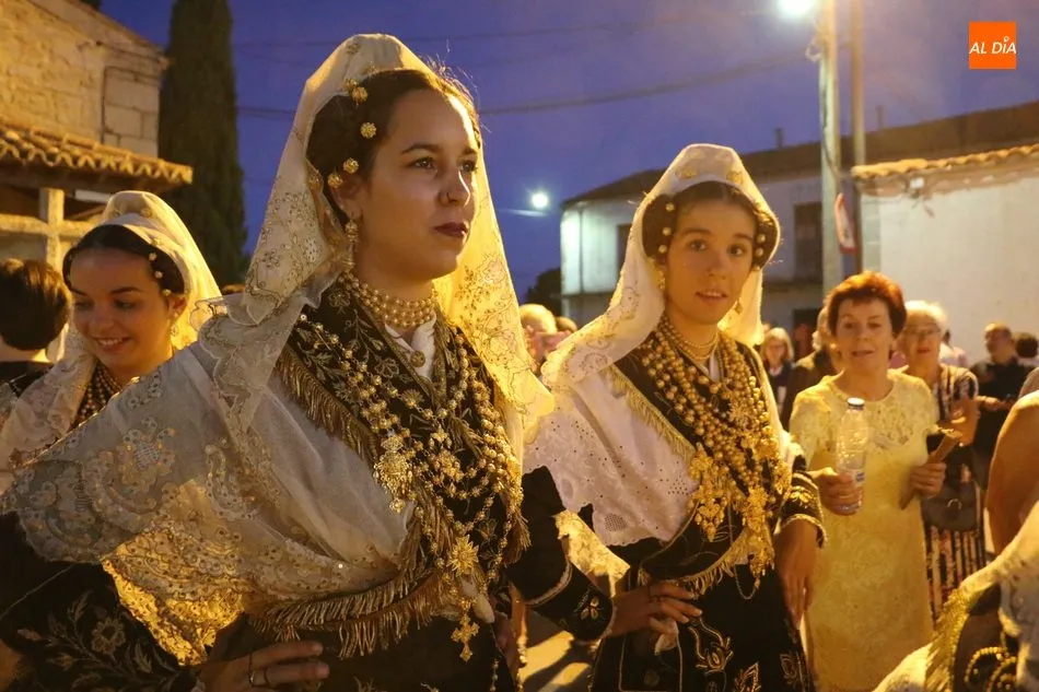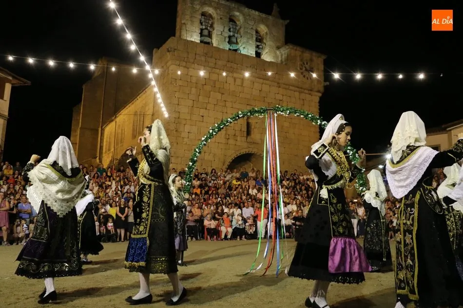 Con una plaza emocionada, el cordón volvió a brillar sobre las luces de la noche. Bajos los sones de la gaita y el tamboril de Juan Vázquez, que por primera vez tocaba en la plaza de su pueblo, las ocho charras danzaron en honor a la Virgen de Santidad esta danza inminentemente religiosa y femenina, como recordaba a LAS ARRIBES AL DÍA la folclorista villaviejense, afincada en Ciudad Rodrigo, María José Calderero, quien celebraba que finalmente este baile haya recuperado su versión original tras años con la introducción de hombres.