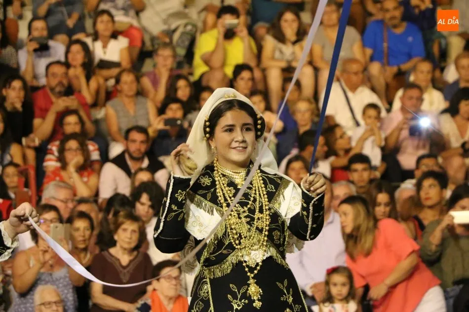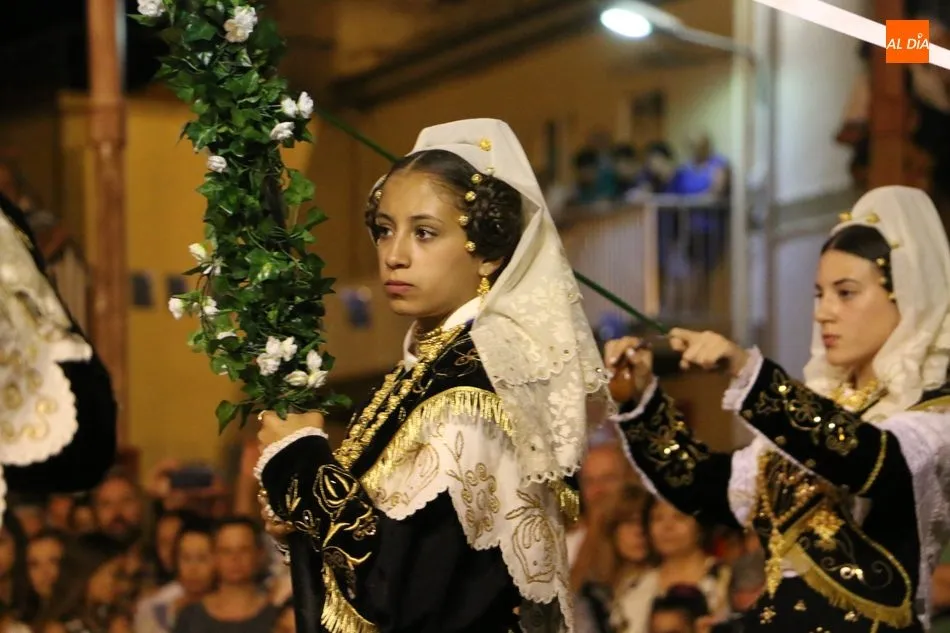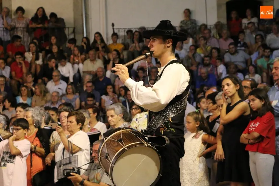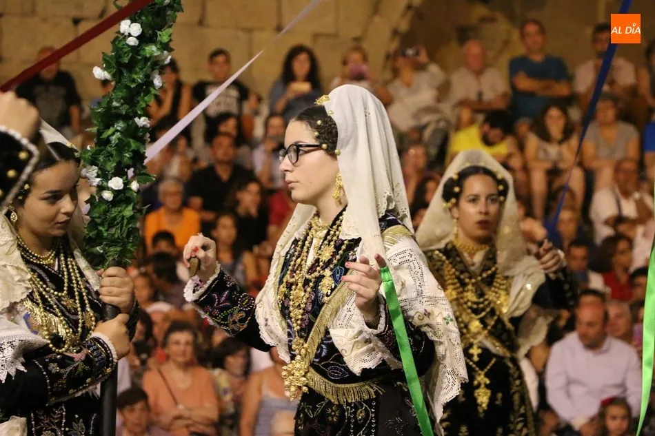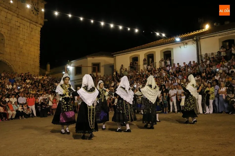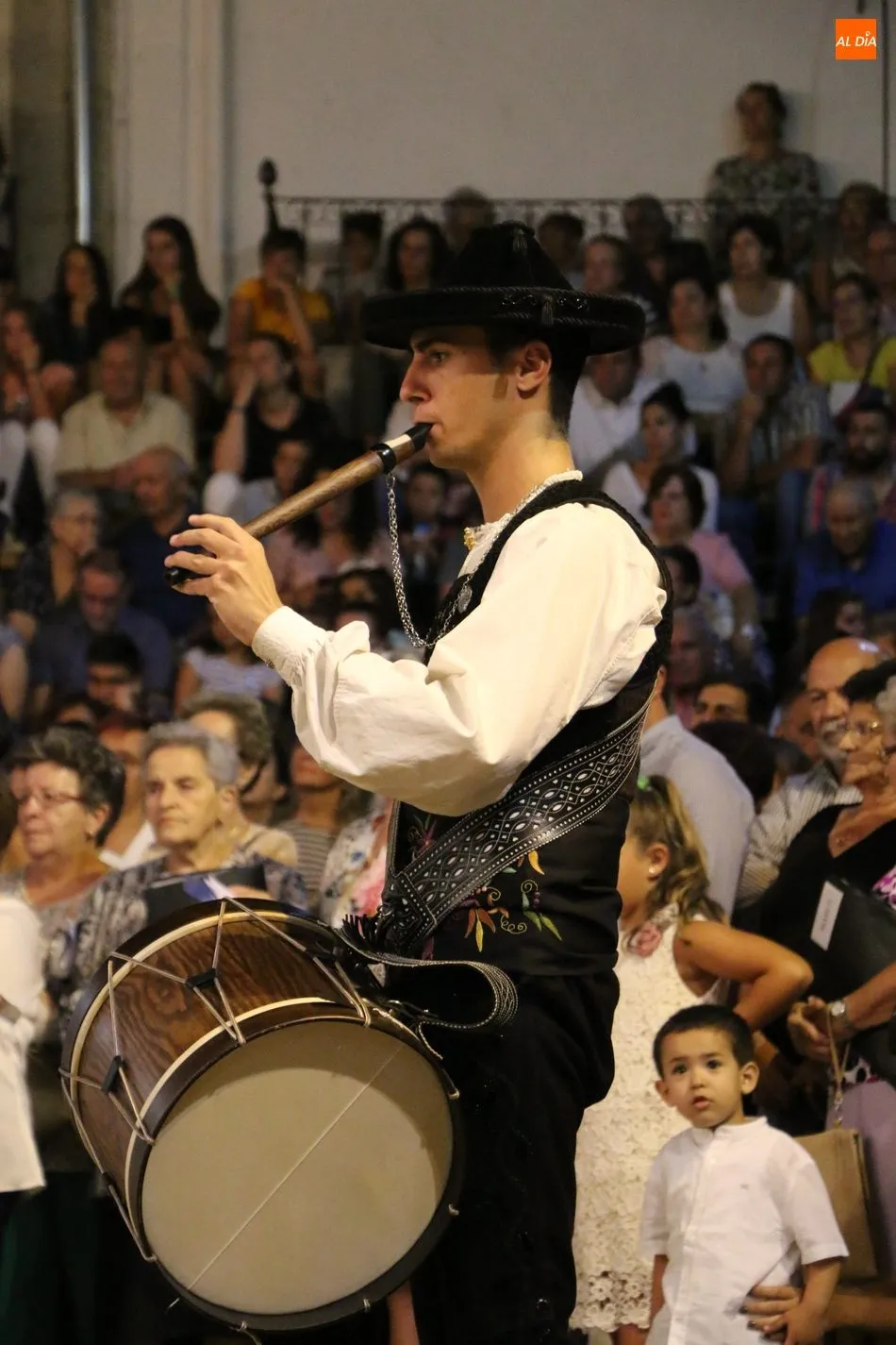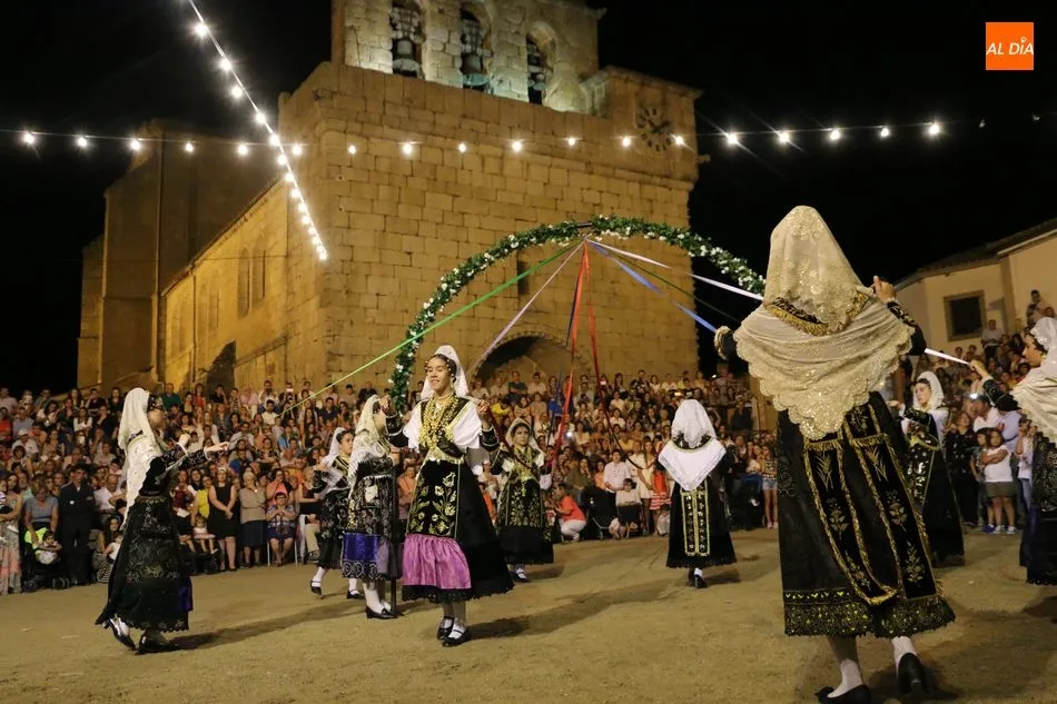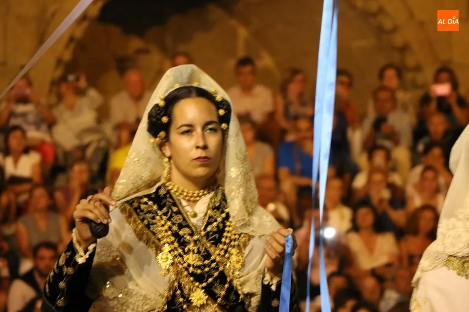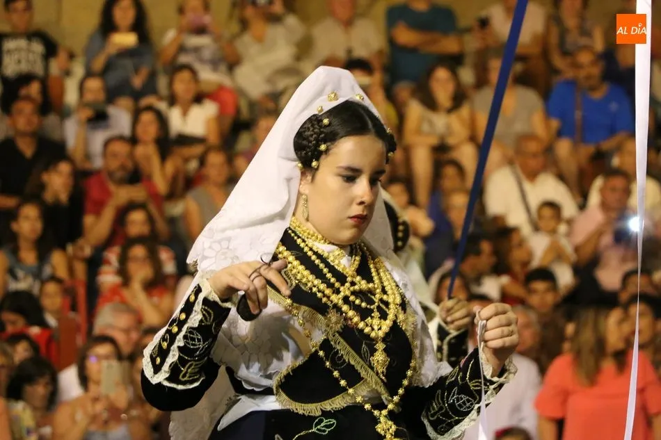 Con una plaza emocionada, el cordón volvió a brillar sobre las luces de la noche. Bajos los sones de la gaita y el tamboril de Juan Vázquez, que por primera vez tocaba en la plaza de su pueblo, las ocho charras danzaron en honor a la Virgen de Santidad esta danza inminentemente religiosa y femenina, como recordaba a LAS ARRIBES AL DÍA la folclorista villaviejense, afincada en Ciudad Rodrigo, María José Calderero, quien celebraba que finalmente este baile haya recuperado su versión original tras años con la introducción de hombres.
