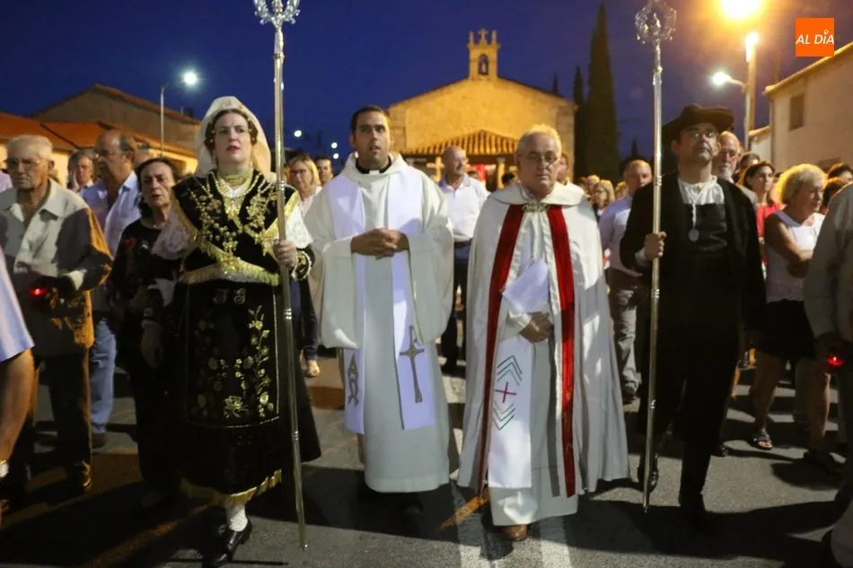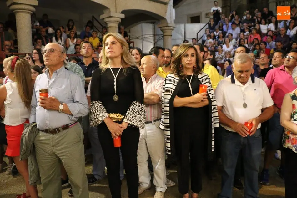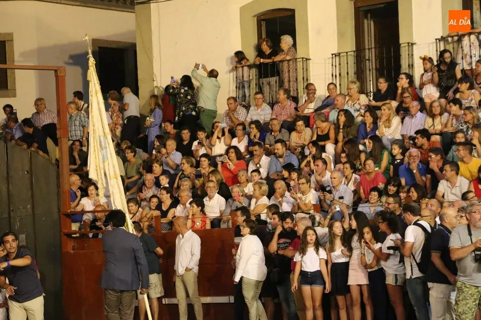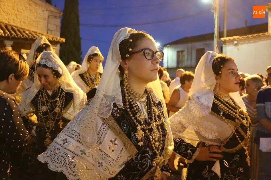 Charros y charras vestidos con los trajes tradicionales de gala, acompañaron a la Virgen de Santidad hasta el ágora de la capital del Yeltes. Con el sol ya escondido en Portugal, la patrona partía en procesión escoltada desde su ermita y guiada por la luz de sus cofrades. Los mayordomos seguían la estela de Nuestra Señora de los Caballeros, camino de la centenaria plaza, flanqueando al párroco Jesús Gutierrez, encargado de oficiar la Novena en la ermita en advocación a la Virgen de los Caballeros.