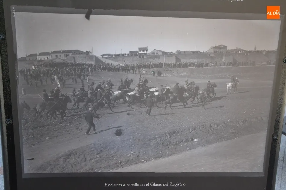 El pasado de Miróbriga renace en las calles a través de fotografías históricas de Pazos y... | Imagen 1Por ejemplo, en el tótem instalado en la Plaza Mayor se pueden encontrar varias imágenes de cómo era antiguamente la Casa Consistorial, que fue objeto de varias reformas durante el siglo XX. En ese punto figura igualmente una imagen del coso taurino de la Plaza durante el Carnaval de 1924, pudiéndose encontrar en otros tótems más imágenes carnavaleras (como un encierro a caballo por la zona del glacis de la actual Avenida de Sefarad).