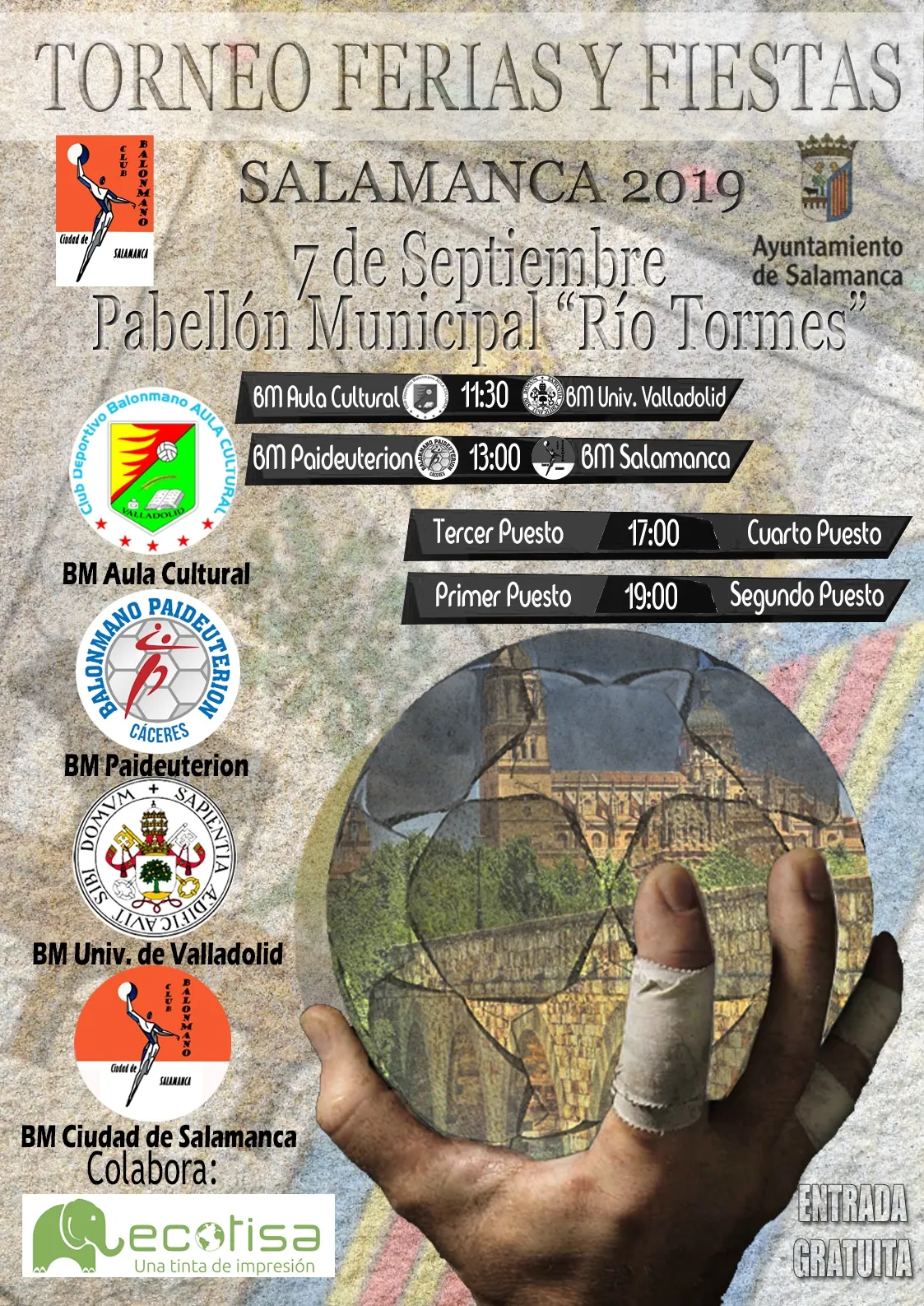 Este sábado 7 de septiembre se celebrará en el Pabellón Río Tormes el tradicional Torneo de Balonmano Ferias y Fiestas 2019. La edición de este año contará con la participación de cuatro equipos, los vallisoletanos Aula Cultural y Universidad de Valladolid, los cacereños Paideuterion y el Autocares Sanalón Ciudad de Salamanca.