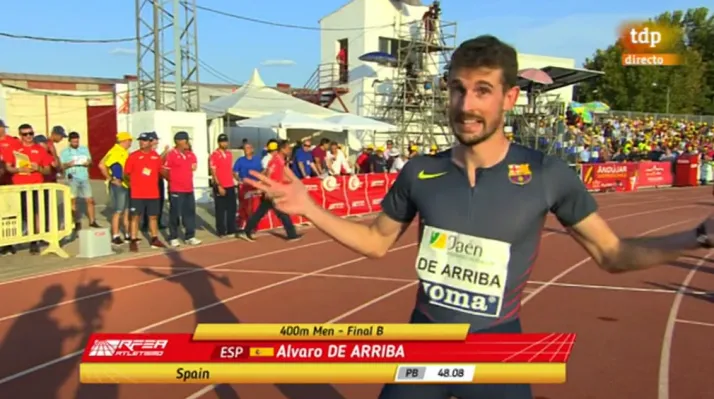 Debido a su marca en la distancia, la peor entre los 12 inscritos para los 400 metros lisos, Álvaro de Arriba fue encuadrado en la Final B, junto a otros 4 atletas. El atleta de La Fuente fue último durante buena parte de la carrera, adelantando en los últimos instantes al también español Eliam Fernández para cruzar la meta en 4ª posición. En lo que respecta al tiempo, firmó un registro de 47?65, pegándole un pequeño mordisco a su mejor marca histórica en la distancia, que hasta ahora era de 48?08.