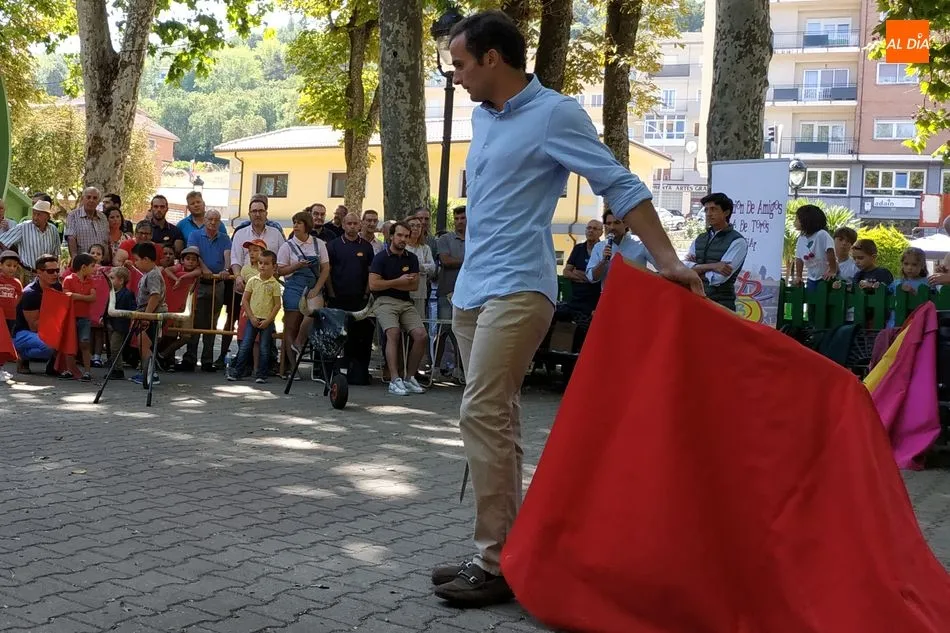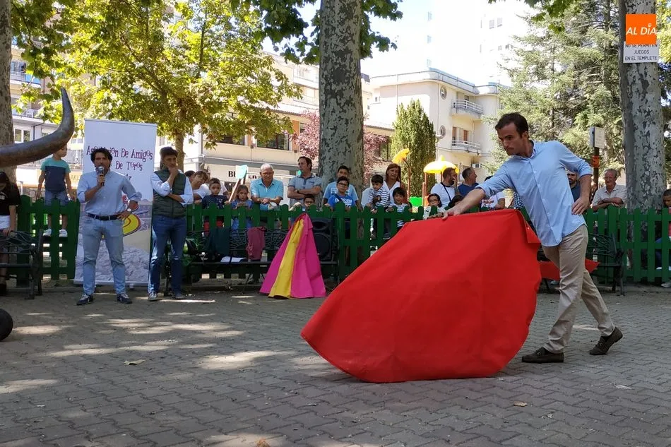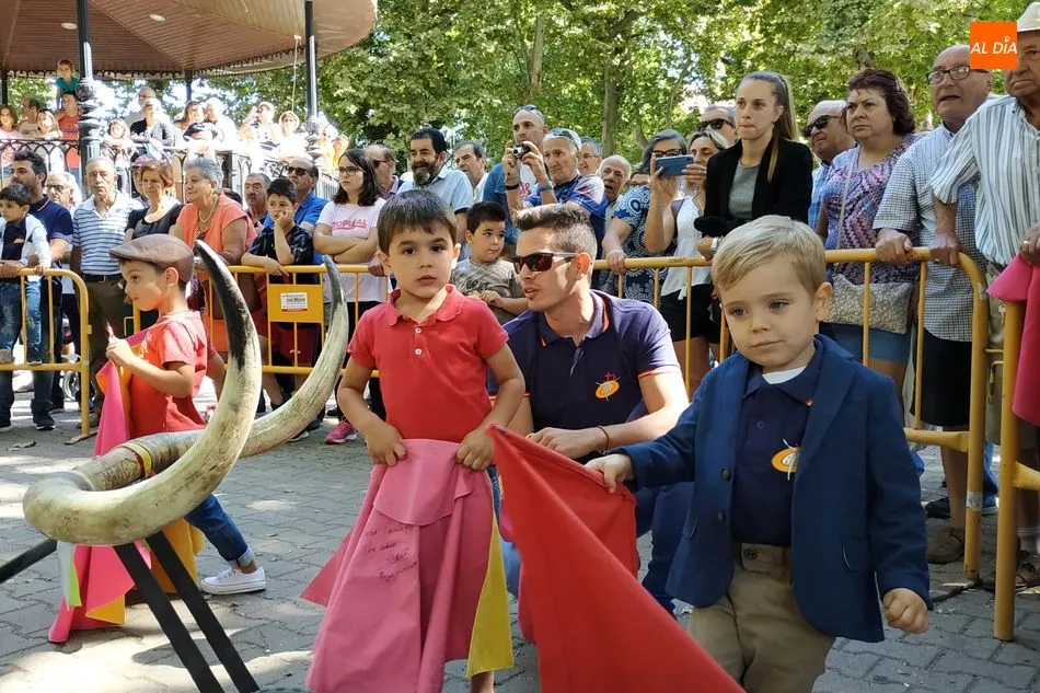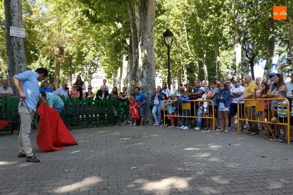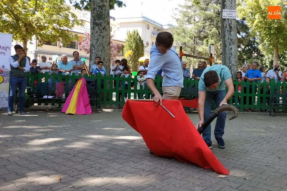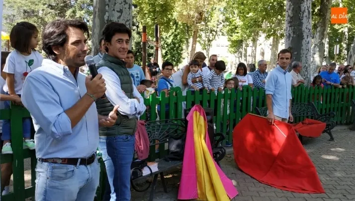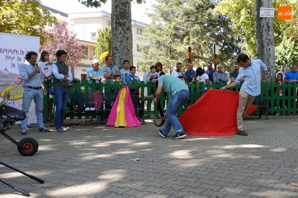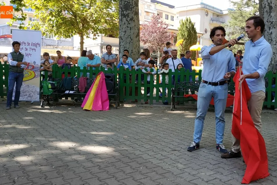 Pedro Gutiérrez ?El Capea? y Damián Castaño, que sustituirá en el cartel de la corrida de la Plaza de Toros de Béjar al peruano Joaquín Galdós, han pasado una mañana en el parque municipal de La Corredera haciendo una exhibición de toreo de salón, en la que niños y mayores han podido ver de cerca y despacio, pases y lances de tauromaquia para hacer entender algo más el complicado mundo de la lidia.