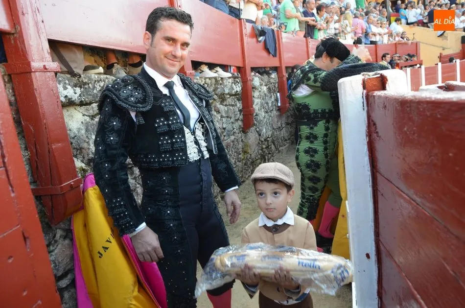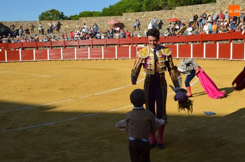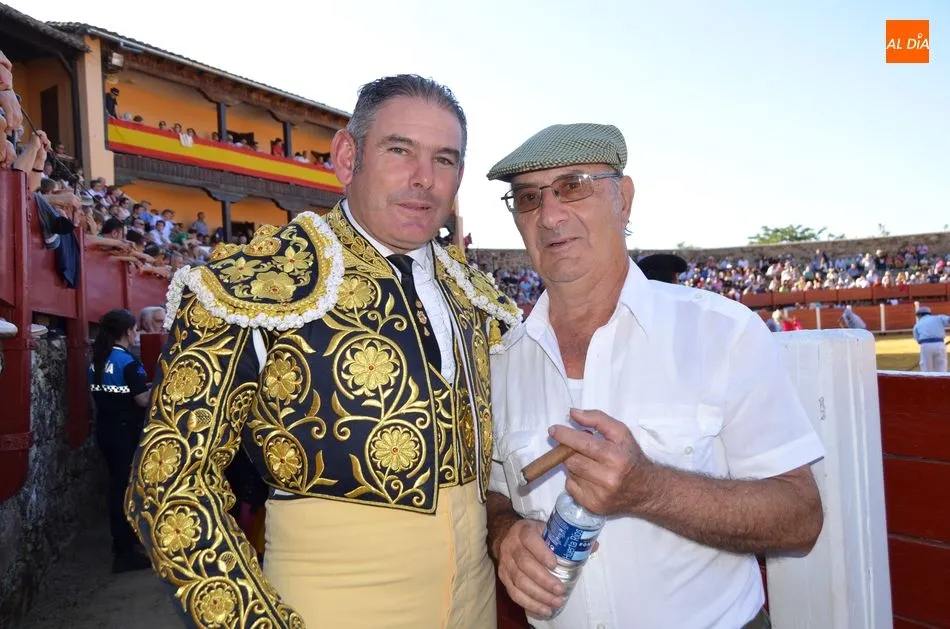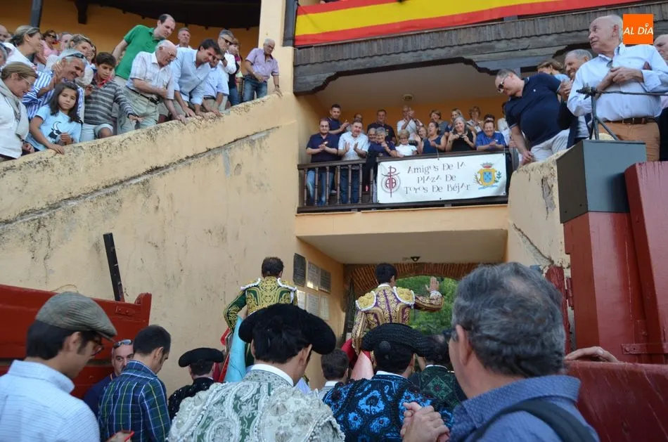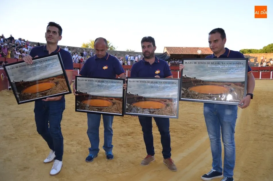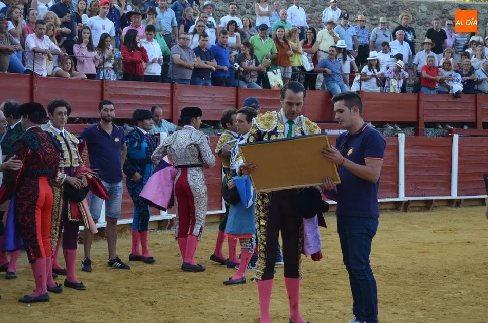 Al finalizar la corrida, miembros de la Asociación de Amigos de la Plaza de Toros de Béjar entregan como recuerdo a los toreros y al ganadero Francisco Galache, una fotografía enmarcada de la Plaza de Toros de Béjar y salen a hombros por la Puerta Grande, El Capea y Damián Castaño.