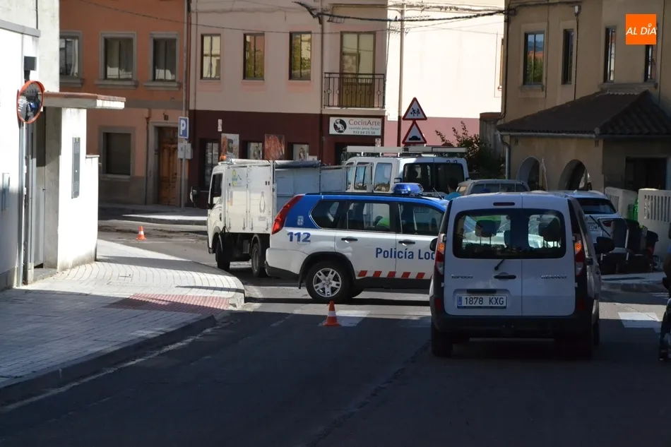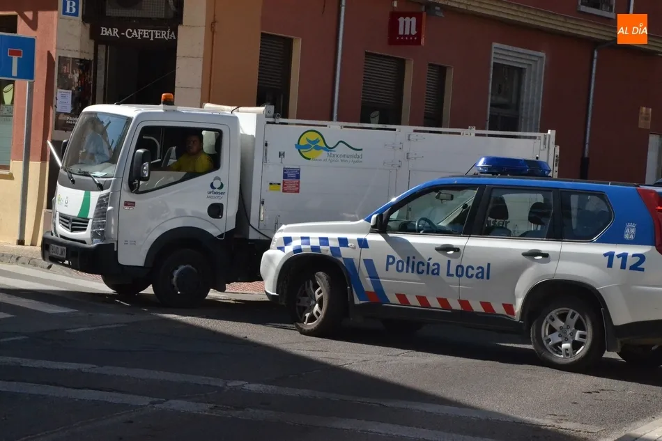 En pocos minutos acudió hasta el lugar la patrulla de servicio de la Policía Local, que procedió a cortar el tráfico en la vía mediante la colocación de conos (en la parte superior, en la confluencia con la calle Escuelas), para que los efectivos de Urbaser pudieran empezar a recoger toda la carga que había dejado esparcida el camión por la calzada.