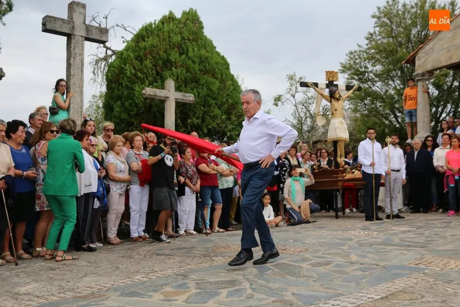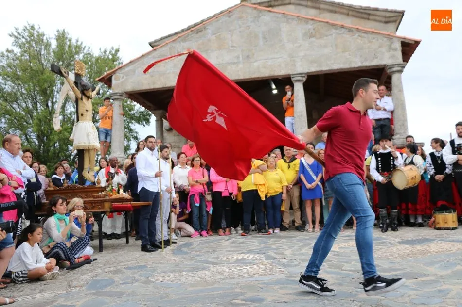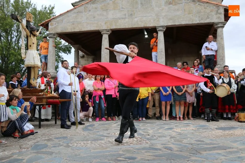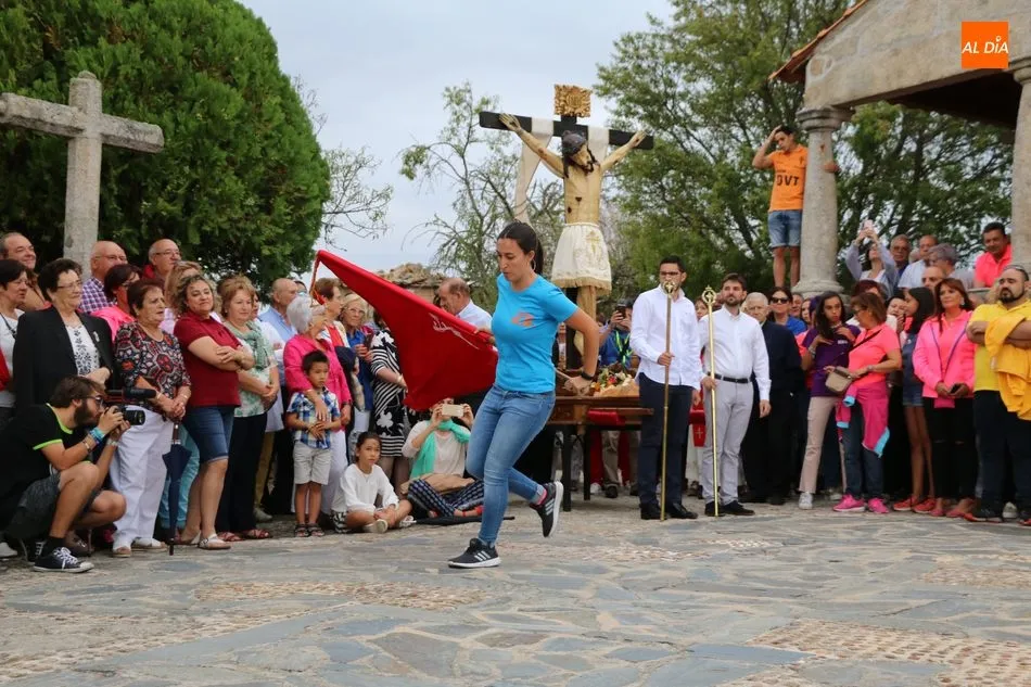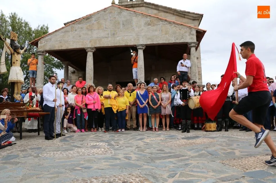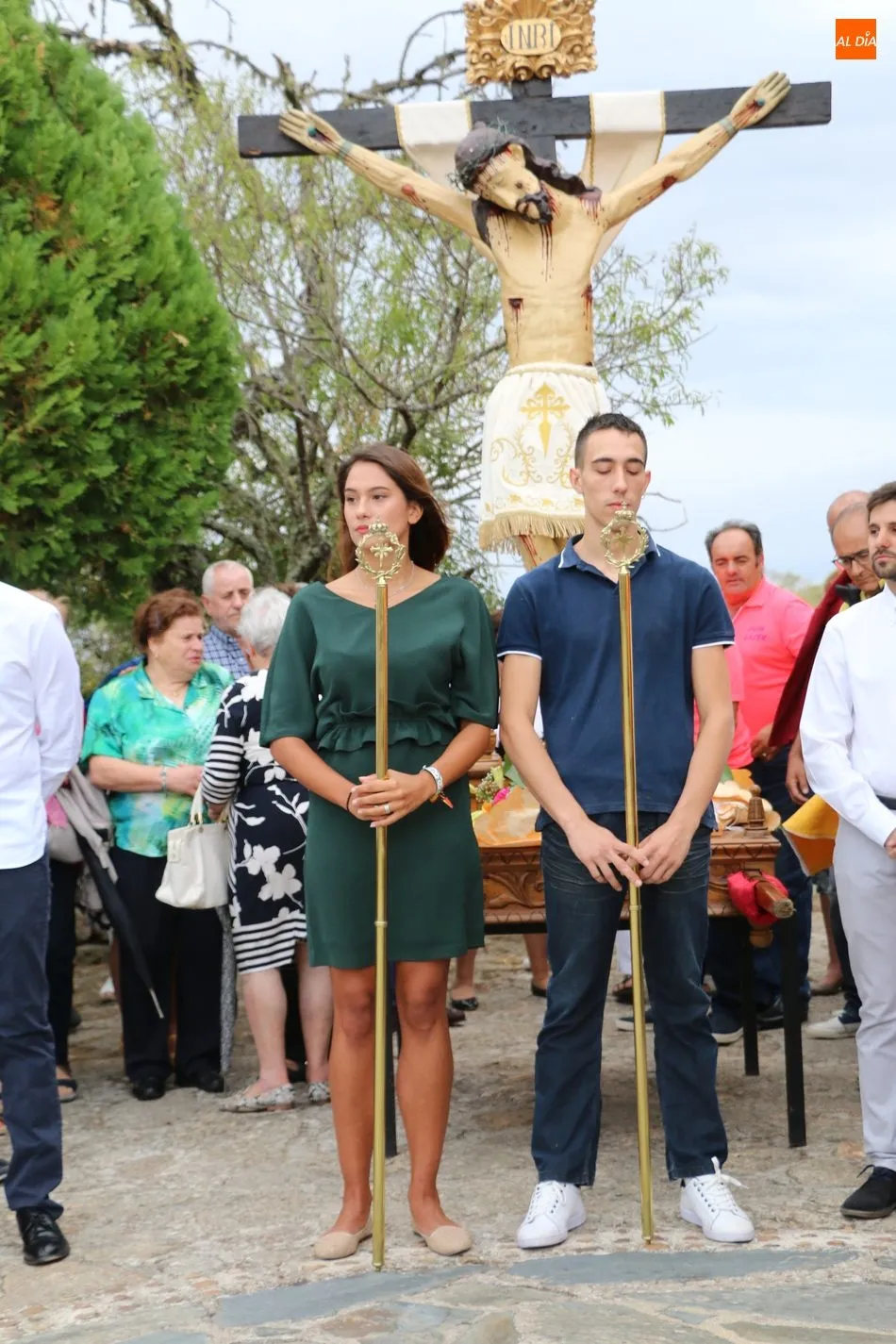 Una vez a las puertas de la ermita, comenzaba el ofertorio para continuar con el baile de la bandera interpretada con la gaita y el tamboril por Leonardo Alburquerque. Finalizada esta ancestral danza, tenía lugar el cambio de varas a favor de los nuevos mayordomos, que lo serán por un año los primos Ismael Martín Bueno y Ruth Alcalá Bueno, dándose así por finalizados los actos en honor al Cristo.