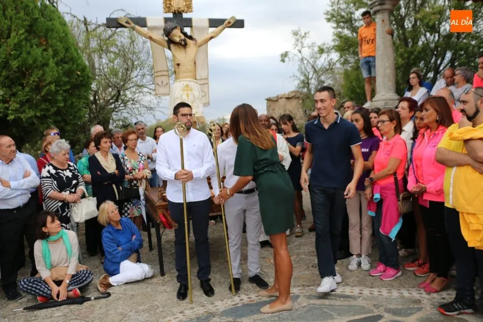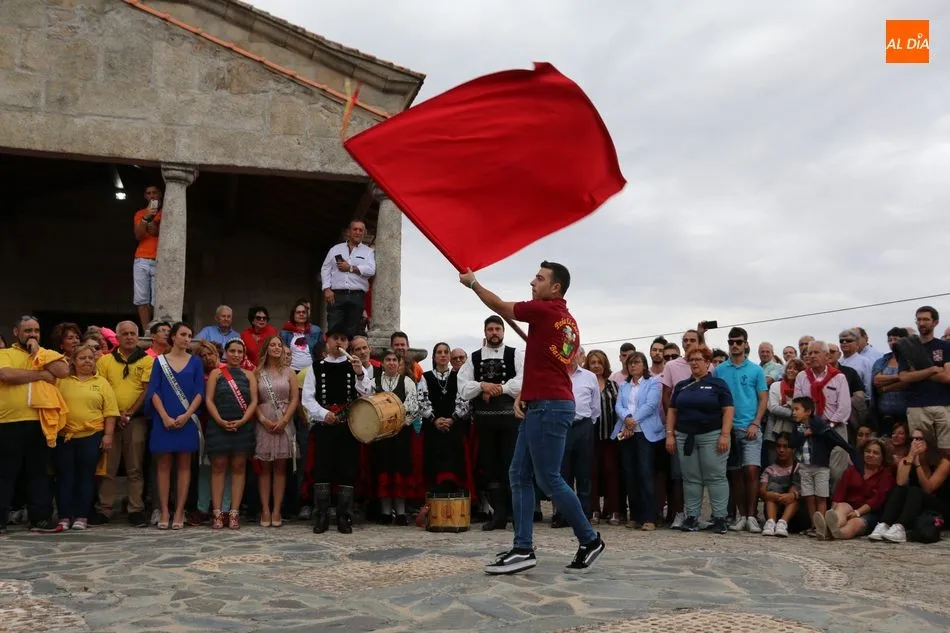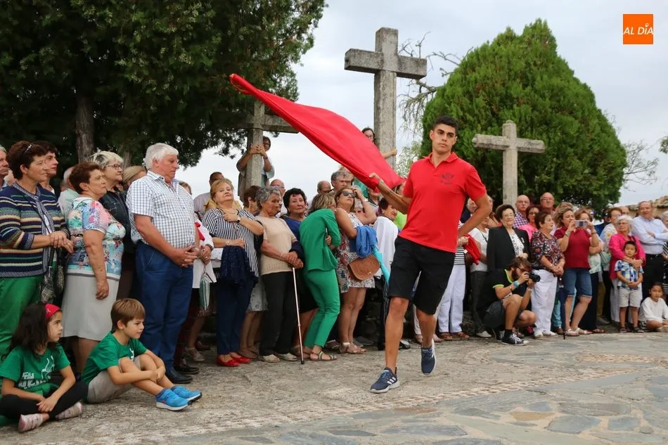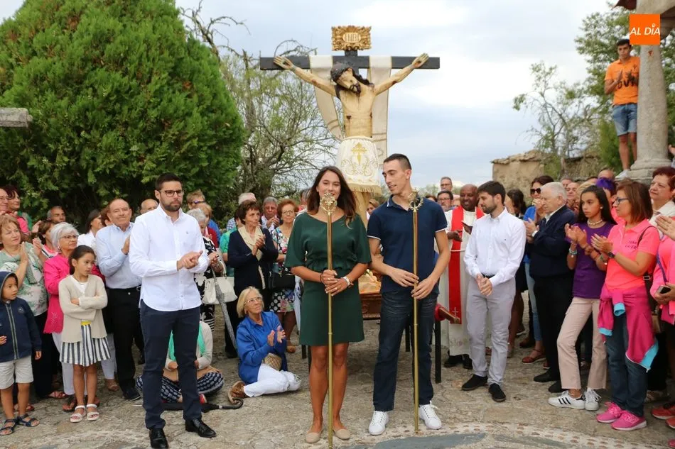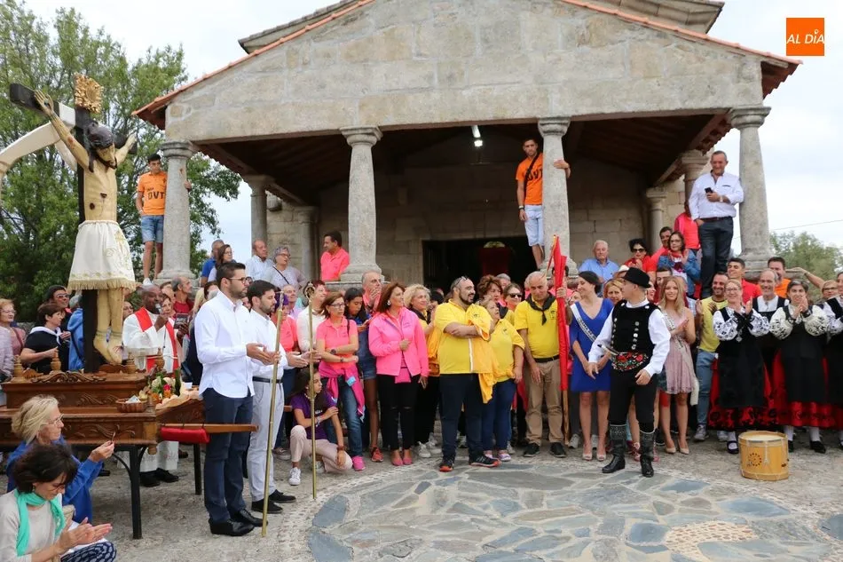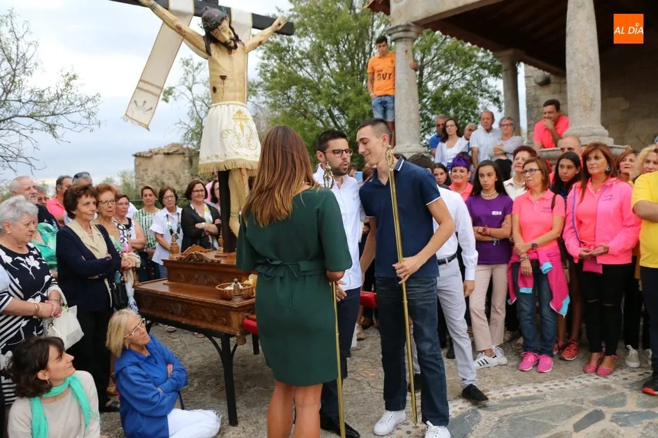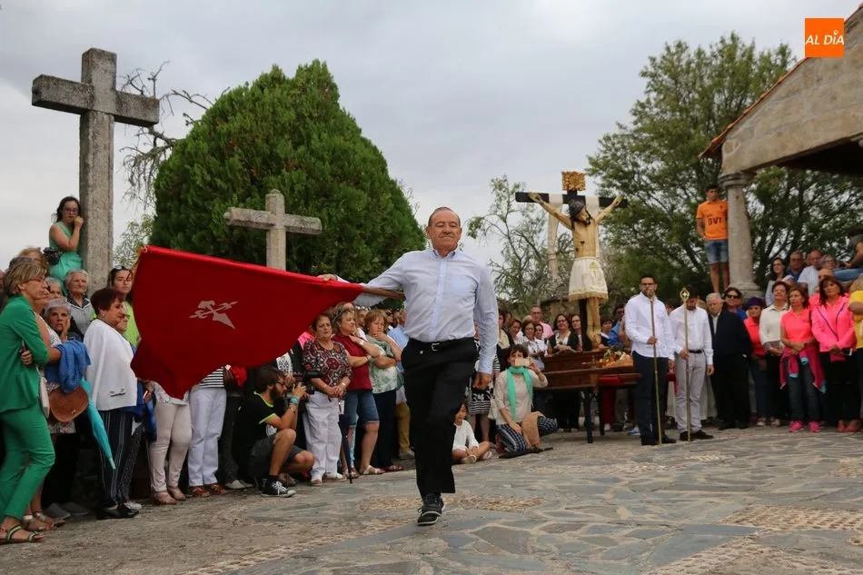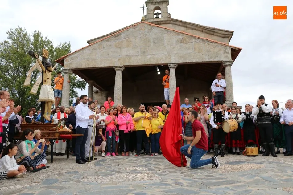 Una vez a las puertas de la ermita, comenzaba el ofertorio para continuar con el baile de la bandera interpretada con la gaita y el tamboril por Leonardo Alburquerque. Finalizada esta ancestral danza, tenía lugar el cambio de varas a favor de los nuevos mayordomos, que lo serán por un año los primos Ismael Martín Bueno y Ruth Alcalá Bueno, dándose así por finalizados los actos en honor al Cristo.