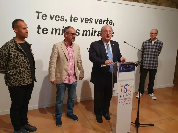 El vicerrector de Política Académica y Participación Social, Enrique Cabero, presentó la exposición ?Te ves, te ves verte, te miras mirarte? de Víctor Rico, junto a Luis Barrio, subdirector del Servicio de Actividades Culturales; Diego del Pozo Barriuso, vicedecano de la Facultad de Bellas Artes; y el propio artista en la Hospedería Fonseca.