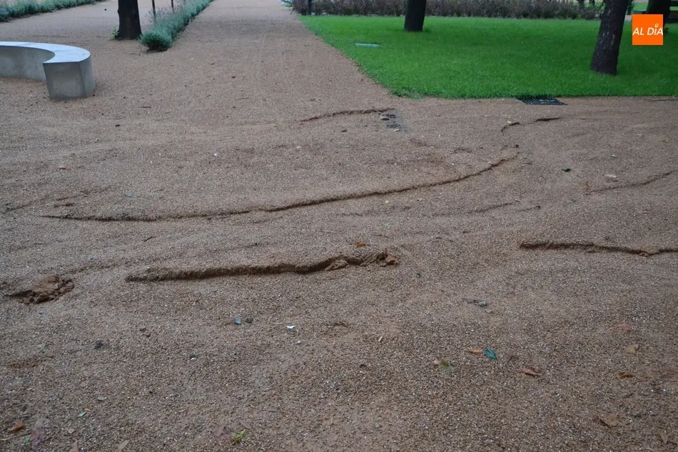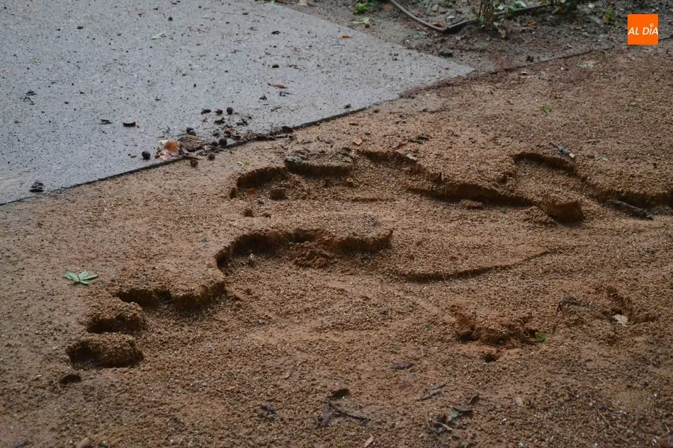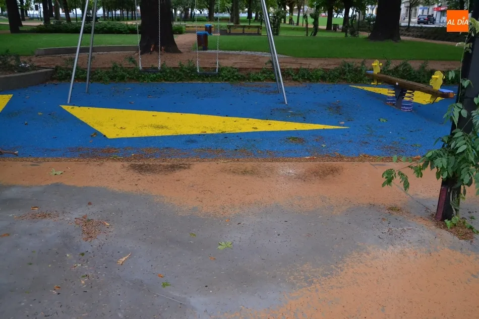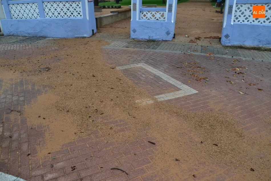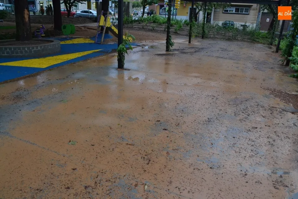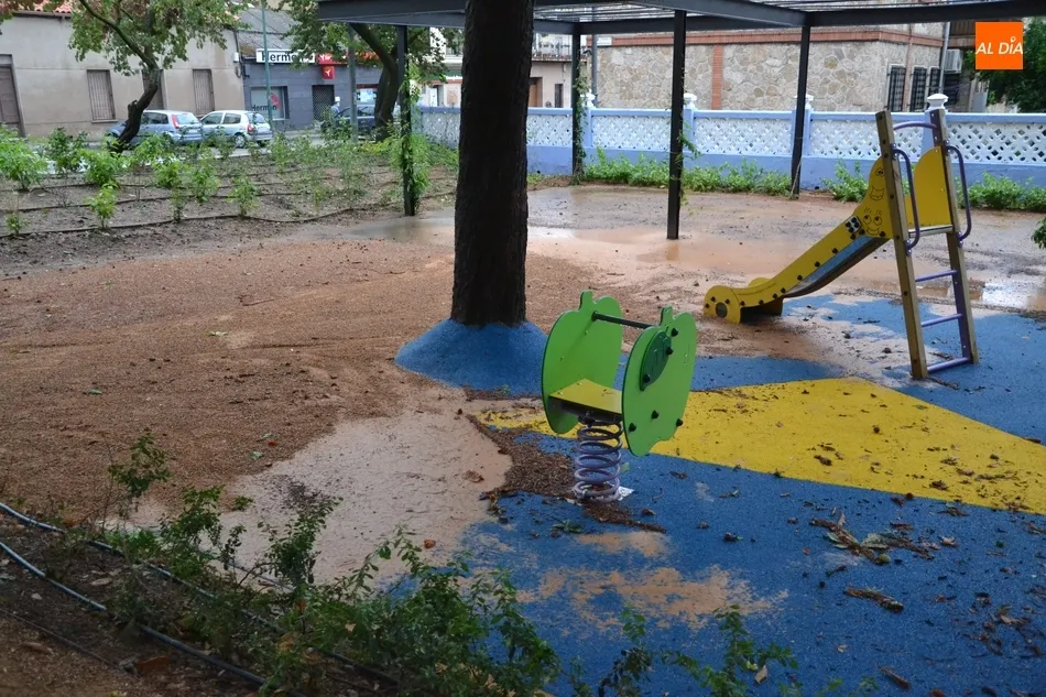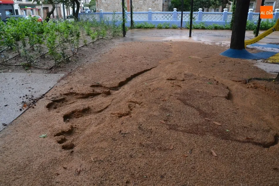 La tormenta también afectó de forma notable a los parques más céntricos de Ciudad Rodrigo. Si en el Parque de La Glorieta se formó la habitual ?piscina? entre el recinto de juegos y el muro que da a la acera de la Avenida de Béjar, en el Parque de La Florida las corrientes de agua y granizo arrastraron parte de la arena, especialmente en la zona que da a la calle Venerable Centenares. De hecho, incluso parte de la arena salió al exterior. En lo que se refiere al interior, lo que será la zona de terraza del aguaducho quedó cubierta por una capa ?chocolate? al igual que parte del vecino parque infantil.