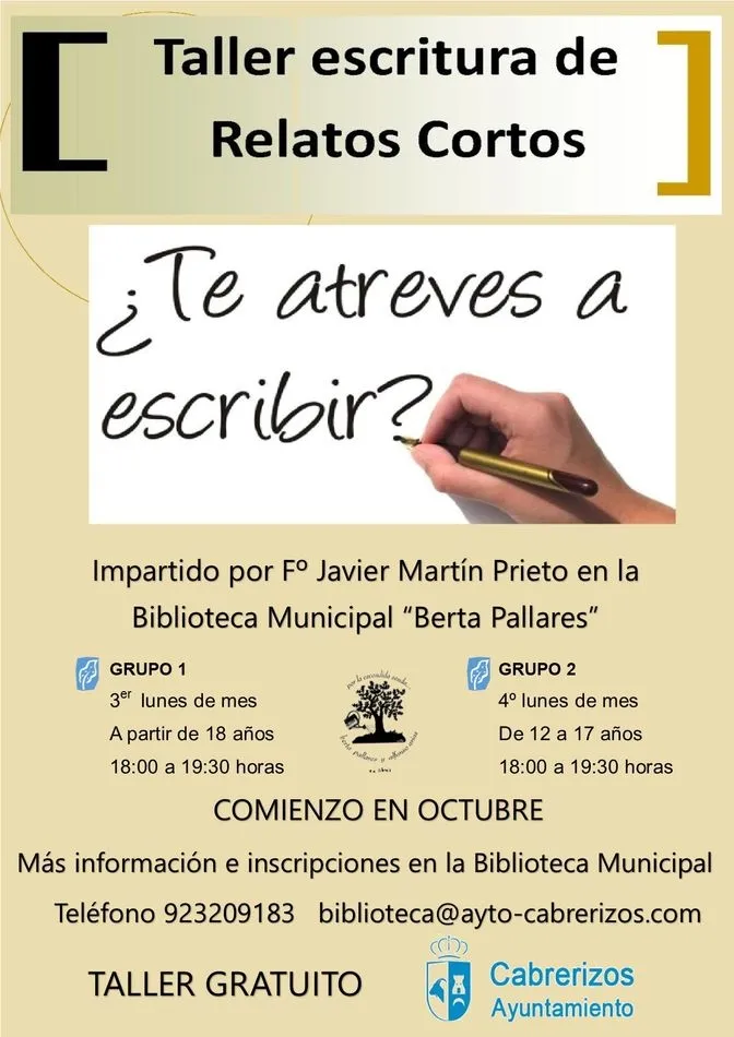 La Biblioteca Municipal Berta Pallares de Cabrerizos ha presenado las distintas actividades programadas para este nuevo curso que se inicia en el mes de octubre. Como novedad, se encuentra un taller de ?Creación de relatos cortos? impartido por Francisco Javier Martín Prieto (escritor local y docente).