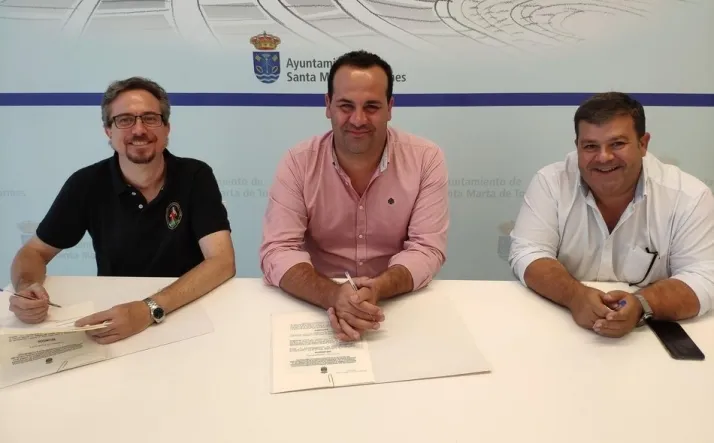 El alcalde, David Mingo, y el Hermano Paco, de la orden de los Misioneros de San Vicente de Paúl, renovaron ayer la colaboración que vienen prestando y que permite que las asociaciones de Santa Marta puedan hacer uso del teatro de los Padres Paúles.