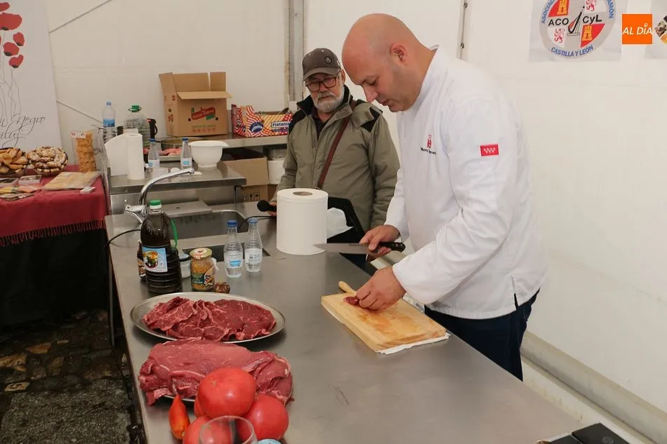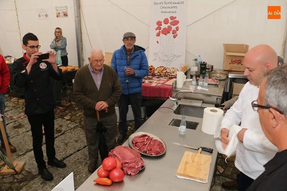 A continuación, ha tomado las riendas de la cocina el chef Alberto Tabernero, experimentado cocinero y profesor de la Escuela Superior de Hostelería y Turismo de Madrid, que ha elaborado un tartar con corazón de buey y tomata de Cepeda y carne a la parrilla procedente de un cruce de angus con vaca morucha, también de la zona. El público ha atendido a los diferentes pasos de la cocina y ha estado más atento aún a la hora de probar los platos.