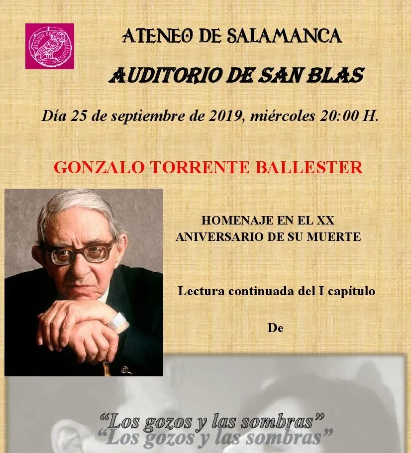 El Ateneo de Salamanca rendirá el próximo 27 de septiembre un homenaje a Gonzalo Torrente Ballester con motivo del XX aniversario de su muerte. Será en el Auditorio de San Blas a las 20.00 horas y la entrada es libre hasta completar el aforo.