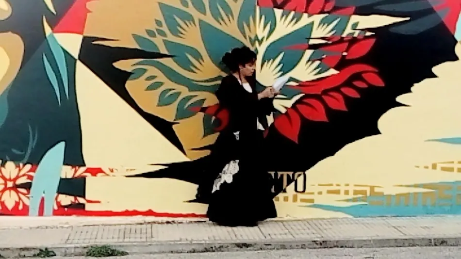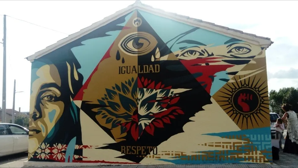El artista ha plasmado aquí su sensibilidad hacia esta lacra mostrando mediante símbolos el laberinto en el que entra la mujer, el camino de flores y pureza que la saca de él, el loto que se abre paso, y su puño en lucha para levantarse entre el respeto y la igualdad, atributos que son suyos.