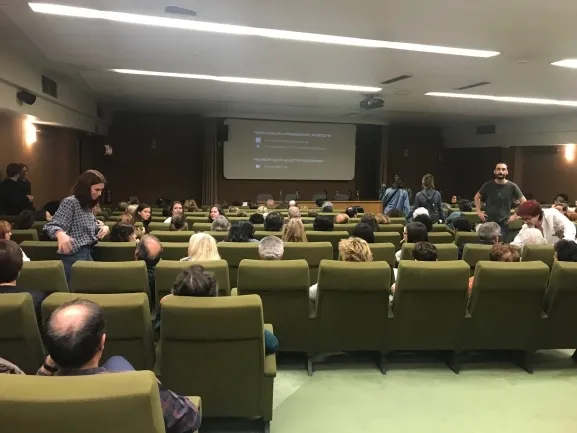 Tras el documental, se procedió a dar la palabra a las expertas: Mar Marcos, coordinadora del Área de Formación, Participación, Educación y Comunicación Ambiental dentro de la Oficina Verde de la USAL; Pilar de Celis, voluntaria de Intermon Oxfam con un gran conocimiento en consumo y comercio justo; Mabel Asensio Sevilla, doctora en Matemáticas quien dirige el equipo de Simulación Numérica y Cálculo Científico de la USAL dedicándose a desarrollar varios modelos de incendios forestales y de dispersión de contaminantes, y Rodrigo Santa María, profesor de ingeniería informática y gran apasionado de la ecología y eficiencia energética.