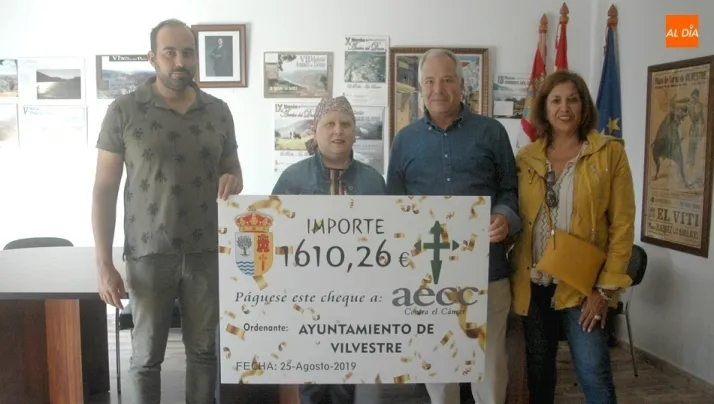 El alcalde de Vilvestre, Juan Ángel Gorjón, hizo entrega este jueves de un cheque por valor de 1.610?26 euros euros a la AECC, talón que recogía el tesorero de esta organización, José Antonio Martín.