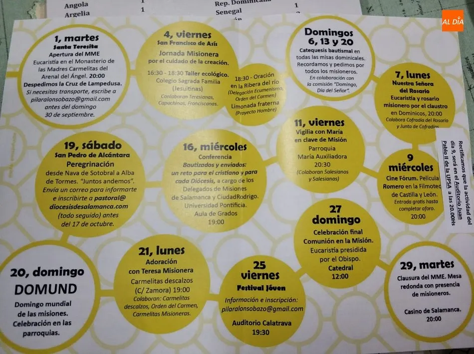 Los actos del MME en Salamanca han sido presentados esta mañana con la presencia de Policarpo Díaz, vicario de pastoral y miembro de la comisión, Jesús Torres y Pilar, misioneros, y Juan Robles, director de servicios diocesanos de misiones. Se comenzará el próximo martes, 1 de octubre con la despedida de la Cruz de Lampedusa. Habrá talleres ecológicos, conferencias y un festival, además de varias celebraciones religiosas, como las catequesis bautismales los días 6, 13 y 20 de octubre. Destacan además la peregrinación por San Pedro de Alcántara, que se realizará entre Nava de Sotobral y Alba de Tormes. Los actos concluirán con la Comunión en la Misión, una eucarístía presidida por el obispo de Salamanca en la Catedral de la ciudad.