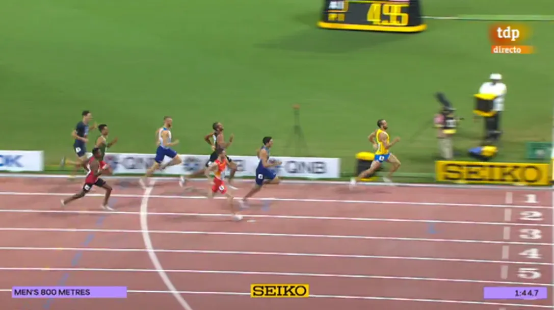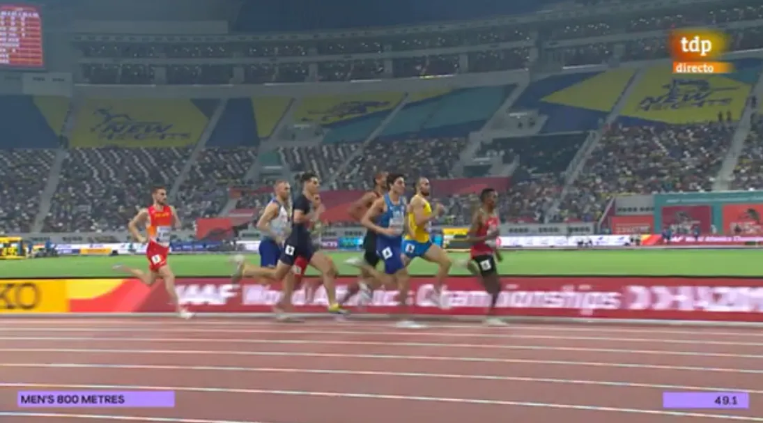 Cerca de los 600 metros, el atleta de La Fuente de San Esteban adelantó a dos atletas, pero tuvo que abrirse muy hacia el exterior para continuar avanzando en plena última curva. Eso hizo que cayese a la 7ª-8ª plaza (la realización se fue con los de delante). Ya en plena recta hizo un enorme sprint que le llevó a colocarse 3º, sprintando con todas sus fuerzas para intentar coger al que iba 2º, el estadounidense Hoppel, pero el esfuerzo fue insuficiente, quedándose a 14 centésimas de él. La semifinal la ganó el bosnio Tuka.