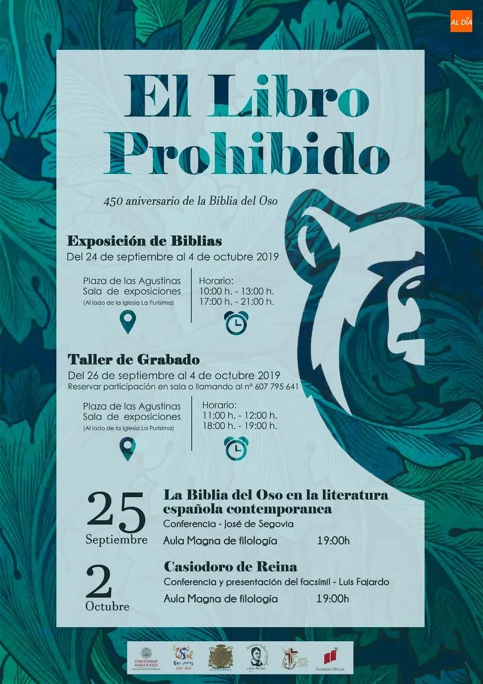 Esta exposición se enmarca dentro de los actos conmemorativos que, con motivo del 450 aniversario de la publicación de la primera traducción completa de la Biblia al castellano desde sus idiomas originales, ha organizado la Facultad de Filología de la Universidad de Salamanca, en colaboración con la Asociación Cultural Evangélica Jorge Borrow de Salamanca. La publicación de la conocida como la Biblia del Oso, en Basilea y el 28 de septiembre de 1569, es la culminación de la labor de toda una vida de Casiodoro de Reina. De esta efeméride se han hecho eco diversas instituciones en todo el mundo hispanohablante, y en España se ha podido inaugurar con la edición de un sello por parte de Correos.