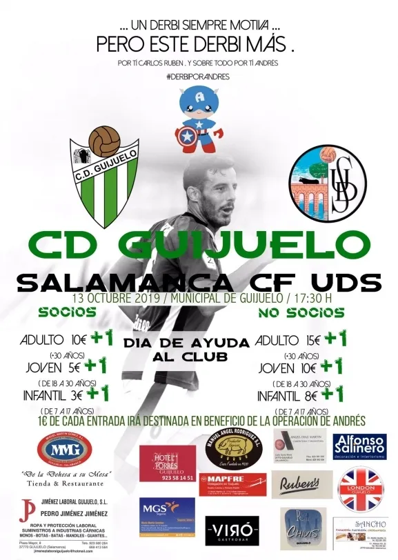El Guijuelo ha hecho oficial los precios de las entradas de cara al próximo derbi charro que disputará el domingo 13 de octubre a las 17:30 horas en el Municipal de Guijuelo frente al Salamanca UDS. El club, que ha decretado dicho partido ?día de ayuda al club?, destinará un euro de cada entrada a la operación de Andrés en una muestra de solidaridad.