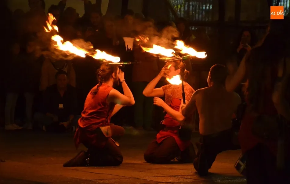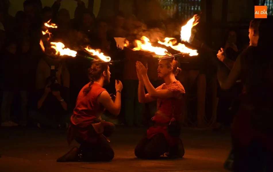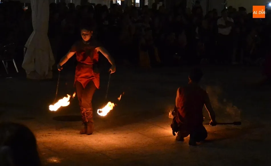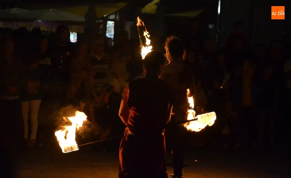Asimismo, el espectáculo contó con un escupefuego permanente, al que se unieron en varios momentos concretos (como por ejemplo en el número final) varios ?secundarios?. Previamente, por cierto, una espectadora tuvo un papel activo en el show al ponerse en medio de dos malabaristas que estaban pasándose mazas con fuego. El público congregado en la Plaza Mayor brindó un largo aplauso a este joven y numeroso grupo llegado de tierras portuguesas.