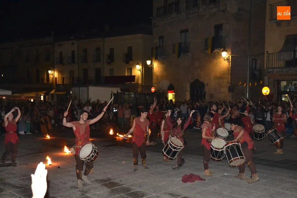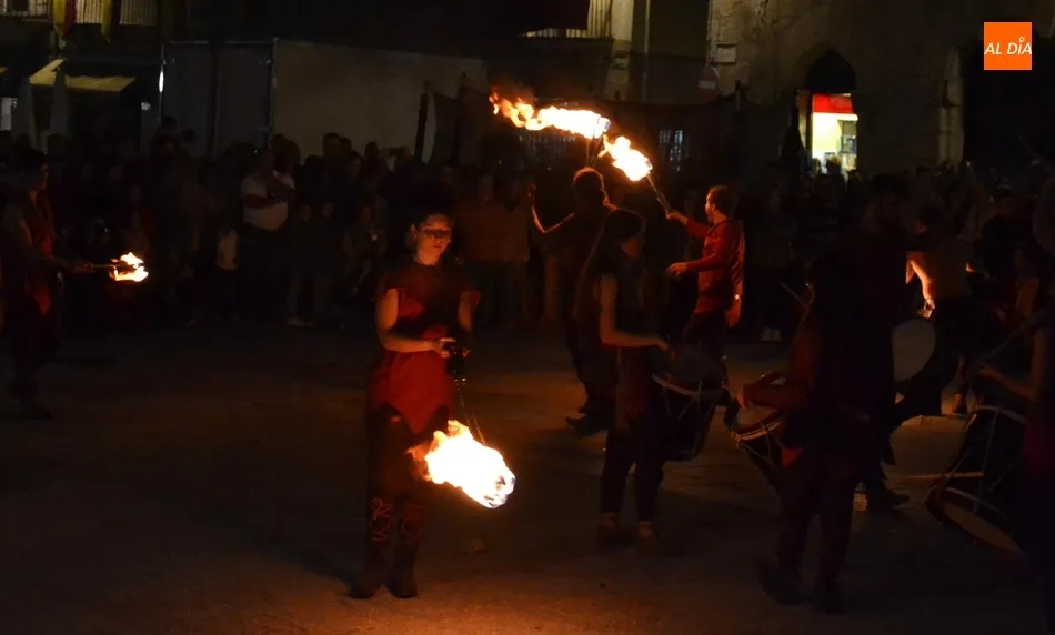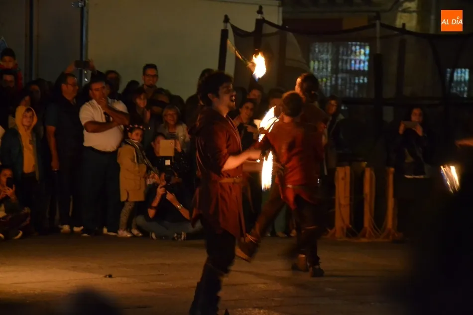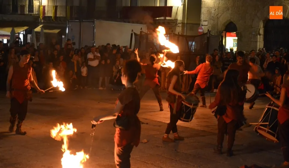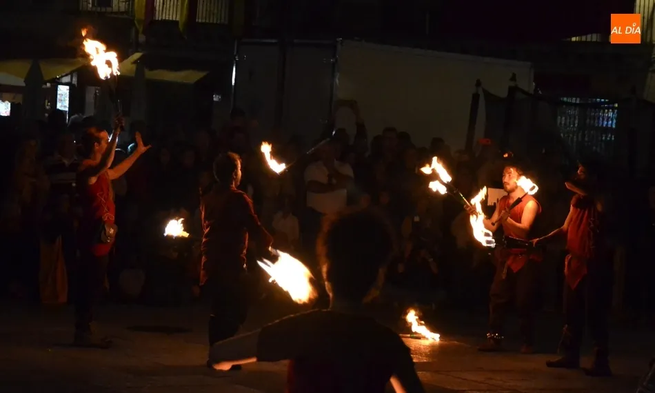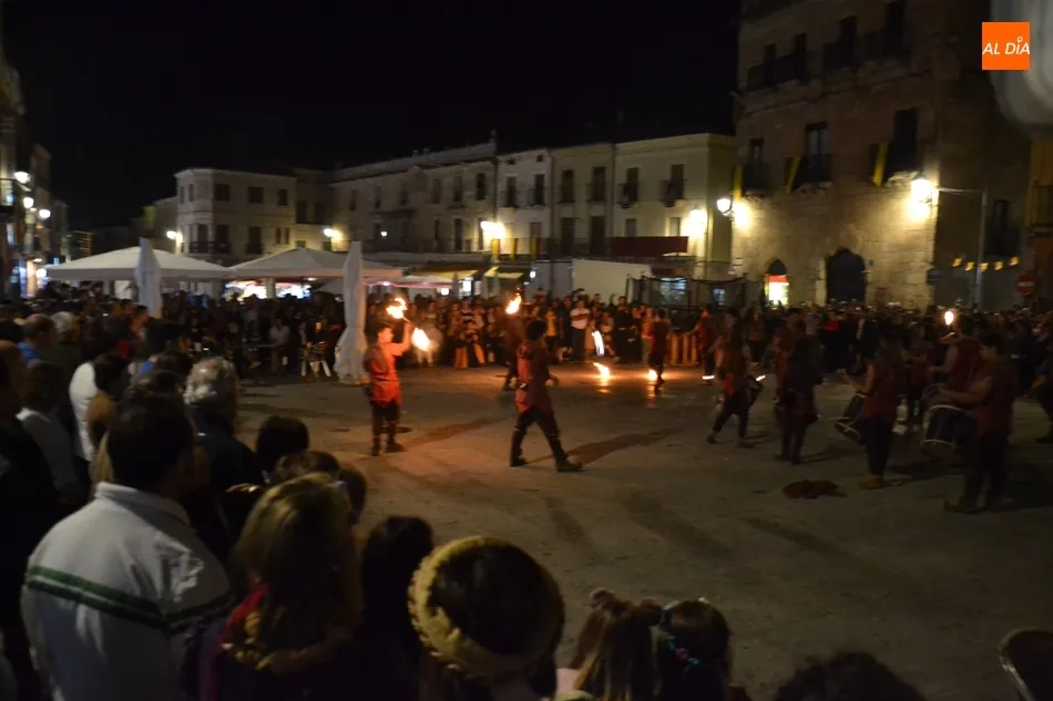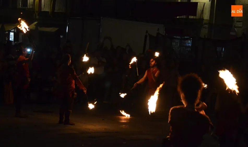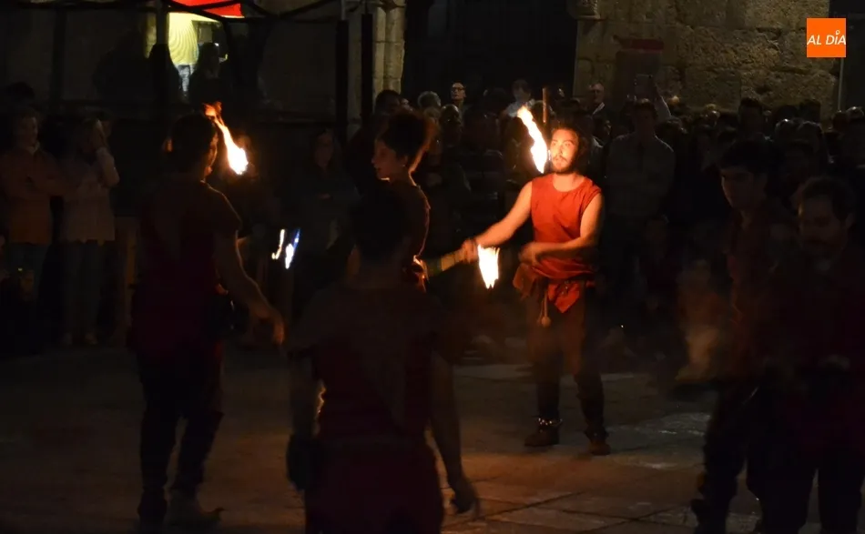 Los primeros protagonistas en el ágora mirobrigense fueron los miembros del grupo de Tambores y malabares Saltimbancos de Santa María, que como el año pasado ofrecieron un espectáculo en el que se combinó la música que vienen ofreciendo durante toda la Feria con el fuego, realizando una serie de malabares con mazas y cariocas especiales.