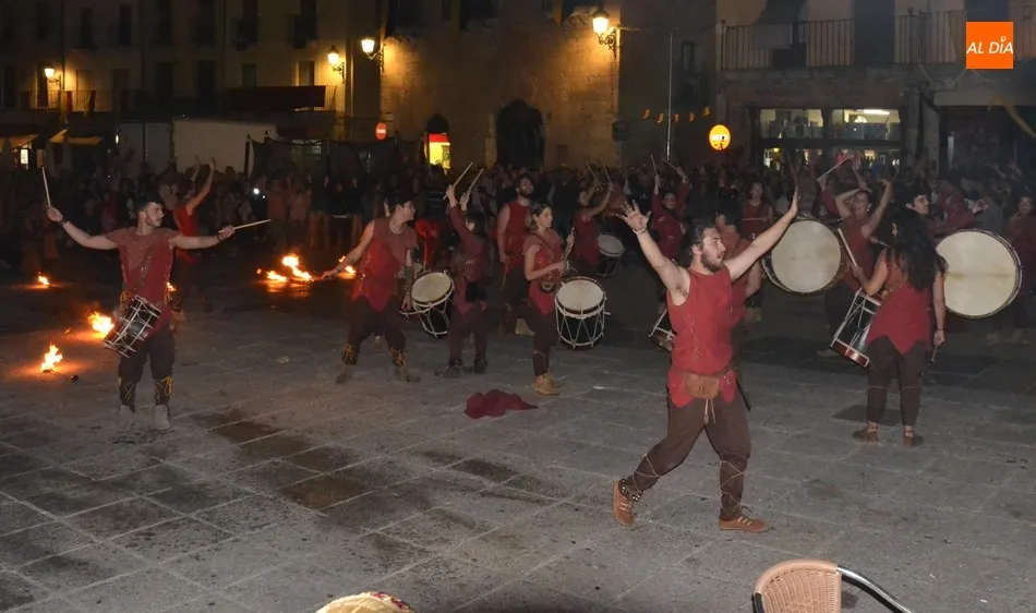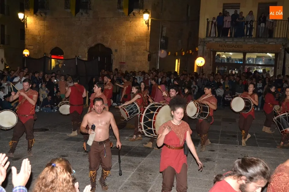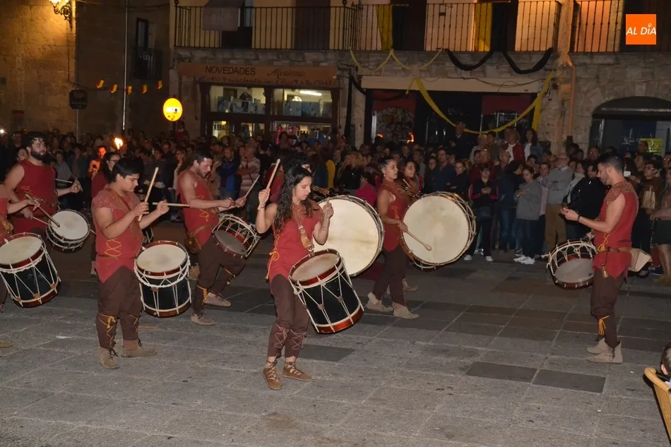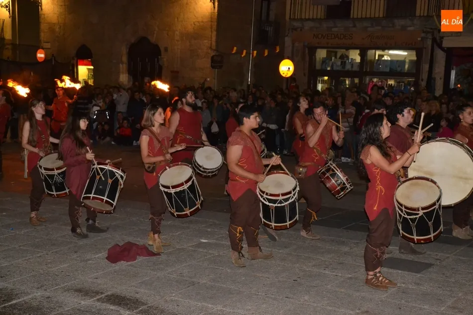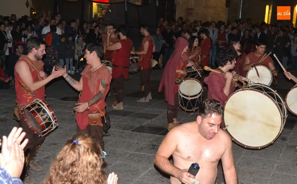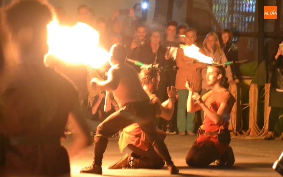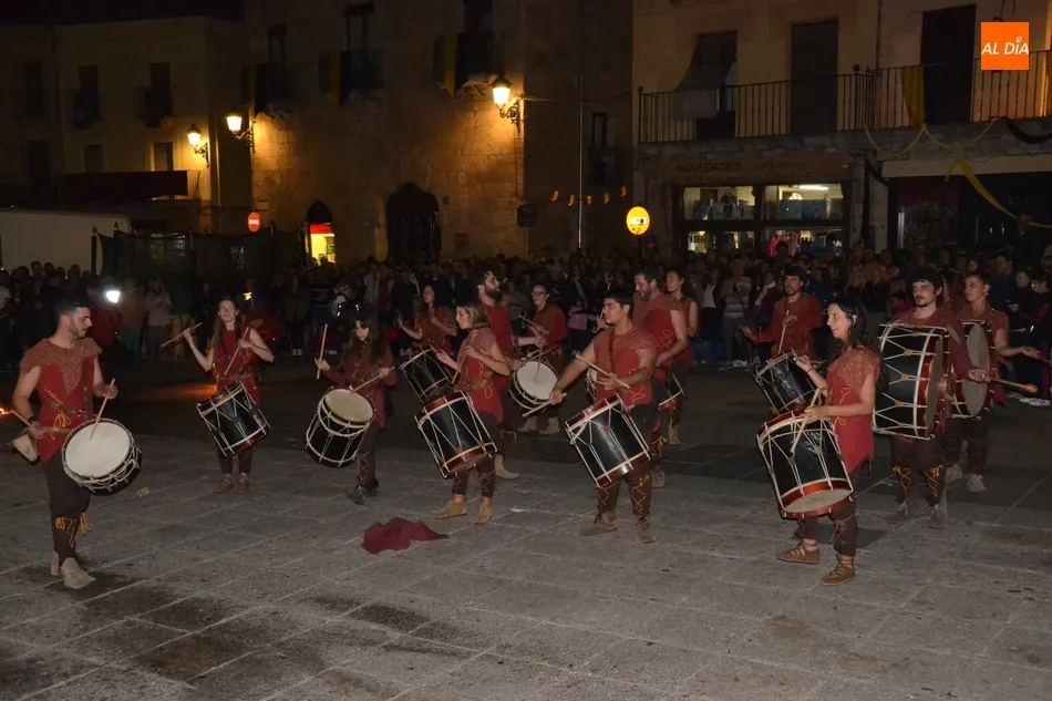 Los primeros protagonistas en el ágora mirobrigense fueron los miembros del grupo de Tambores y malabares Saltimbancos de Santa María, que como el año pasado ofrecieron un espectáculo en el que se combinó la música que vienen ofreciendo durante toda la Feria con el fuego, realizando una serie de malabares con mazas y cariocas especiales.