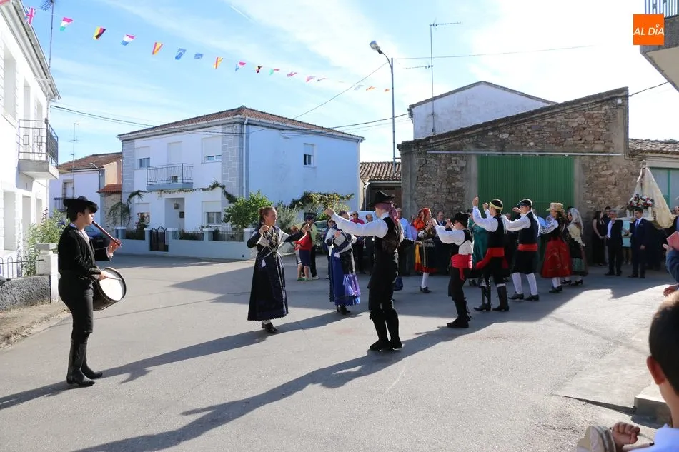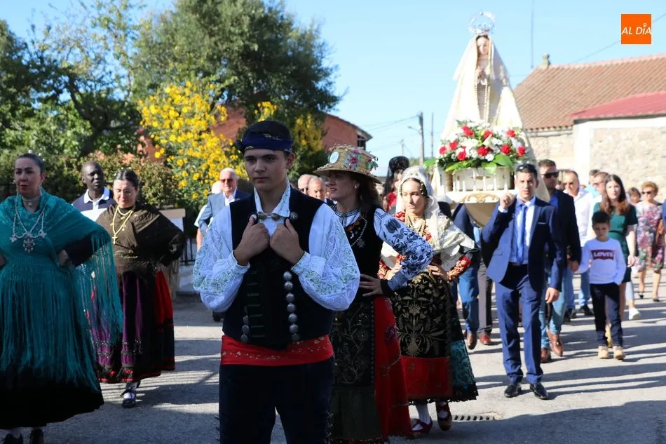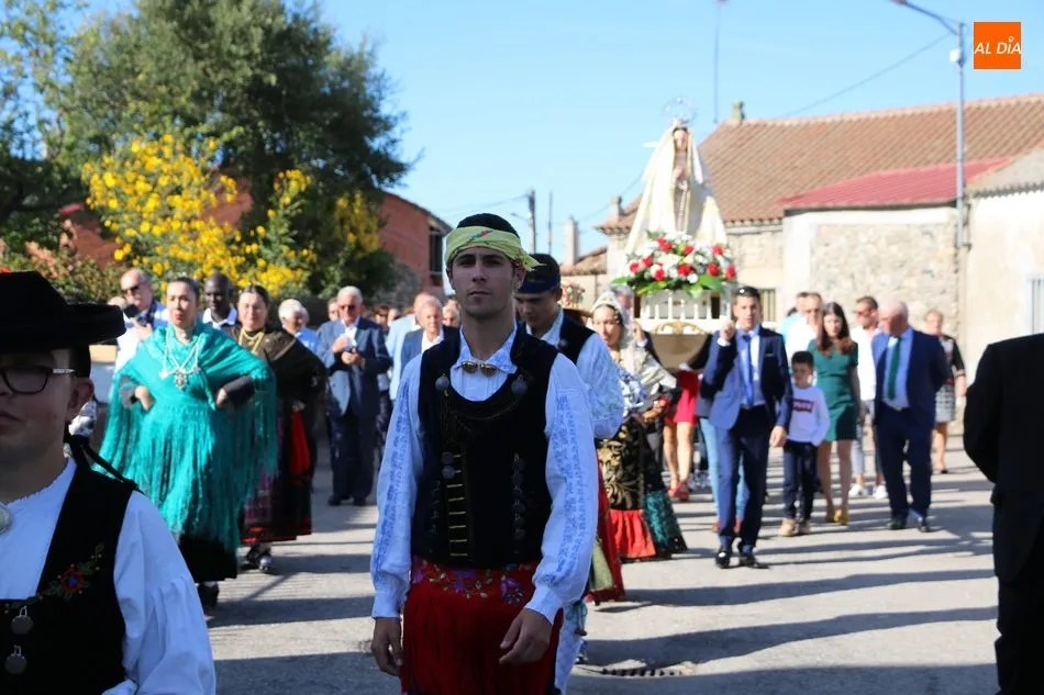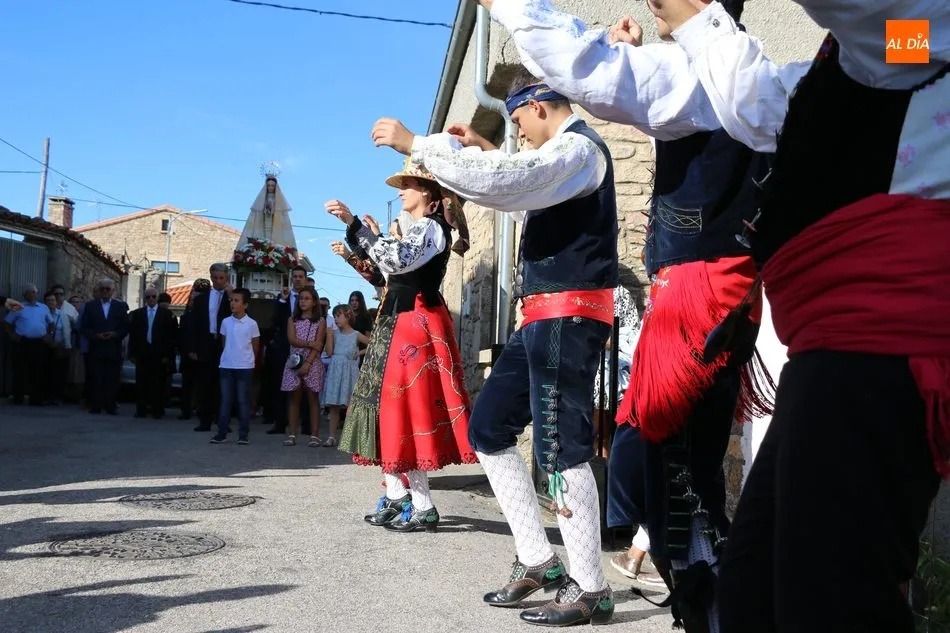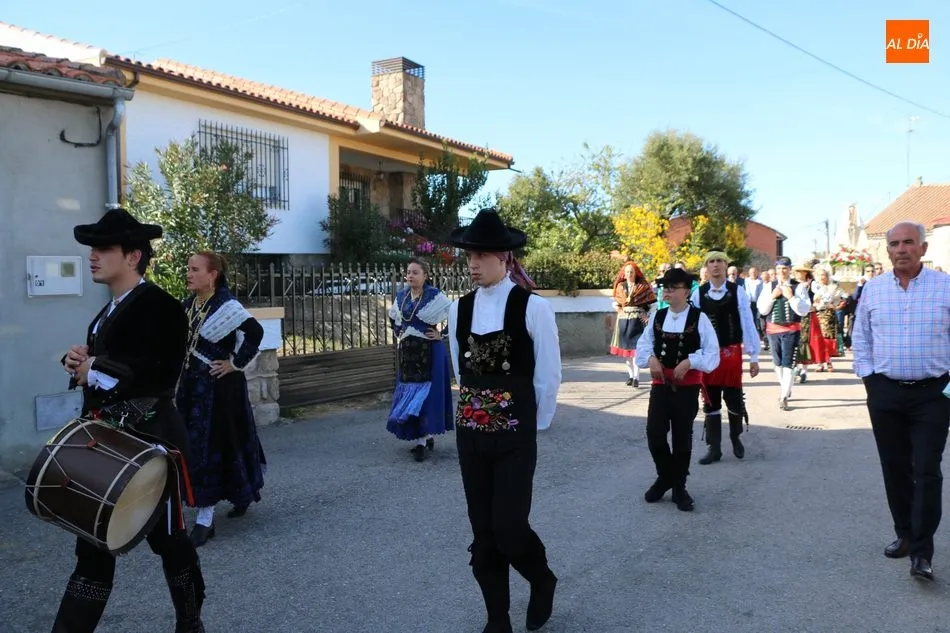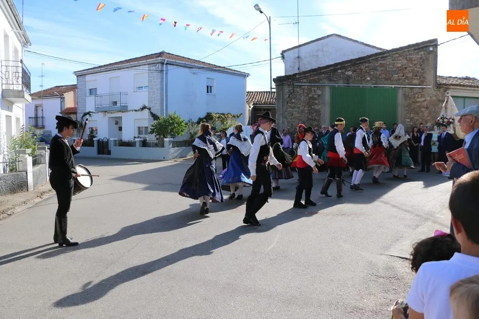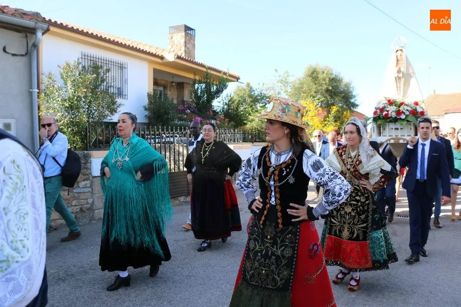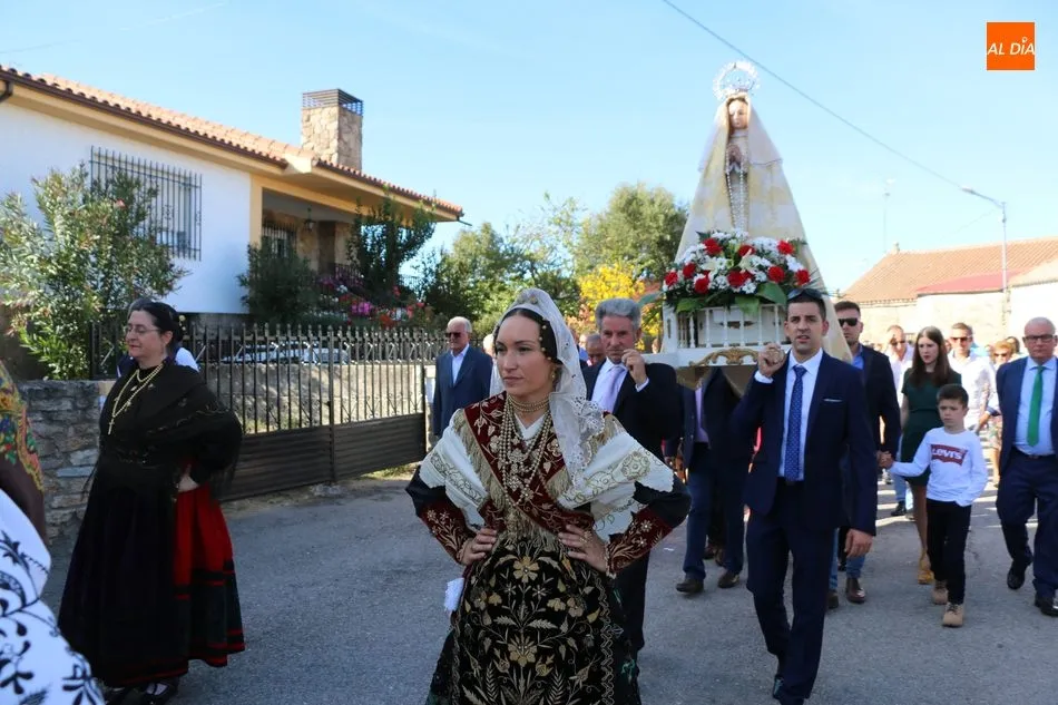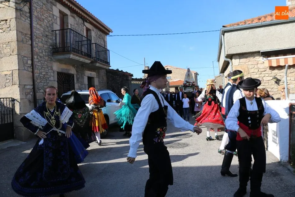 Bajo los sones de la gaita y el tamboril de Ramón Guarido, los vecinos de Valderrodrigo acompañaban a su Madrina, Victoria Vicente Santos, en los actos en honor a la Virgen del Rosario, procesión con rosario que estuvo amenizado por los bailes del grupo de folclore Surco.