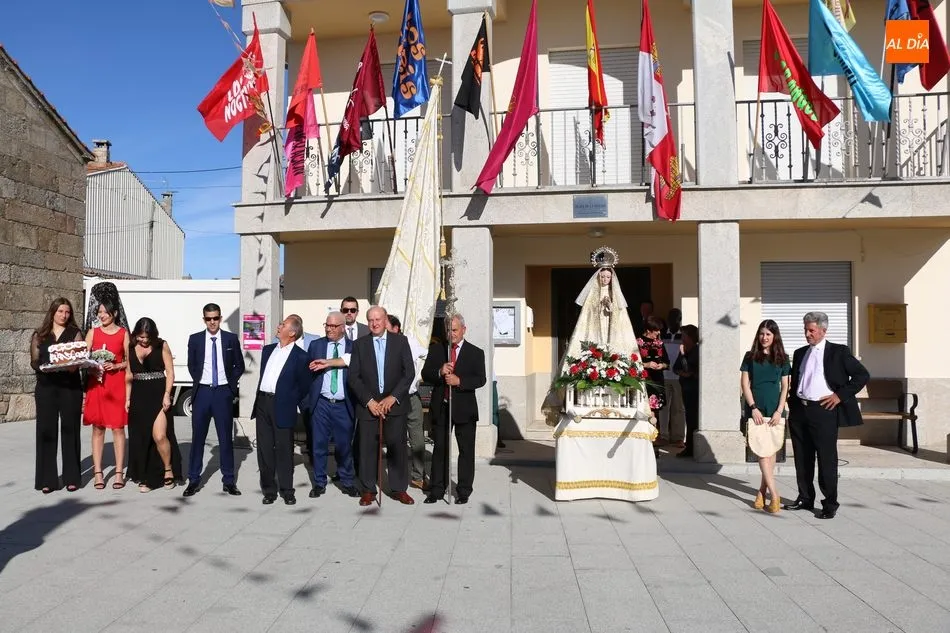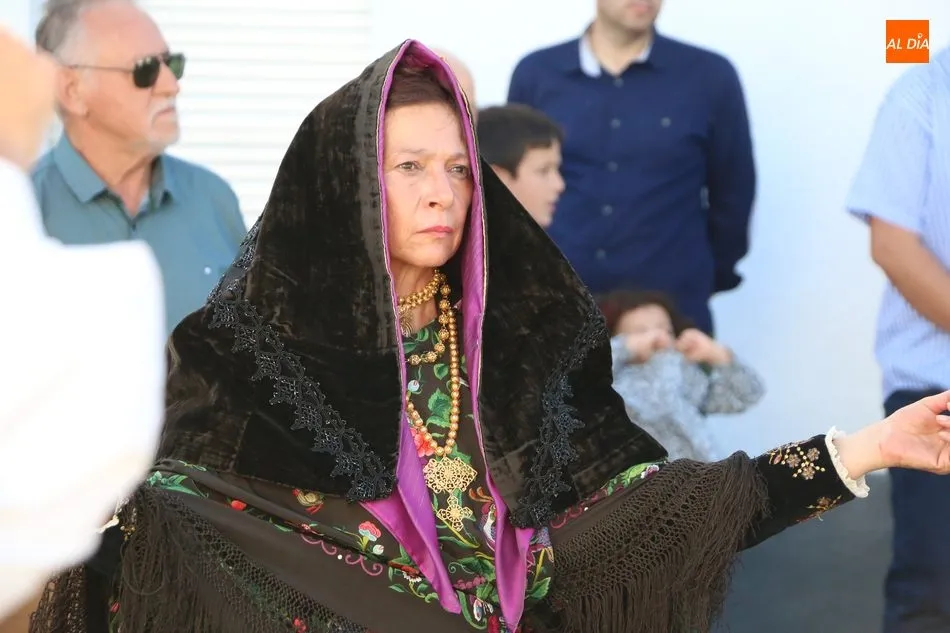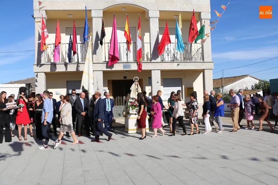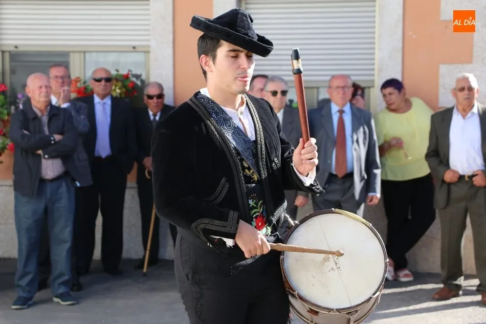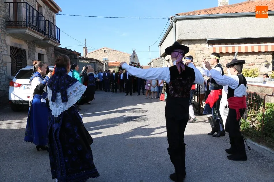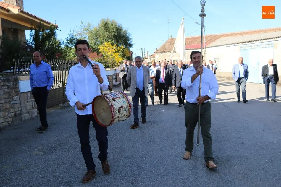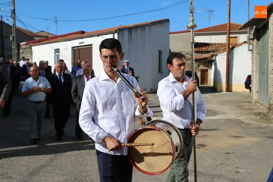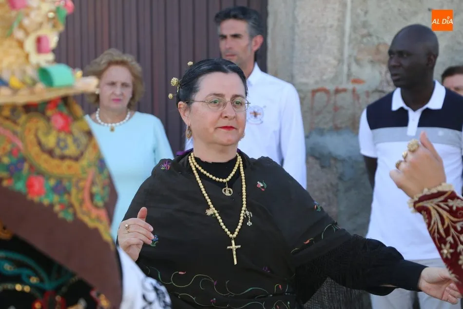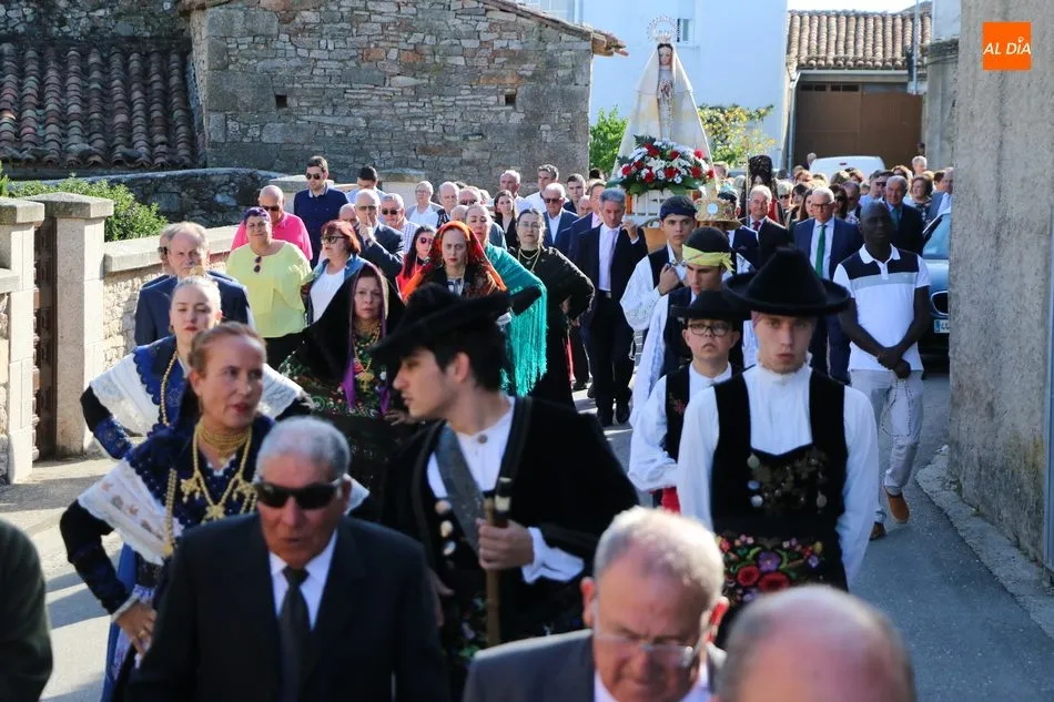 Bajo los sones de la gaita y el tamboril de Ramón Guarido, los vecinos de Valderrodrigo acompañaban a su Madrina, Victoria Vicente Santos, en los actos en honor a la Virgen del Rosario, procesión con rosario que estuvo amenizado por los bailes del grupo de folclore Surco.