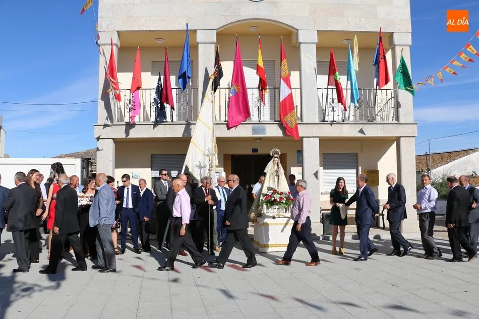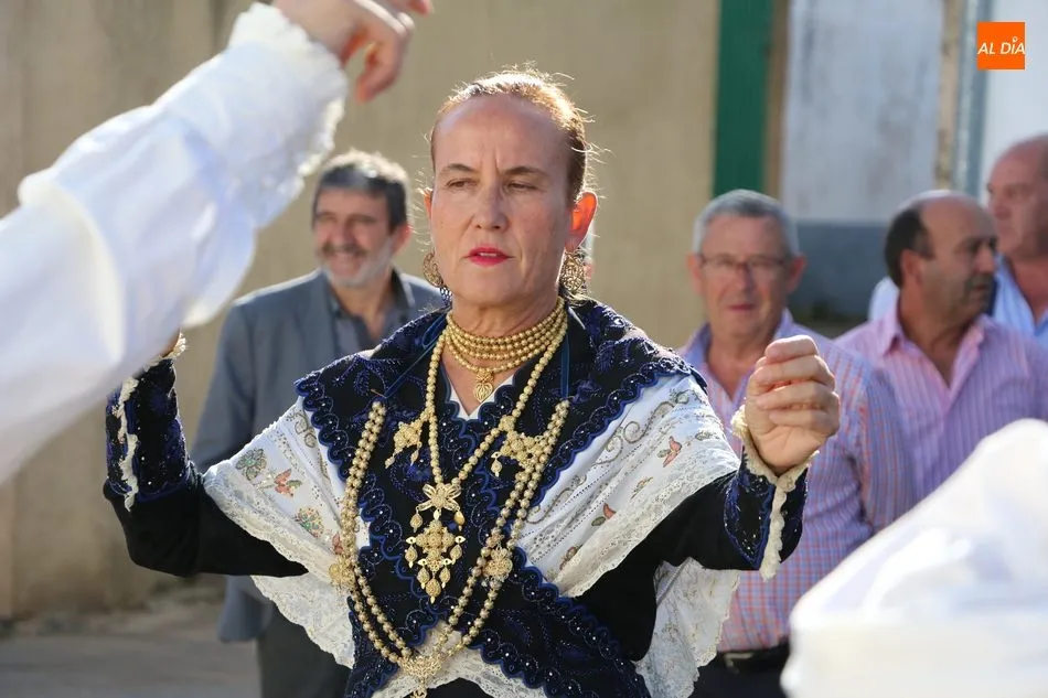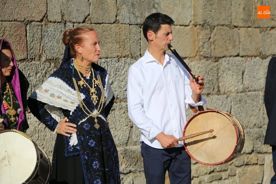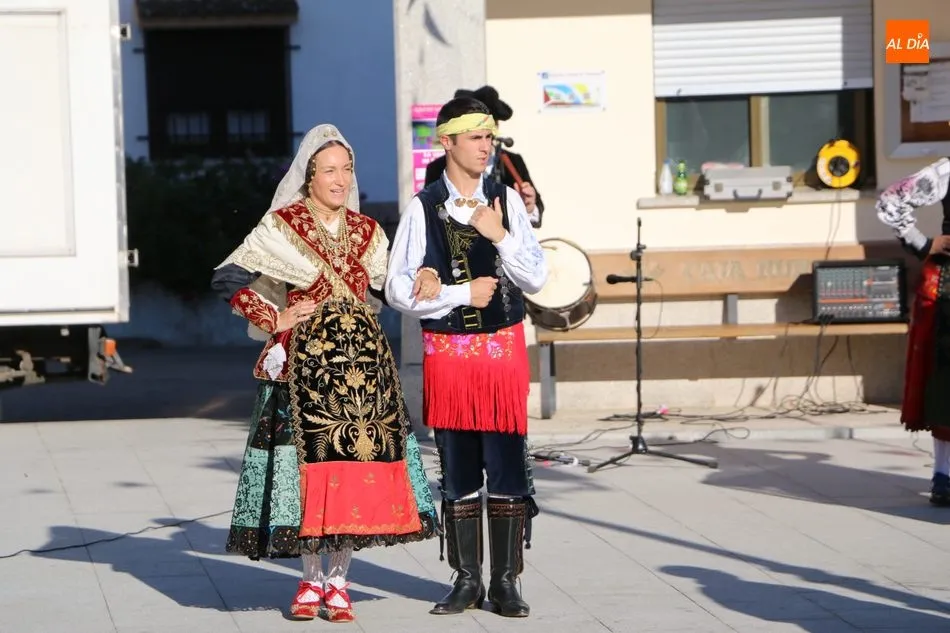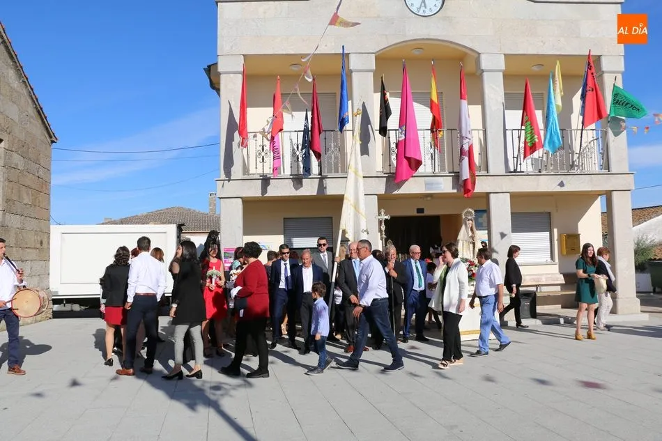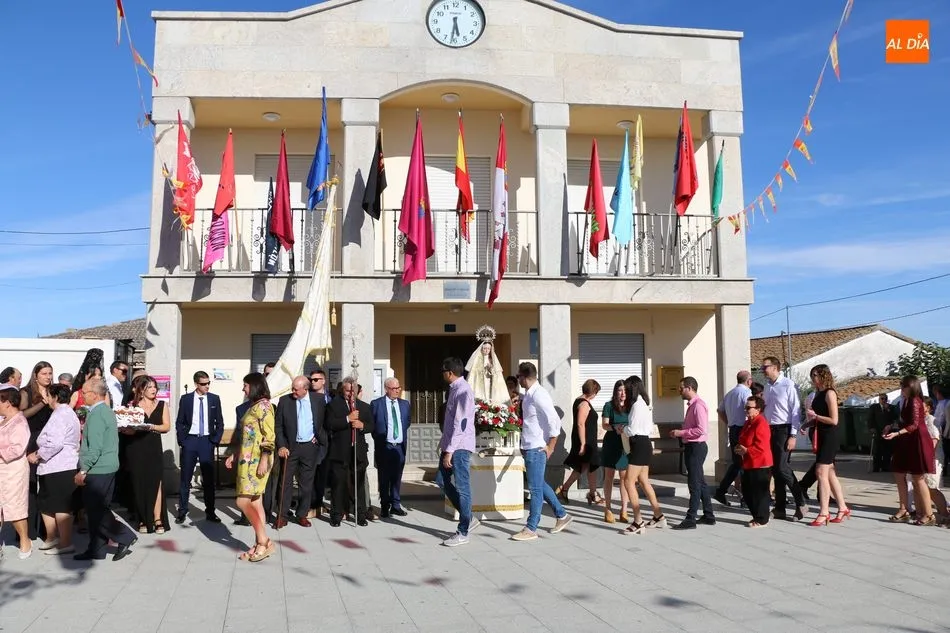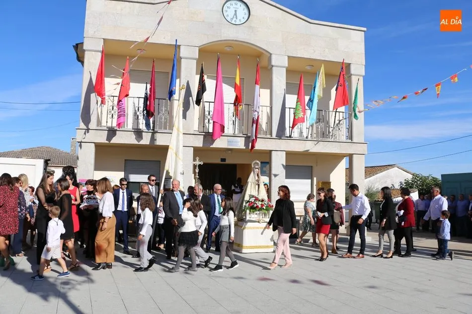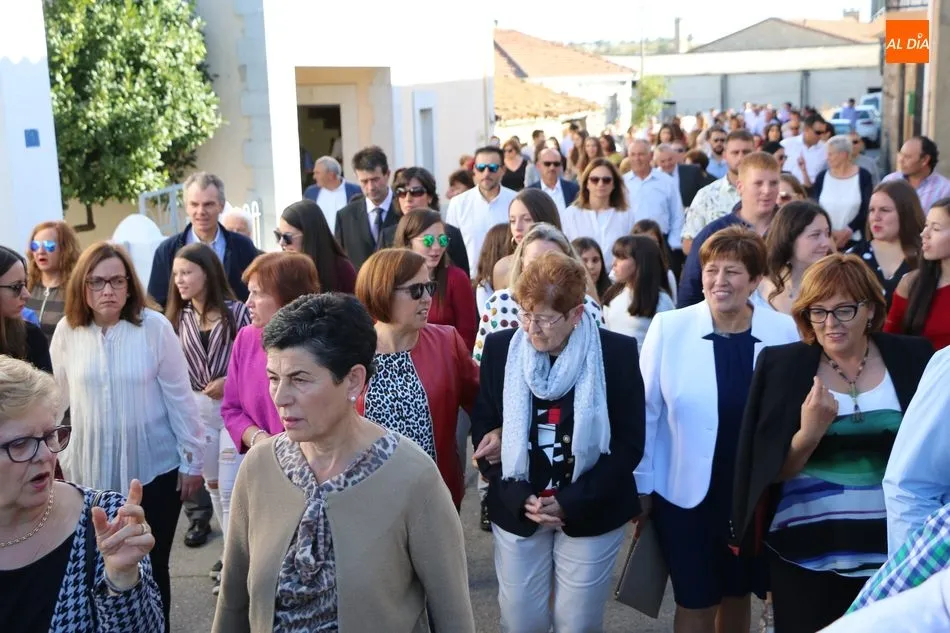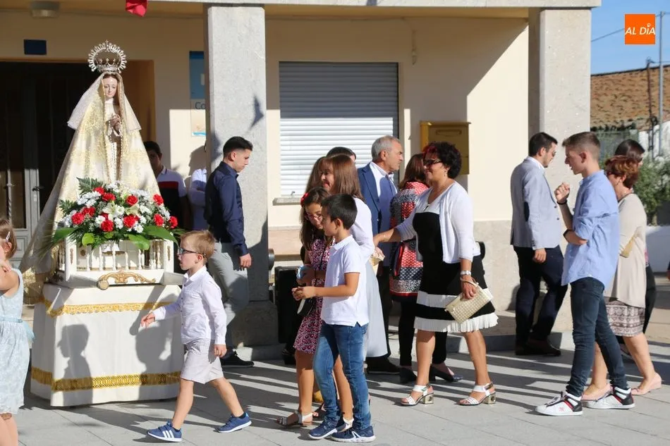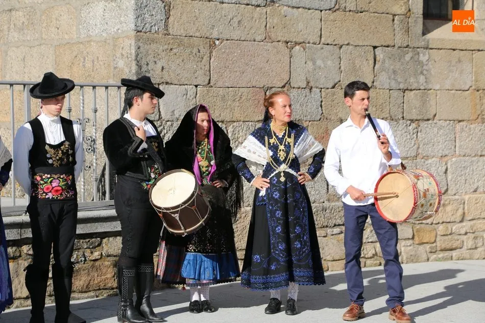 Bajo los sones de la gaita y el tamboril de Ramón Guarido, los vecinos de Valderrodrigo acompañaban a su Madrina, Victoria Vicente Santos, en los actos en honor a la Virgen del Rosario, procesión con rosario que estuvo amenizado por los bailes del grupo de folclore Surco.