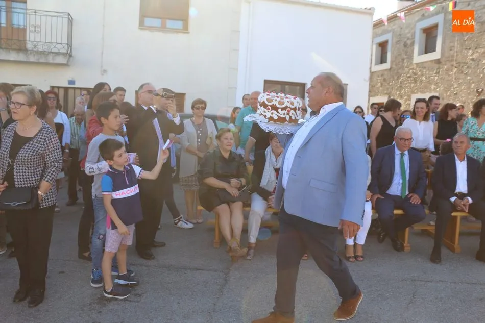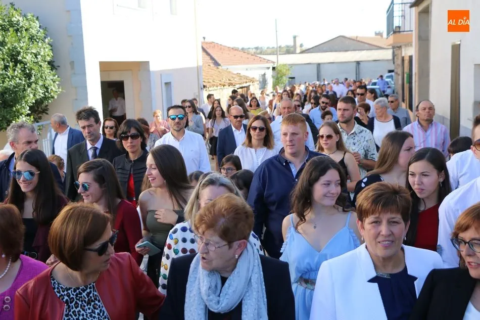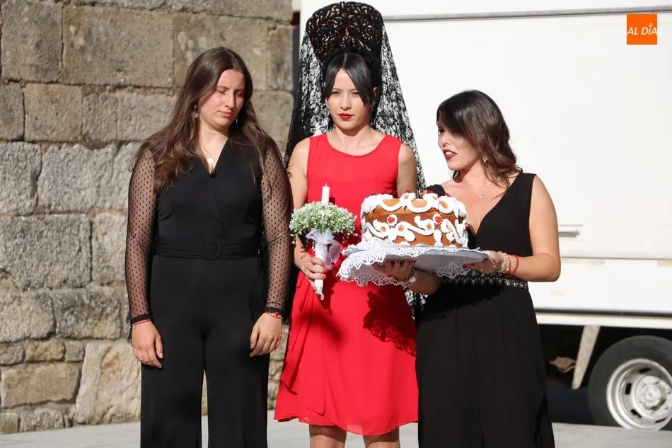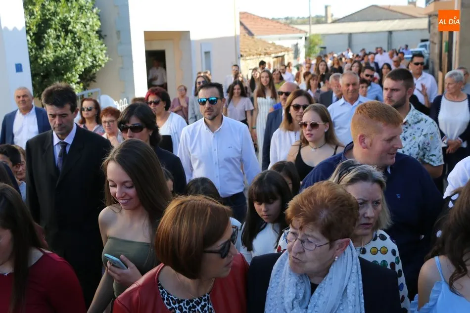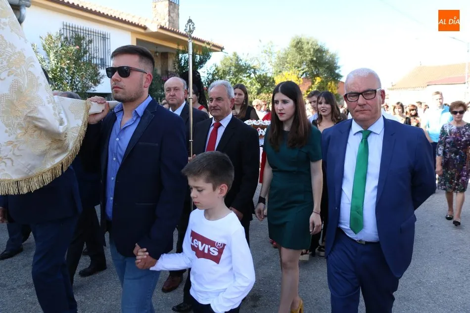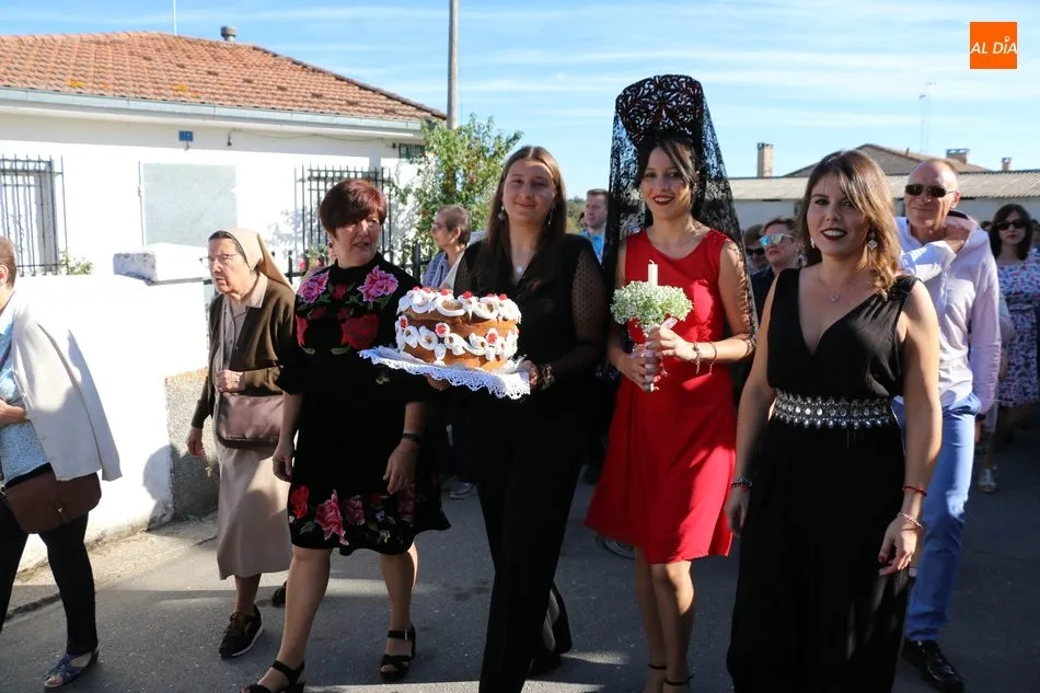 La Virgen del Rosario recorría en procesión las calles de Valderrodrigo seguida de las autoridades locales con el alcalde Eduardo Rodríguez al frente y seguido de la Madrina y sus acompañantes, Elena Vicente Barza y Andrea Vicente Santos, encargadas de portar la rosca.