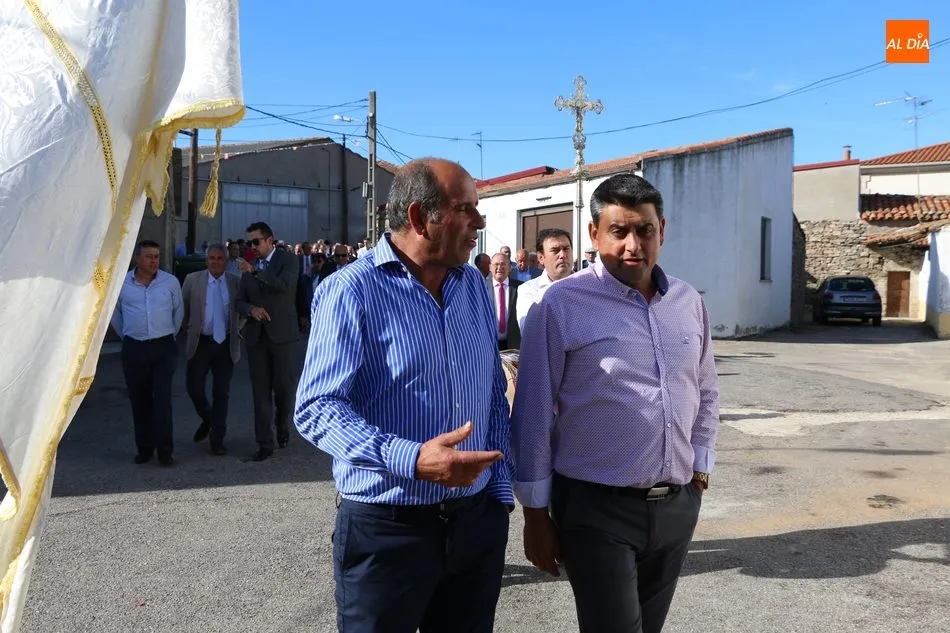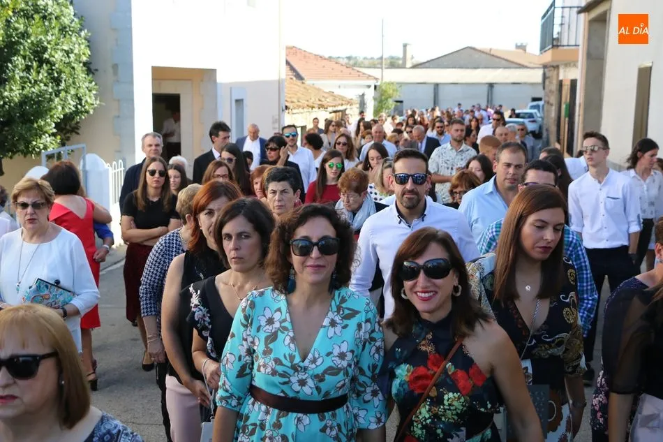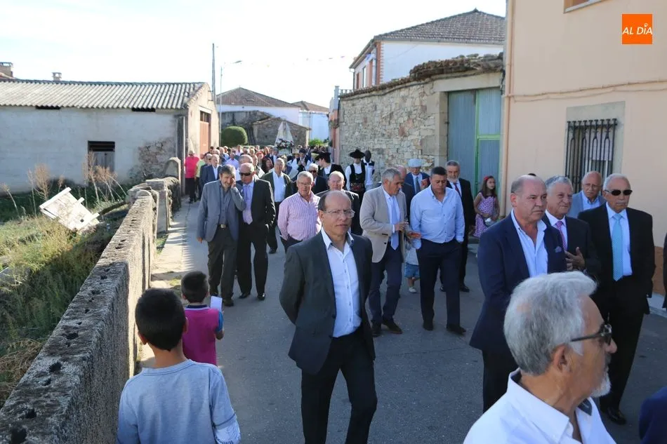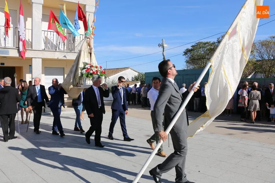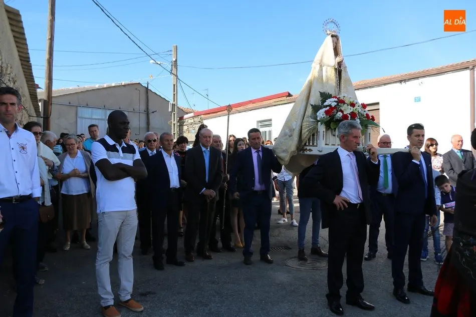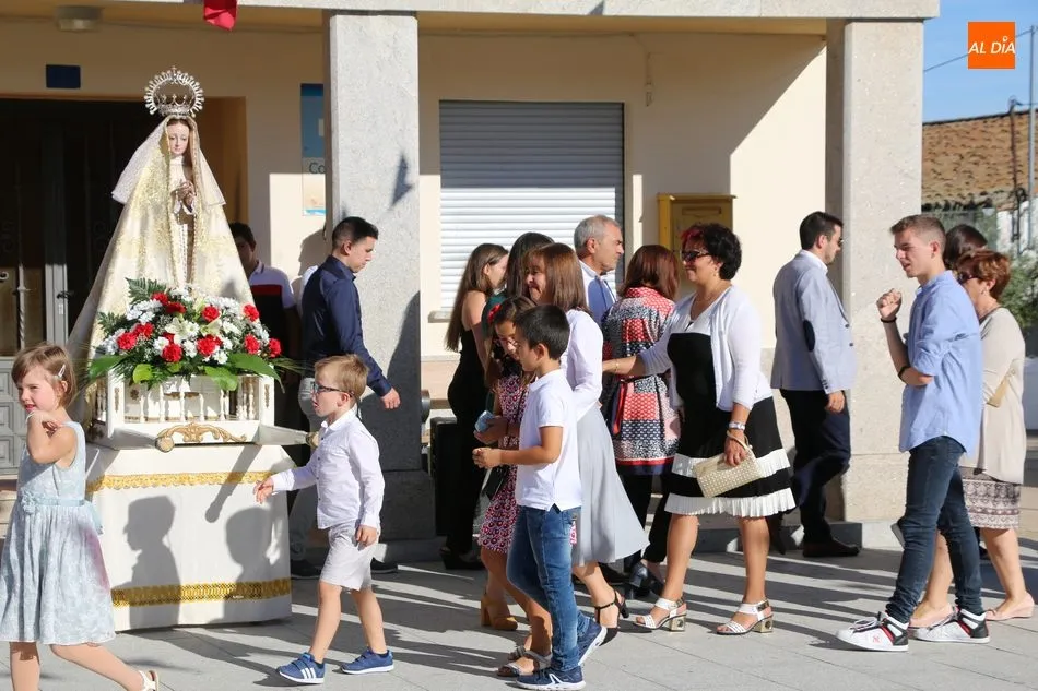 La Virgen del Rosario recorría en procesión las calles de Valderrodrigo seguida de las autoridades locales con el alcalde Eduardo Rodríguez al frente y seguido de la Madrina y sus acompañantes, Elena Vicente Barza y Andrea Vicente Santos, encargadas de portar la rosca.