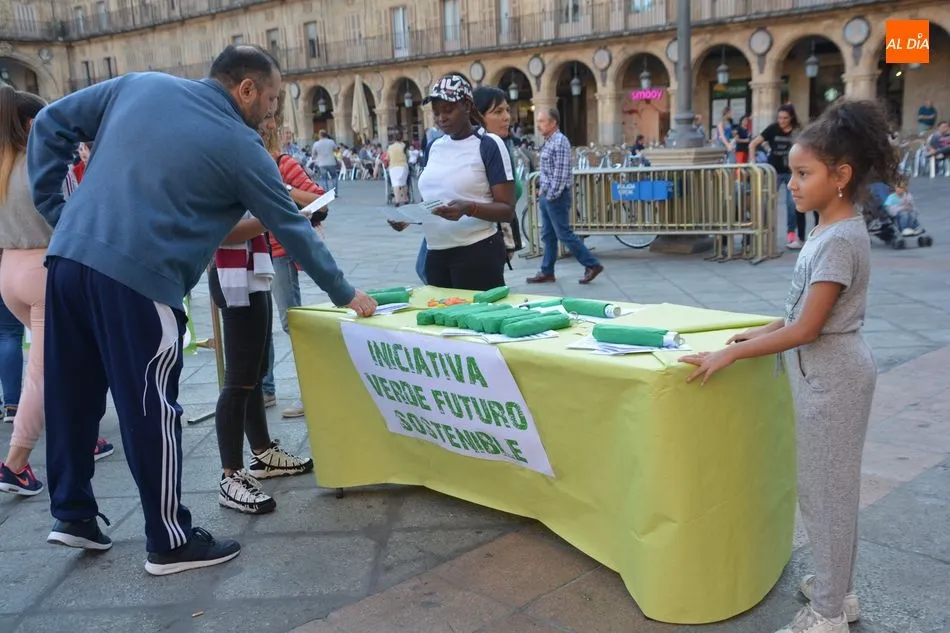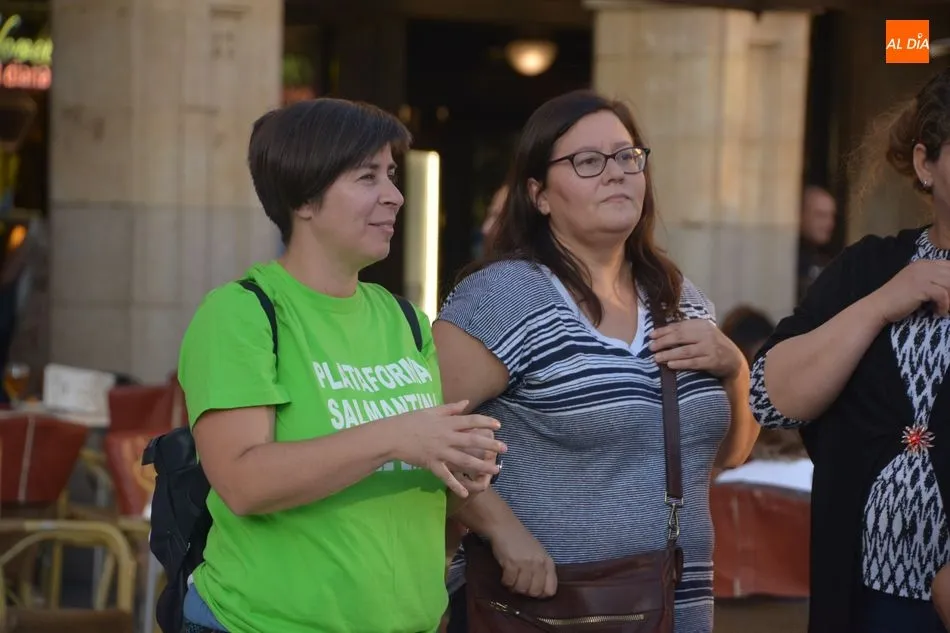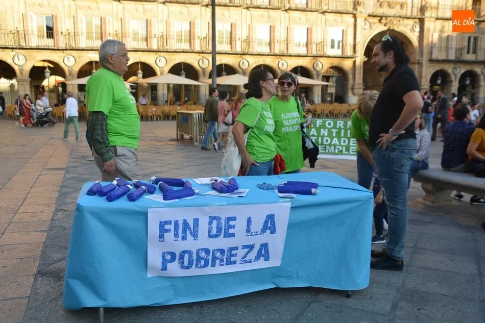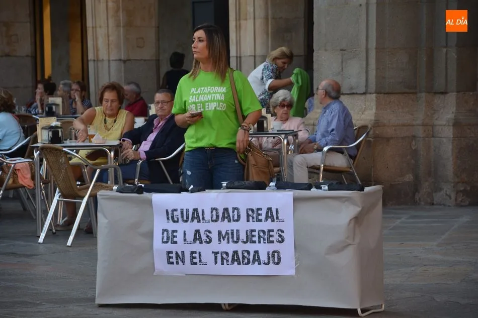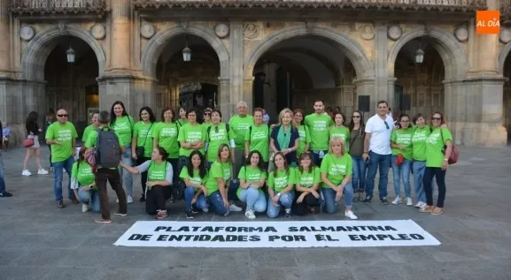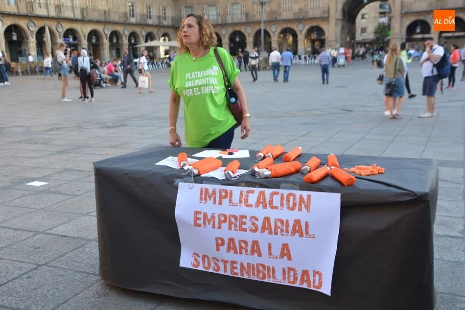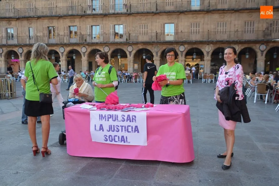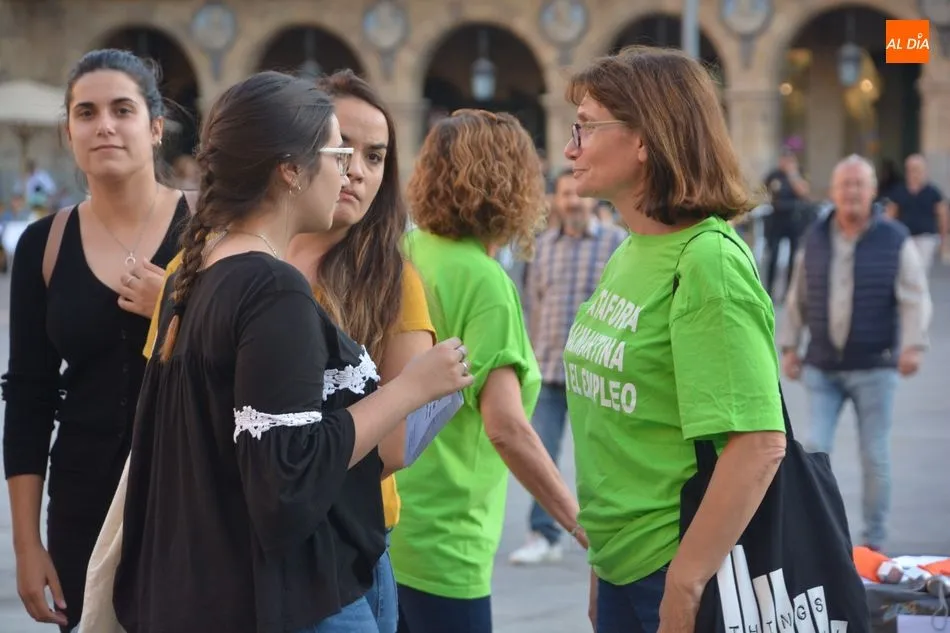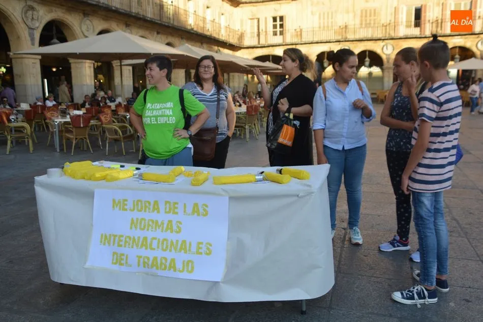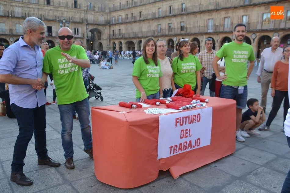 La Plataforma Salmantina por el Empleo organizó esta tarde un acto en plena Plaza Mayor de Salamanca para reivindicar el trabajo digno. Dicha plataforma, en su trabajo en pos de la integración laboral de los colectivos vulnerables, aúna el trabajo en red de una veintena entidades.