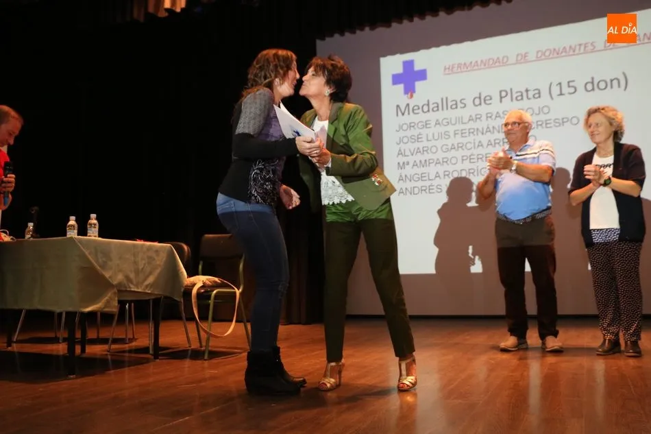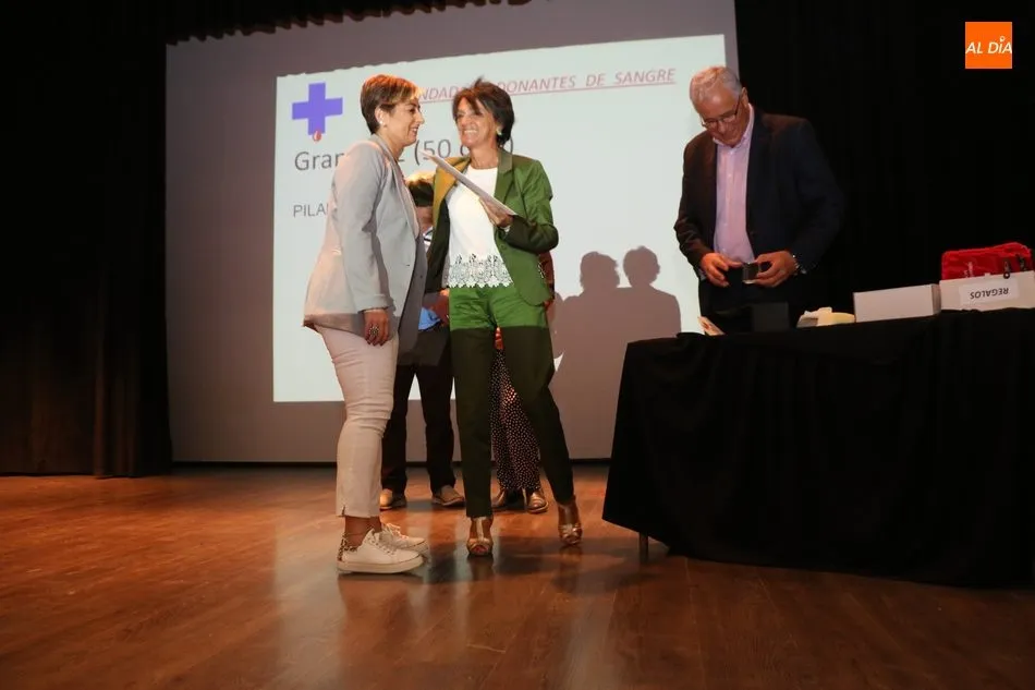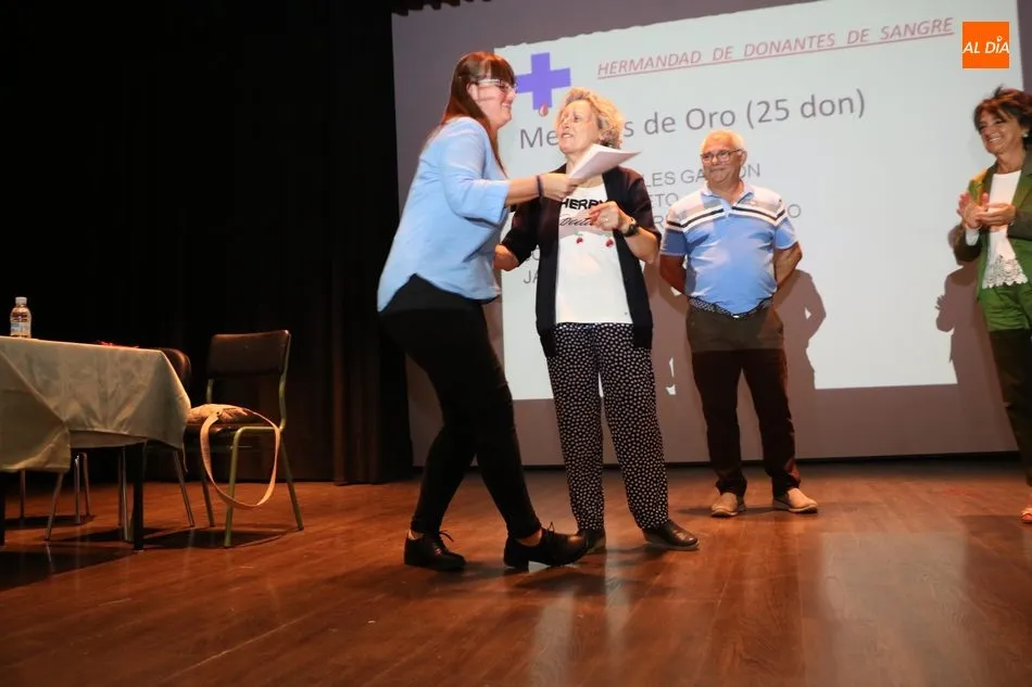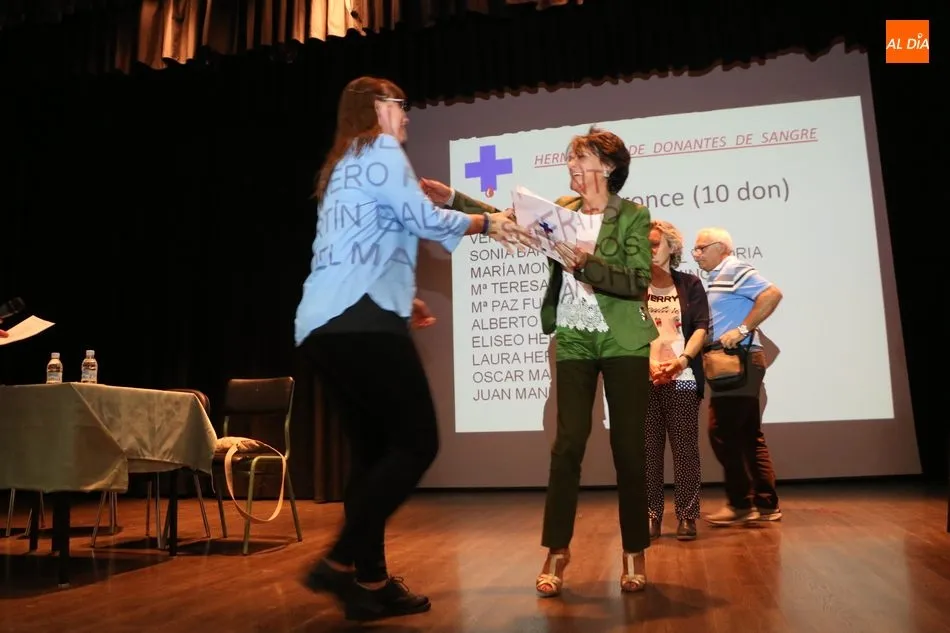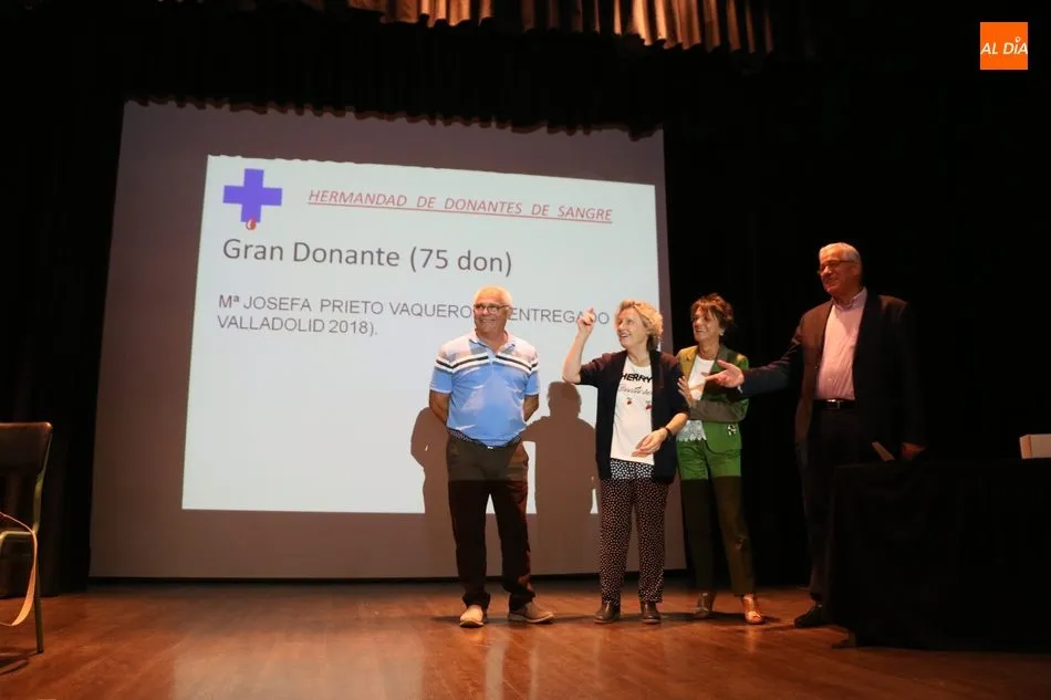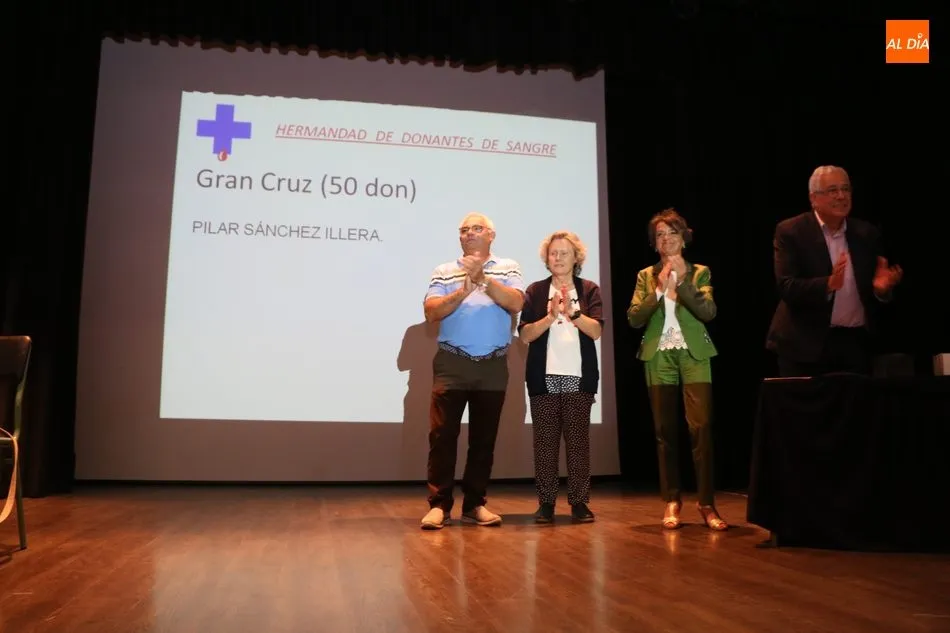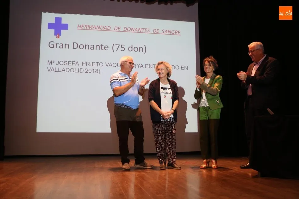 María Josefa Prieto Vaquero recibió un aplauso de los asistentes en reconocimiento a sus 75 donaciones alcanzando el distintivo de Gran Donante, y Pilar Sánchez Illera recibió la Gran Cruz de la Hermandad