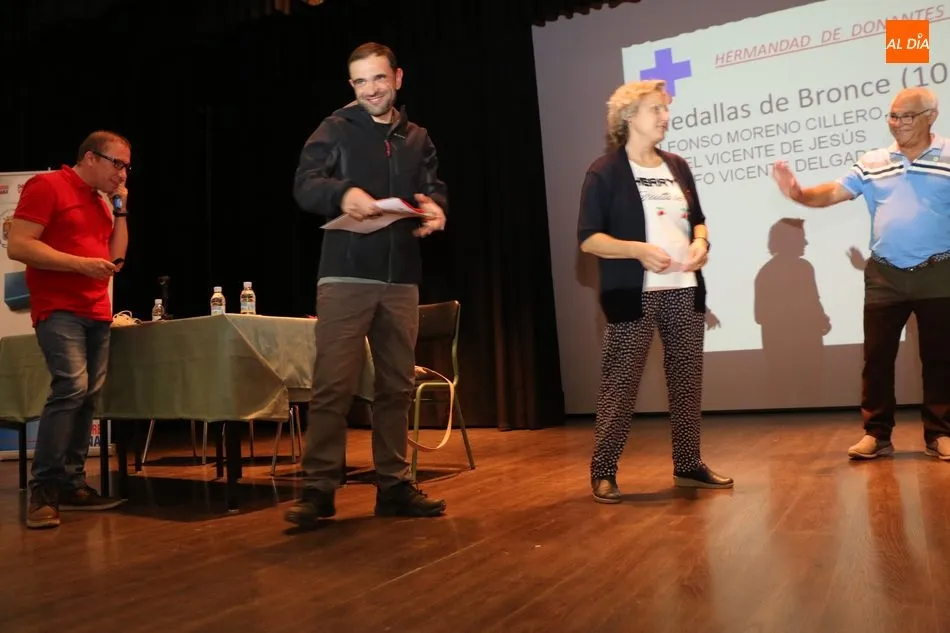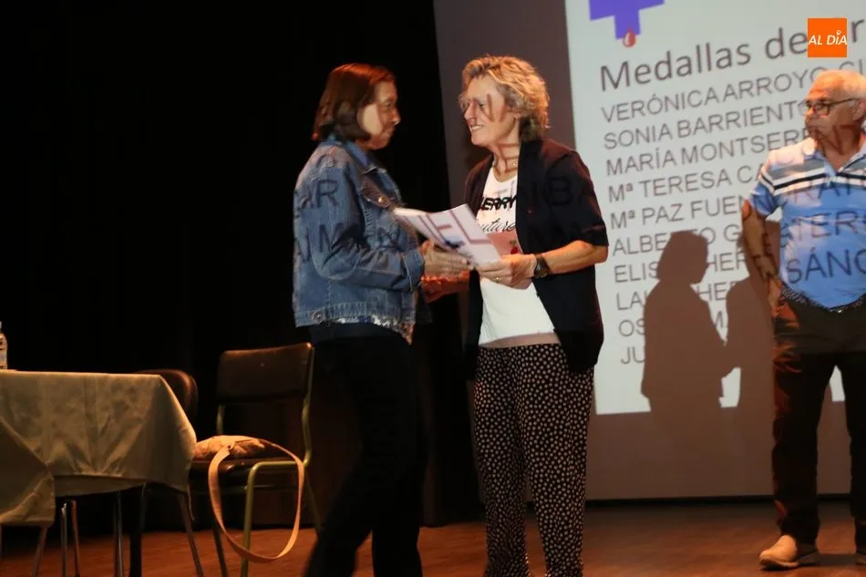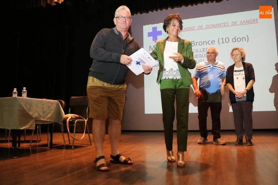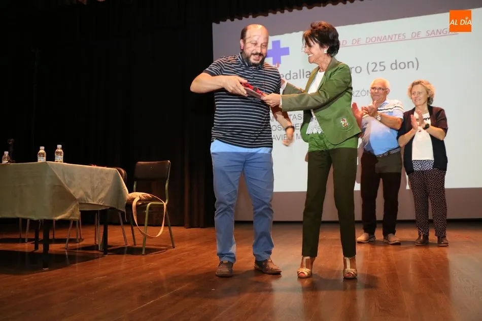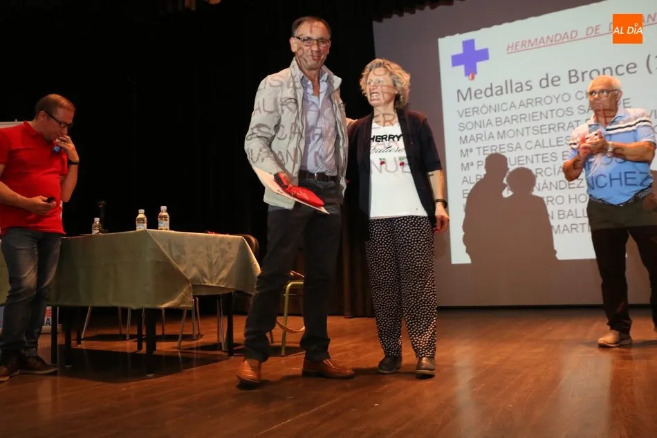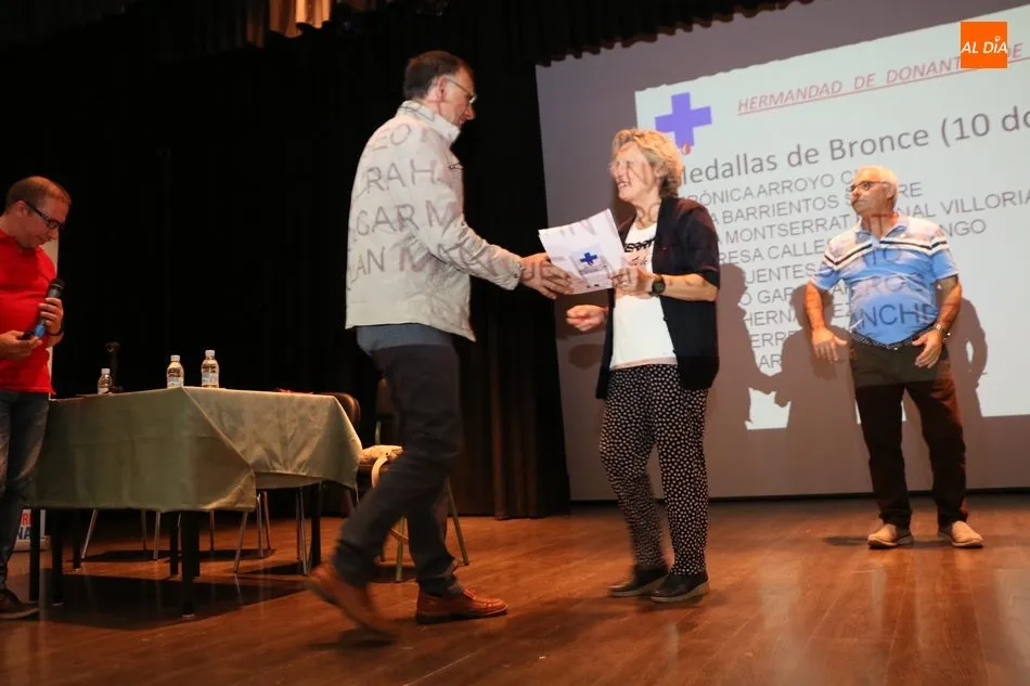 La Hermandad de Donantes de Sangre de Salamanca hizo entrega este jueves en Vitigudino de 25 medallas a las personas que han alcanzado distinto número de donaciones en el último año, 10 en el caso de las medallas de bronce, 15 las de plata, 25 las de oro y 50 donaciones para la Gran Cruz, distinción que fue para Pilar Sánchez Illera y que recibió de manos del presidente de la Hermandad, José Luis Martín Aguado.