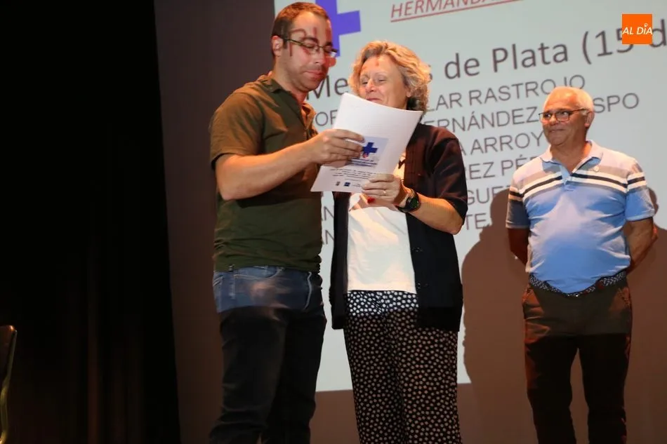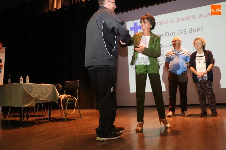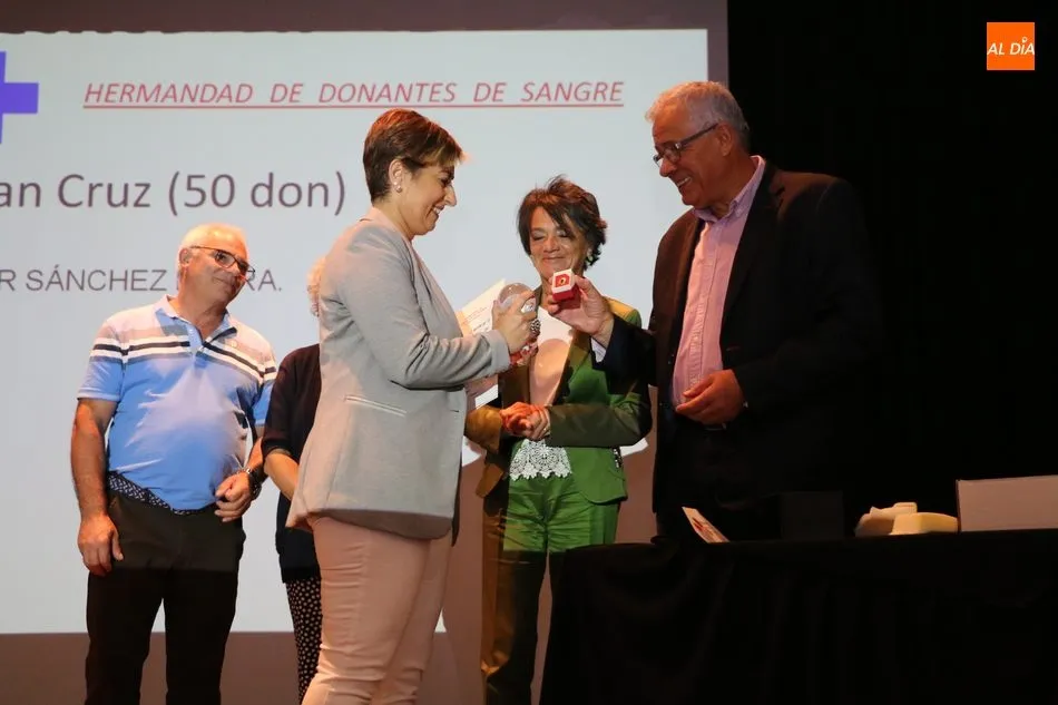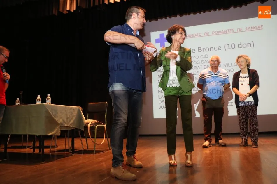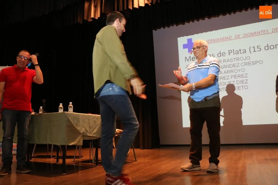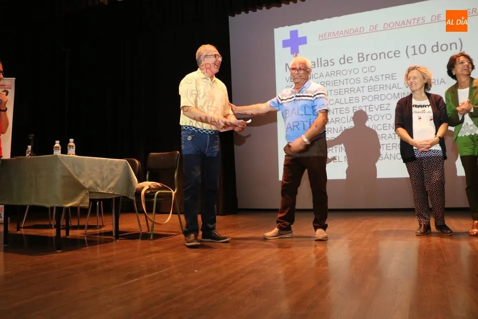 La Hermandad de Donantes de Sangre de Salamanca hizo entrega este jueves en Vitigudino de 25 medallas a las personas que han alcanzado distinto número de donaciones en el último año, 10 en el caso de las medallas de bronce, 15 las de plata, 25 las de oro y 50 donaciones para la Gran Cruz, distinción que fue para Pilar Sánchez Illera y que recibió de manos del presidente de la Hermandad, José Luis Martín Aguado.