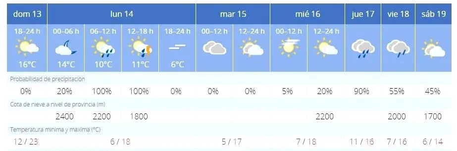 Las precipitaciones podrán ser localmente fuertes o persistentes en Galicia, oeste de la Cantábrica, oeste del sistema Central y de Pirineos, donde podrían caer algunos copos de nieve a partir de lo 2.000 metros.