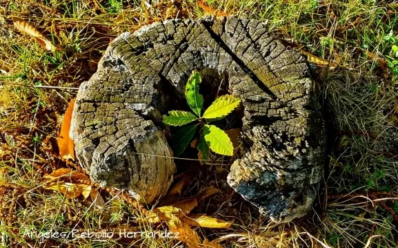 La protección de lo redondo y la matriz del círculo. El viejo tronco cobija en sus estancias a ese árbol niño que asoma hacia la luz y perderá sus hojas, tan hermosas ahora, para dormir el sueño del invierno.